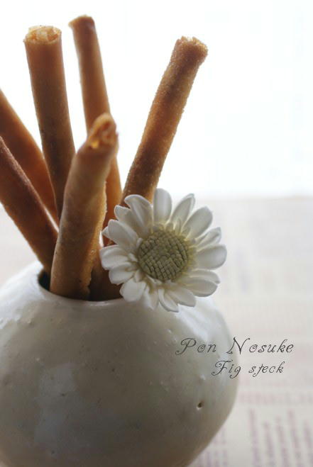 シュガークラフトとイチジクのスティックバー(材料6本)<イチジクのスティックバー>春巻き…3枚 イチジク…50g 胡桃…10g 生クリーム…13gg 練乳…13g ブランデー…少々 シナモン…適量 <シュガーのガーベラ>シュガーペースト…50g レモン汁…1g 抹茶…少々 ~♪♪♪~ <イチジクのスティックバー>イチジクは細かく切って、生クリーム、練乳とともに鍋に入れ汁気が無くなるまで煮、細かく刻んだ胡桃を加え、ブランデー、シナモンで味を調え、縦半分に切った春巻きで巻き、中温油で揚げる <シュガーのガーベラ>シュガーペーストとレモン汁を合わせ、練り混ぜ、花弁を作る。おしべの部分は抹茶をプラスし、丸くして、漉し器の網で模様をつける