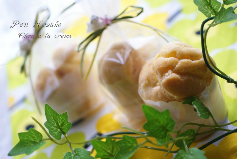 ひとくちサイズのちっちゃなシュー(材料約10コ分) <シュー皮>バター…25g 水…30g 薄力粉…25g 卵…1コ(L~) <カスタードクリーム>卵黄…1コ分 砂糖…15g コーンスターチ…5g 薄力粉…3g 牛乳…100cc <クレーム・シャンティ>生クリーム…50cc 砂糖…5g ~♪♪♪~ <シュー皮> 鍋にバターと水を入れ火にかけ、バターが溶けたらふるった薄力粉を一度に加え、鍋肌がみえるようになるまでかき混ぜ、火からおろし、卵を少しずつ加える。 丸型の口金をつけた絞り袋でφ2cmに絞りだし、210℃のオーブンで10分、180℃に下げて10分焼く。 <カスタードクリーム>鍋に、砂糖、コーンスターチ、薄力粉を、牛乳で 溶かし混ぜ、粉類が溶けたら卵黄を加え混ぜ、とろみがつくまで火にかける