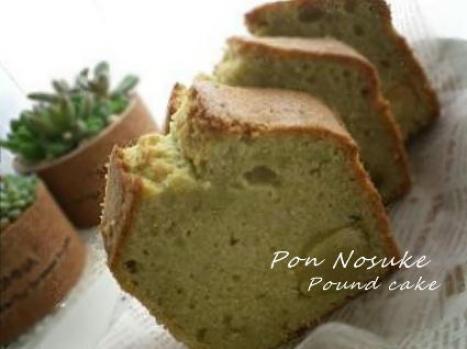 抹茶のパウンドケーキ(材料) バター…100g マジパン…25g 薄力粉…100g ベーキングパウダー…1g 卵白…2コ分 卵黄…2コ分 グリーンティ…14g 生クリーム…20g グラニュー糖…60g 練乳…10g ブランデー…少々 栗の甘露煮…8コ ~♪♪♪~ 1.室温に戻したバター、ローマジパンにグラニュー糖半分を入れ、滑らかに丸まで混ぜ、卵黄を少しずつ加え練乳、生クリームを入れそのつどかき混ぜるる。 2.卵白を泡立て、途中でグラニュー糖を加え、固いメレンゲにする。 3.1に2半分を入れ混ぜ、ベーキングパウダーとグリーンティを加えふるった薄力粉を入れ混ぜ、残りのメレンゲを混ぜる。 5.半分型に流して栗を並べ残りを流し入れ、180℃のオーブンで約40分焼く。