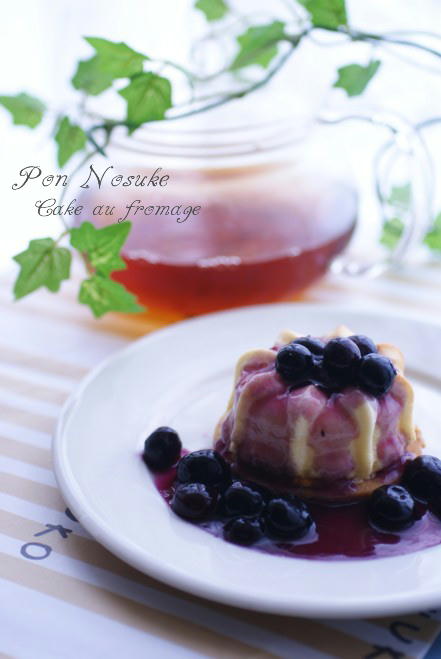 ブルーベリーフェミニンチーズ(材料6コ分) <パート・シュクレ>薄力粉…130g 強力粉…130g バター…150g グラニュー糖…80g 卵黄…1コ分 牛乳17g レモンの皮すりおろし…1/2コ分 <チーズクリーム>クリームチーズ…200g 卵黄…2コ分 卵白…1コ分 グラニュー糖…30g 薄力粉コ…8g コーンスターチ…8g レモン汁…5g レモンの皮…少々 ヨーグルト…50g <ブルーベリーソース(2プレート分)>ブルーベリー…カップ1/2 砂糖…8g 水…80g 水溶きコーンスターチ…少々 ~♪♪♪~ <パート・シュクレ>室温に戻したバターをペースト状にし、グラニュー糖、卵黄、牛乳をその都度よく混ぜながら加える。2.ふるった粉類をざっくり混ぜ、冷蔵庫で30分以上寝かせる。 打ち粉(分量外の強力粉)をし、薄くのばして型で抜く(φ7cmのセルクルで抜いた後、中央を口金を利用して抜く)180℃オーブンで15分焼く <チーズクリーム>1.ボウルに卵黄、ヨーグルトを混ぜ、グラニュー糖2/3を加え、良く混る。2.室温に戻したクリームチーズをよく練り、ヨーグルト、1、ふるった粉類、レモン汁、レモンの皮を、順に、その都度良く混ぜていく。 3.型に2を流し、パートシュクレで蓋をし、160℃オーブンで約20分。 <ブルーベリーソース>ブルーベリー、水、砂糖を鍋でひと煮立ちさせ、水溶きコーンスターチを加え混ぜる。