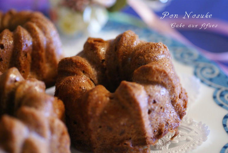 イチジクのバターケーキ(材料6コ分) <フィリング>ドライイチジク…100g 生クリーム…25g 練乳…25g ブランデー…5g シナモン…適量 <生地>バター…100g ローマジパン…25g 卵…2コ 薄力粉…100g ココア…5g ブラウンシュガー…80g BP…1g ~♪♪♪~ <フィリング>鍋に生クリーム、練乳をにと煮立ちさせ、1/4以上に切ったドライイチジク、ブランデー、シナモンを加え半日以上寝かす。 <生地>1.室温に戻したバターに、ローマジパン、シュガー3/4、卵黄をその都度加え混ぜる。 2.卵白を泡立て、途中シュガー1/4を加えながら固いメレンゲに。3.1に2の1/2を加え、ふるった薄力粉、ココア、BPを加え、最後に残りの2をざっくり加え混ぜ、イチジクを混ぜ、型に流し、 180℃のオーブンで35分