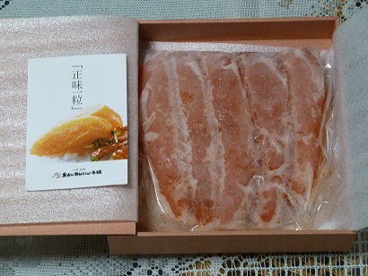 今朝、「見てん!この明太子でかーい。写真に撮っておいたら」「ほんとでっかいね」一見して1腹500gくらいありそうなジャンボ辛子明太子。佐賀から帰省した次男の彼女?が唐津で買って土産にくれたもの。ジャンボ辛子明太子の表示があり、「博多の味」の赤い刻印がついている。しかし製造元は東広島市の久家、たら子の原産地は「アメリカ」。食味は、うす塩で大変美味しい。味的には博多の辛子明太子と遜色ない。ネットで見ると「ジャンボ辛子明太子の久家」でHPがあった。ただ値段がバカ高い。600g物で7,350円、わが家到来の490gが5,250円。美味しいけれど自分で買って食べるにはちょいと手を出しかねる値段である。一緒にいただいた唐津市呼子・木屋の「いかさし昆布漬・わさび漬」も非常に美味しかった。画像は撮影が面倒だから唐津市呼子町朝市通り「木屋」のHPから拝借した。630円HAさん、ごっつぁんでした。でも、あまり高いもの持たせなくてもいいですよ。