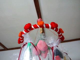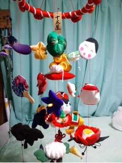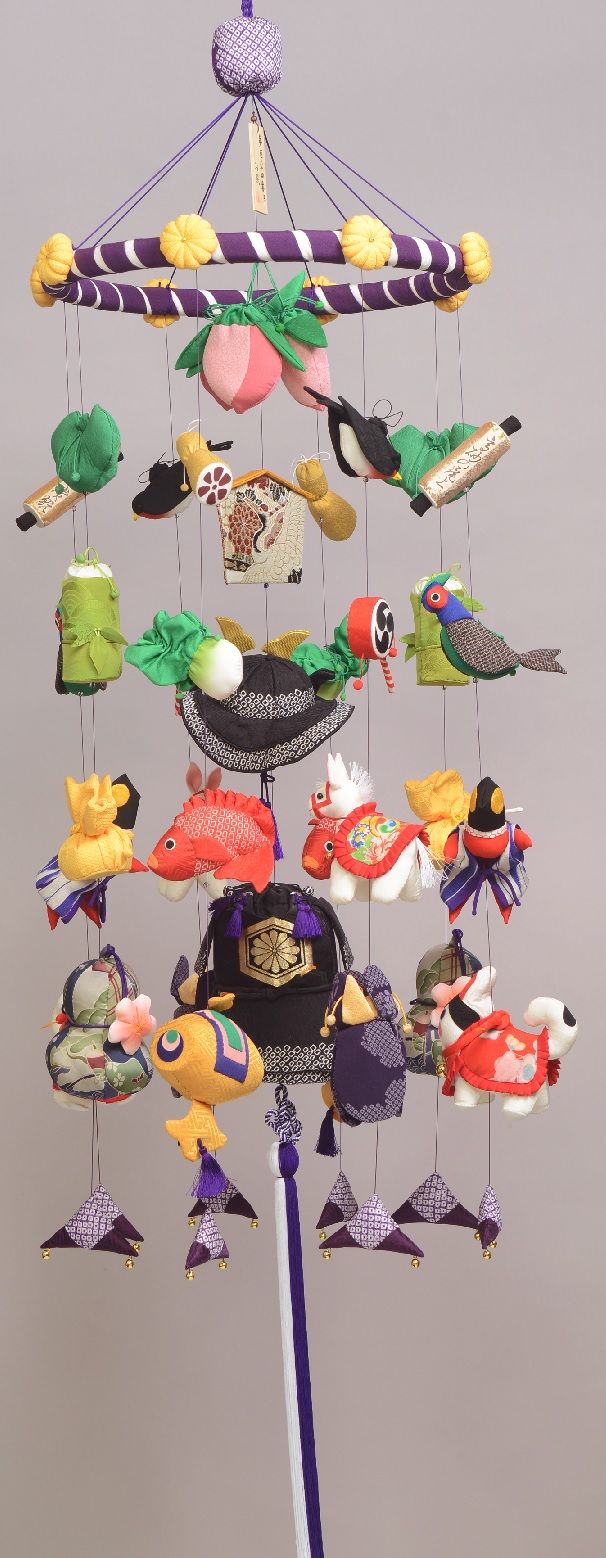 輪の直径約46センチ 中心の吊るす所から房下まで 約2m中心の上から 七宝毬、桃三つ、絵馬、三種の神器、兜、鎧、牛さん、吉祥房剣は 本来 アメノムラクモノツルギ(草薙剣)ですが日本刀にしまして この日本刀は 既製品を 改良いたしましたうわ 昔ながらの毛布丸見えでも もう 疲れているので 見なかったことにして六白の丑年だから 座布団六角形今年の節分前までに生まれた赤ちゃんは この牛の性分です牛の尾には、針金が入っていますので 注意一列目 ツバメ、柏餅、鳩、杜若、タヌキ、虎、花菖蒲、火打三角火打三角は 紺色っぽいですが、綺麗な 青紫です花菖蒲の色は もっと深い紺色です二列目 巻物、レンコン、鯛、竹、馬、猪、蛸、火打三角猪の柄ね 毎回これだけど 竹藪から出てくる感じして気に行っています もうすぐ なくなるのよね 生地探しも よいでないけどねなかなか、気にいらないと作れないので大変三列目 茄子、宝袋、でんでん太鼓、キツネ、龍、金太郎鯉、熊、火打三角金太郎の頭ね 今まで、絹糸使って やっておったしかし やっと 気づいた 遅いけど帯紐黒の 解いて少し湿らして アイロンかけて たっぷりの増毛ぞもう少し早く気づけばね最近、物忘れもすごいし 花粉で、目ん玉もかゆしでいや 愚痴は言うまい幸せだから四列目、銀杏、茸、薩摩芋、菊、トンボ柿、カボチャ、俵ねずみ 火打三角いやーサツマイモは 奥が深いこんなに サツマイモ食べた年はないそして、本物のサツマイモ作る予定 、家庭菜園でね植え方から、肥料から 手間暇も考えると スーパーの野菜、高いわなんて言えないカボチャにも挑戦すんだ オレンジ色のカボチャ作る予定五列目、 松、瓢箪、打ち出の小槌、蕪、竹の子,海老、奴さん、火打三角其の二へ続く
