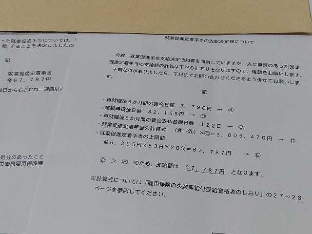 先々週に就業促進定着手当が支給された。書こうと思ってたら、仕事がバタバタして今日になった。再就職後半年間の差額が補填される的な書きっぷりだったので、年収が1/3以下になった身としては超楽しみに待っていたら、なんと67,878円! 〇の一個付け忘れか、見間違いかと思ったが7万円弱。右側の計算式で見ると、この半年の日給は8,000円弱、前職時代は32,000円。半年で300万少ないと証明できているが、なんか訳分からん計算式が挟まれ、DとEが比較されD>Eのため、この金額。色々支給してもらったが、これが一番ガッカリだった。定年まで1社勤め上げだったら1回も貰わず終了で、それに比べりゃ儲けた?気分か(今までの積み立ての回収には程遠すぎるが・・・)。今度、この失業期間の総受給額を計算してみよう。第10版 失業保険150%トコトン活用術 [ 日向咲嗣 ]