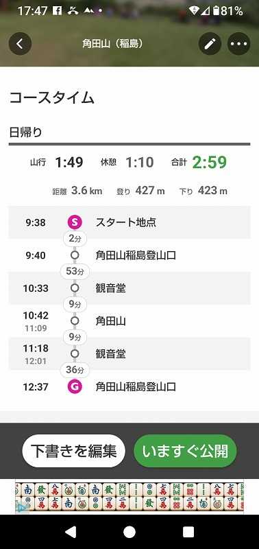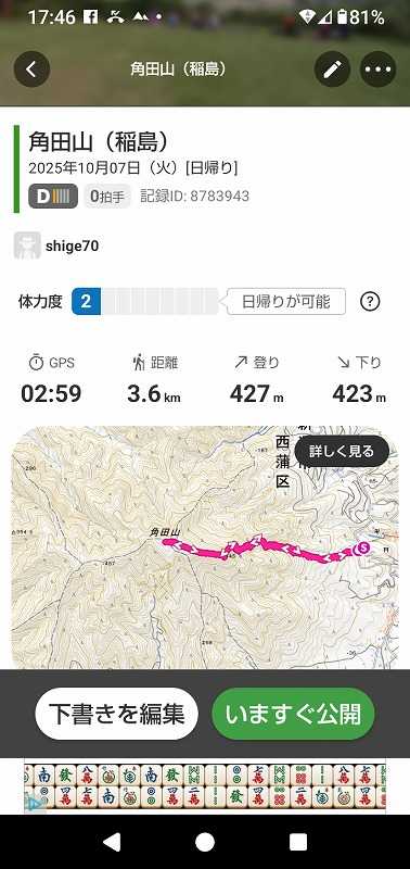 今日はあっさりと登ってこようと稲島へ。登り1時間04分。下り(観音堂から)36分。