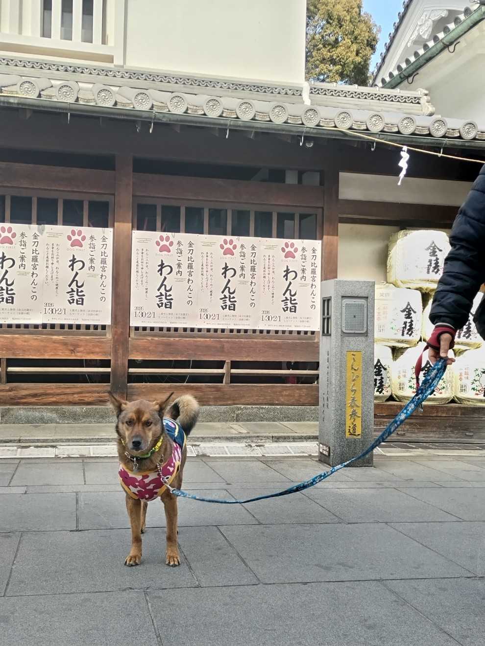 土曜日、金毘羅さんのわん詣でに行って来ました。わざわざイベントでなくても犬連れ参拝可能なんですけれどね(笑)ちょこはもう我が物知り顔で、裏参道への道をルンルン行きます。裏参道は、自然豊かな山の中を(たまに階段も有るけれど)のんびり登ります。しかも表参道の階段が名物なねで、めったに人にも会いません。わんにも人にも優しい参道です。ちょこには、さらにサラダバー付きです。冷たいと思っていたら、あられが降ってきました。先日の砥部といい、、あられ続き…岡山より香川の方が寒いのかしら?ここからは、表参道に合流します。わん連れがかなり目立ちます!!さすが、わん詣で期間中ですねー(眼福!!眼福!!)今年は午年、金毘羅さんには2頭の神馬がいらっしゃいます。大人気です。さあ、階段を登りましょう。さすが四駆は軽やかに登って行きますね。いつもは交代でちょこ番をして、お参りしていましたが…皆さんわん連れでお参りしているのを見て、ちょこも一緒にお参りしましたよ。ええっー!?そこを行くの?確かに境内は賑わっていますが…最近、ばあやもハマった御朱印を授かり、少し休んで下山です。翌日仕事のじいや、奥の院は目指しません。これに異を唱えたのはもちろん、ちょこ!!一度行ったら忘れない男です(笑)でも、下りました。座り込みも辞さない覚悟の談判ですが、下りました!!なら、下りも裏行くちょこよー。表参道入って直ぐの酒屋金陵の中庭では、わん詣でマルシェで、ごった返していました。記念写真を撮って退散。そっちは、参道よ!!もう一回ちょこよー!!と、押し問答の末、ちょこに甘々な飼い主は…ちょこのなすがままに、再び裏参道を登り、表参道の合流地で階段を見つめ、強制帰還(笑)途中のベンチで、マルシェで買った味付け無しの壺焼き香川金時さつま芋のチップス?シート?を おやつに一緒に食べて。遠足気分。随分遅めのランチは、食堂らんぷさんへお庭のテーブル席は、嬉しいわん連れOK。ご飯は玄米、チキンタルタル南蛮も美味しい!!お腹いっぱーい。帰りに一軒寄って、欲しかった猪熊弦一郎のイラスト入り野田琺瑯のぱっとと、蓋付きタッパーをげっ。与島で夕さんぽしてから帰りました。足、ぱんぱんでしたー💦