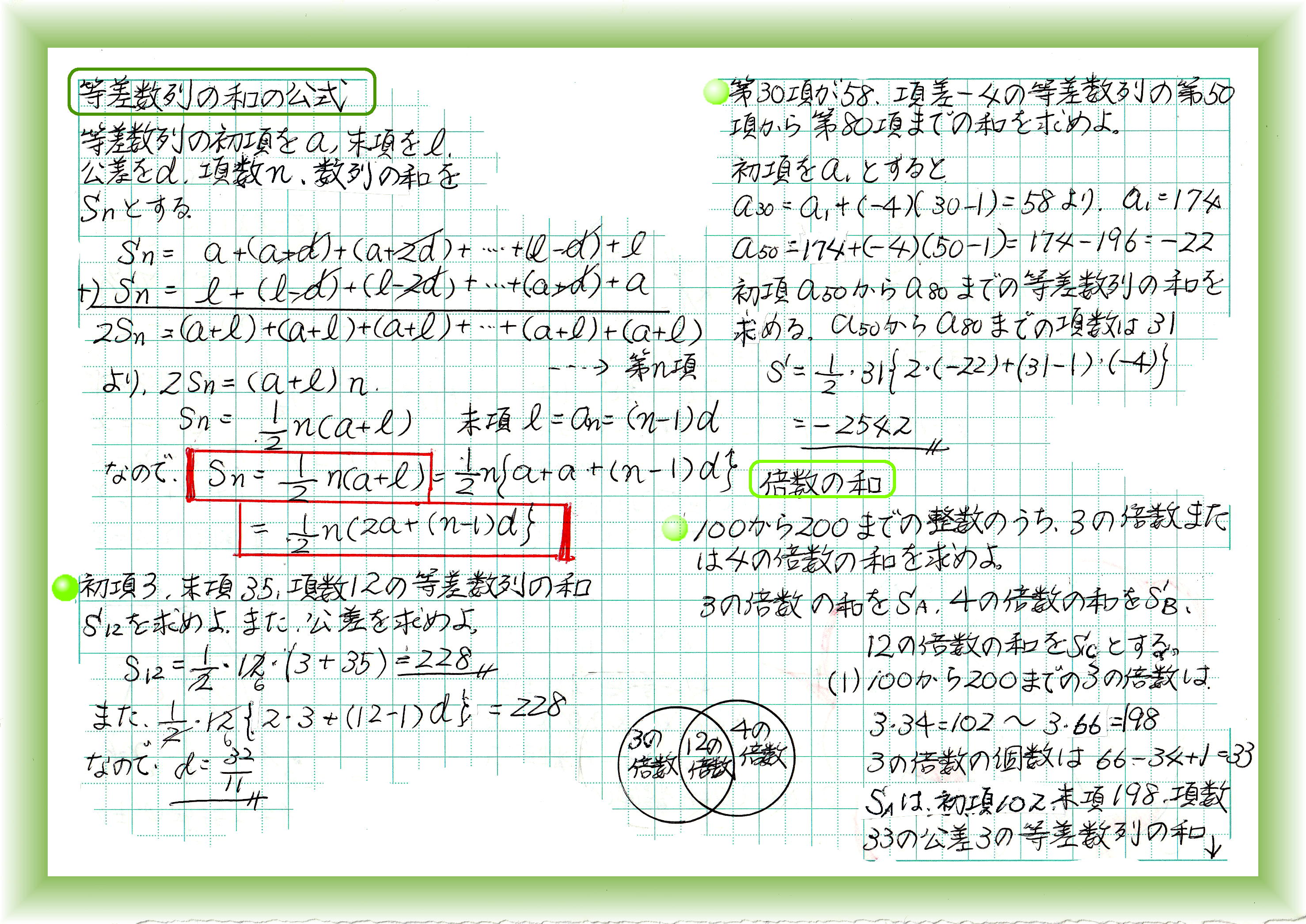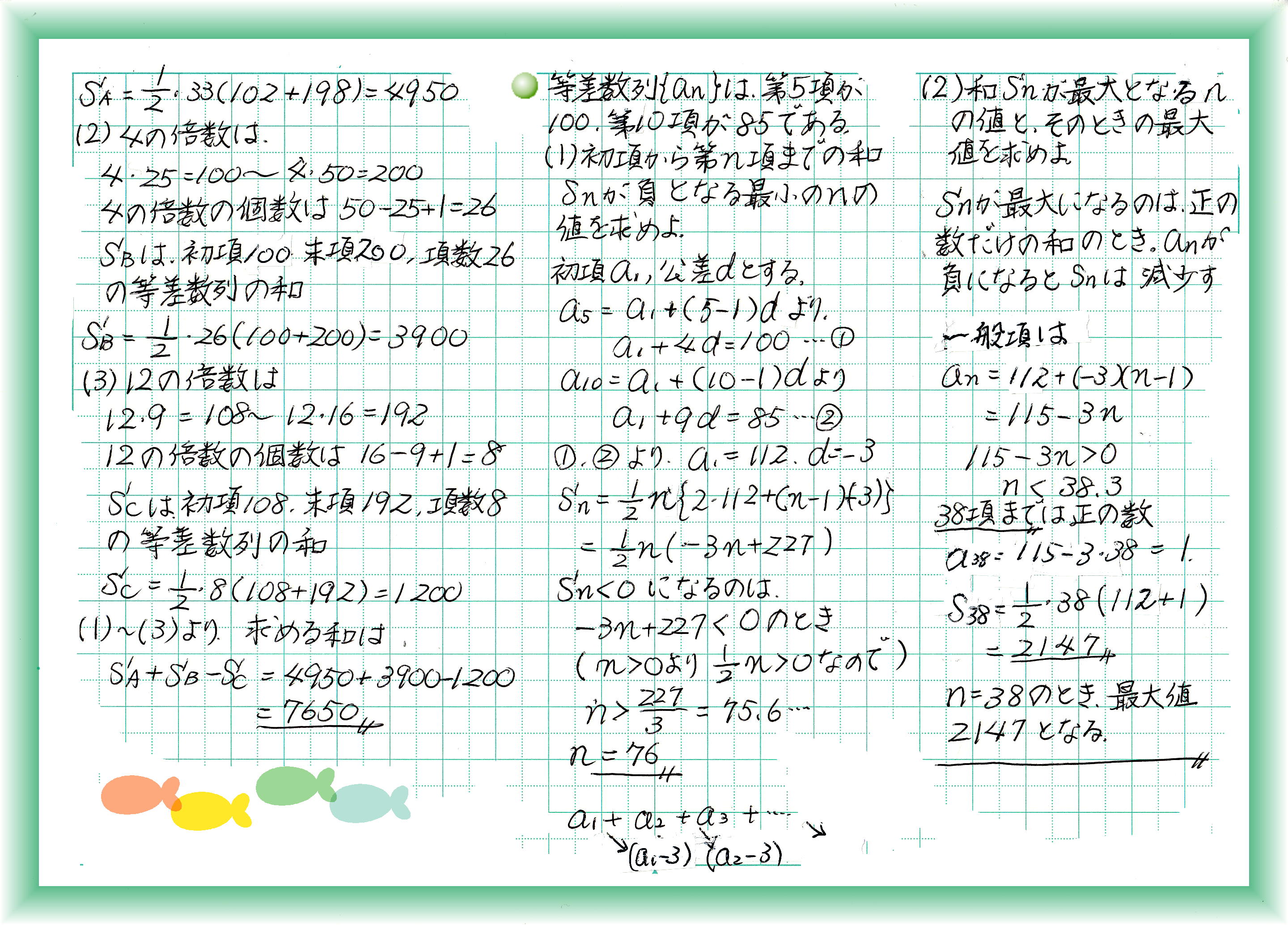 等差数列の和は公式で求められます。 末項がわかっていれば、項の数n×(初項+末項)の1/2で計算できます。 天才数学者のガウスが7歳の時、「1から100までの数を全て足せ」と言う問題に、1+100,2+99,3+98…と101になる組合せが50(100の1/2)できるから5050と答えたのは有名な逸話です。 末項がわからない場合は、初項a+(n-1)×公差d=末項で置き換えられます。 公差が負の数だと、足す項がどこかで0より小さくなります。足す項が0より小さくなる前までの和が最大になります。この次の項を足していくと、和は減少していくばかりです。 一般項が0より大きくなるxの範囲を、不等式を立てて求めます。