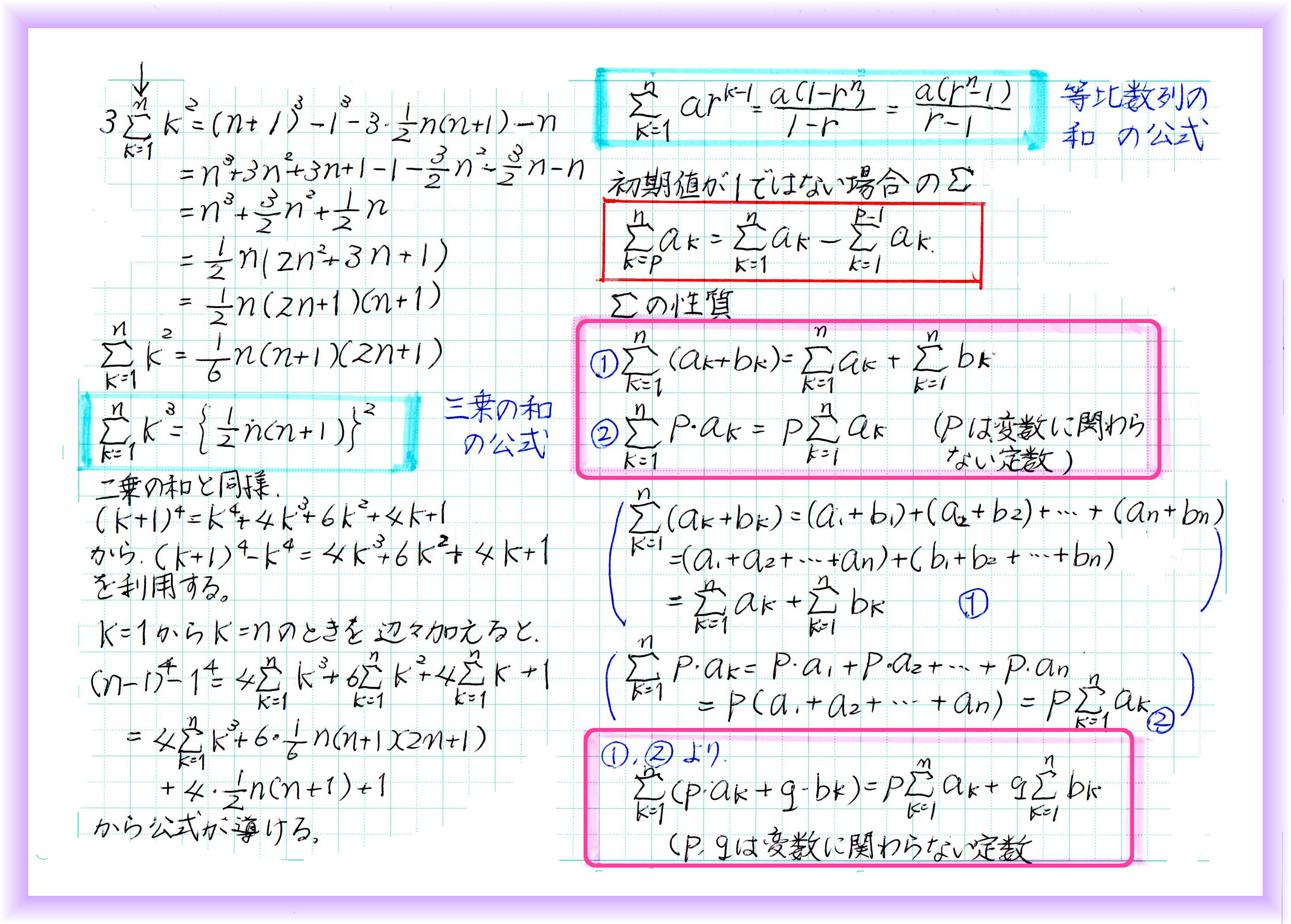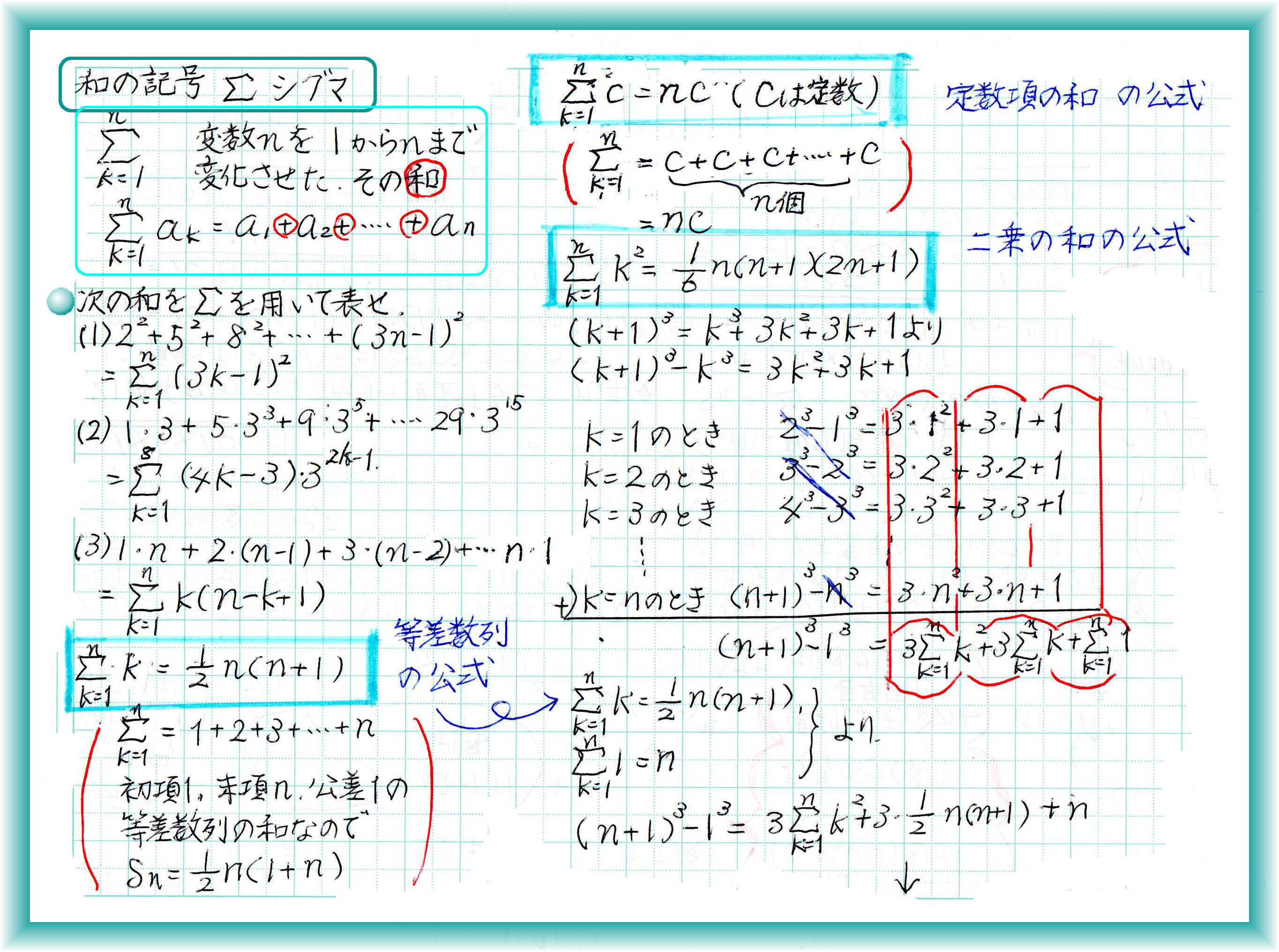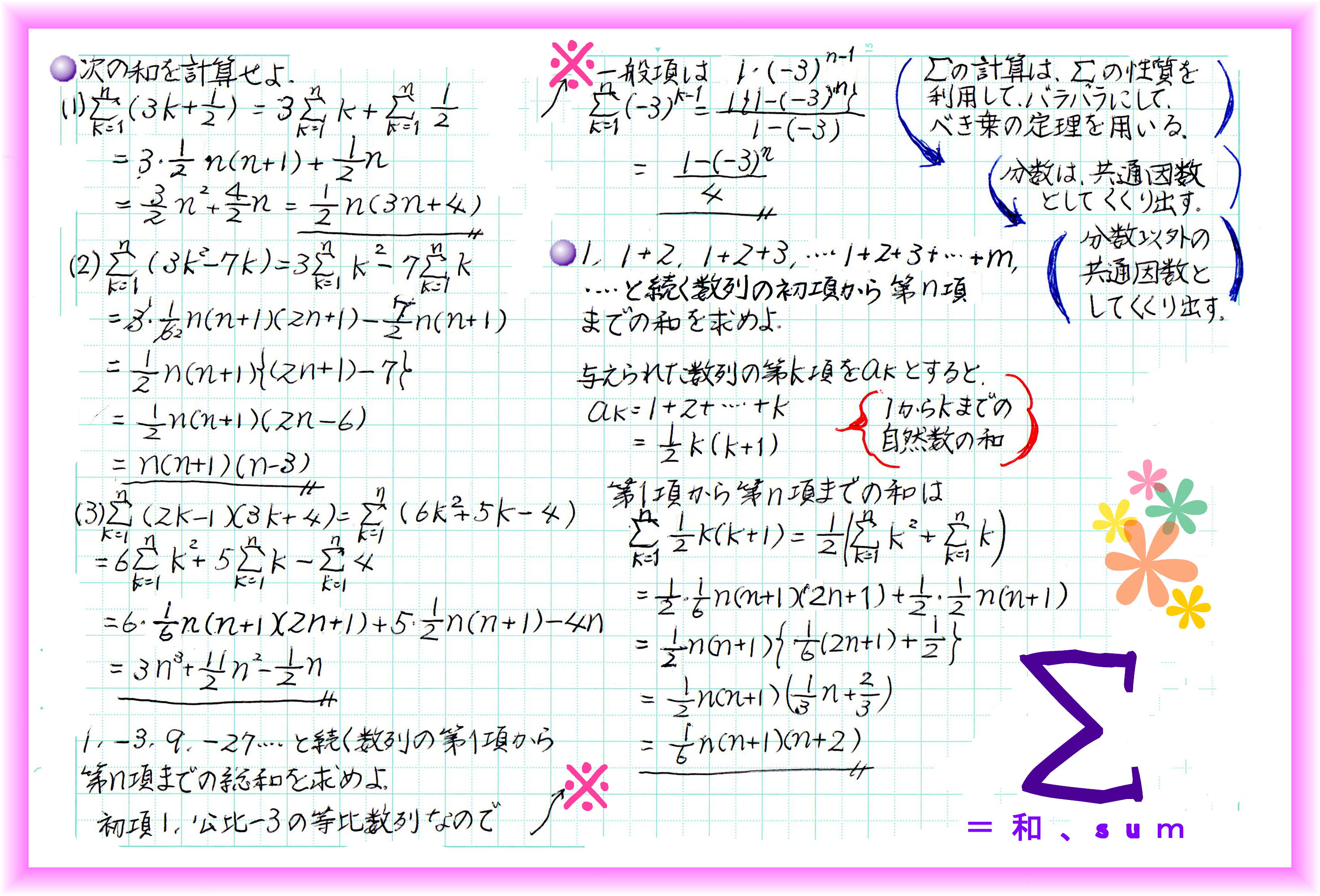 うわあ、また見慣れない記号に出会ってしまいました。 Σ(シグマ)はギリシア文字のSで、「合計」(英語のsum)の意味です。積分で使われる記号∫(インテグラル)もSを引き延ばした形で、「総和・全体」の意味でした。Σは数列、∫は関数で使うので、Σが1つ1つ足していく合計であるのに対して、∫のほうが連続した合計になります。 文系頭は慣れるまで大変ですが、「kが1からnまで動くとき、2kで表される式の和」はいくつか?なんて書くより、確かに記号を使った方が手早く表現できますね。