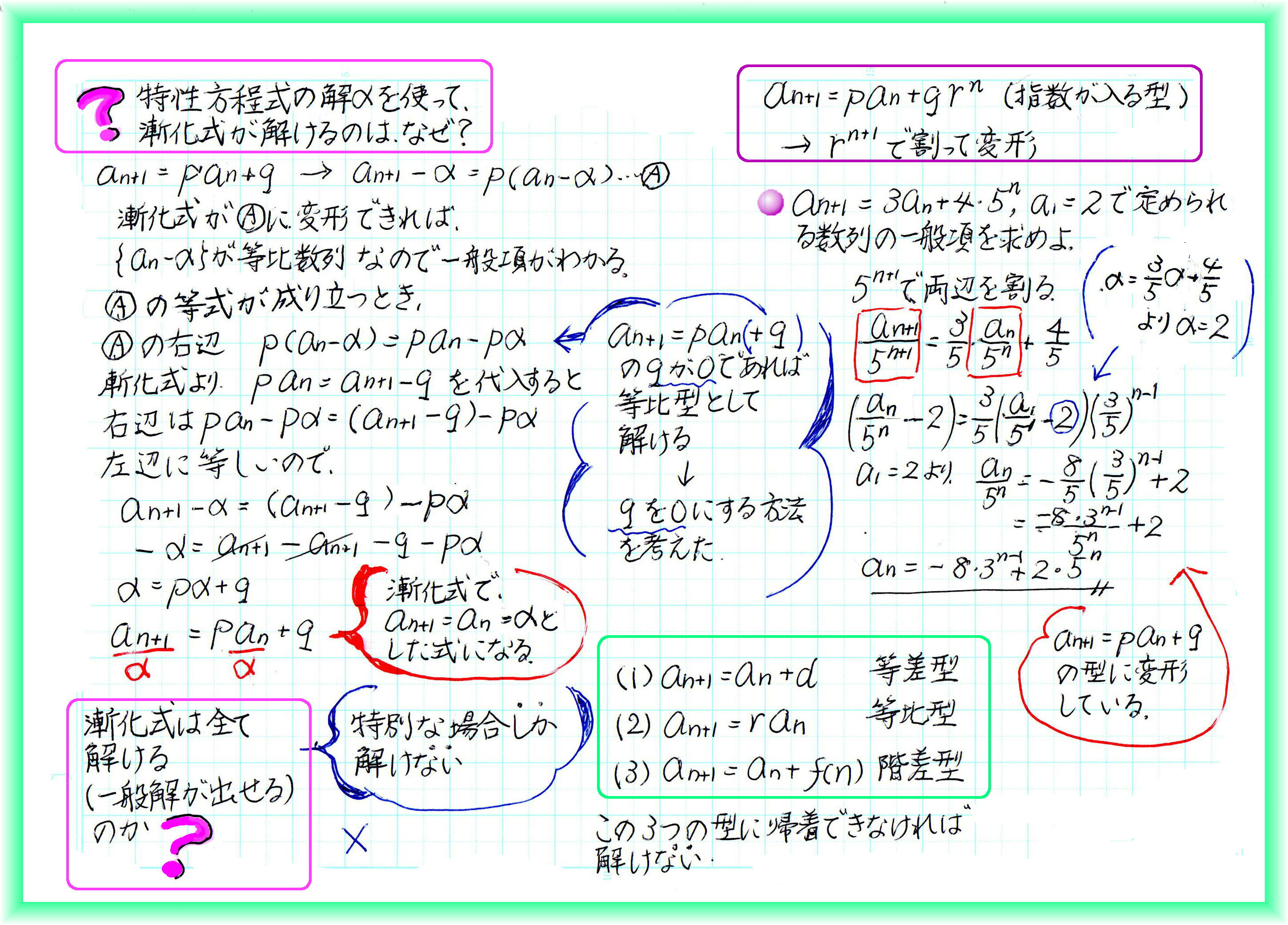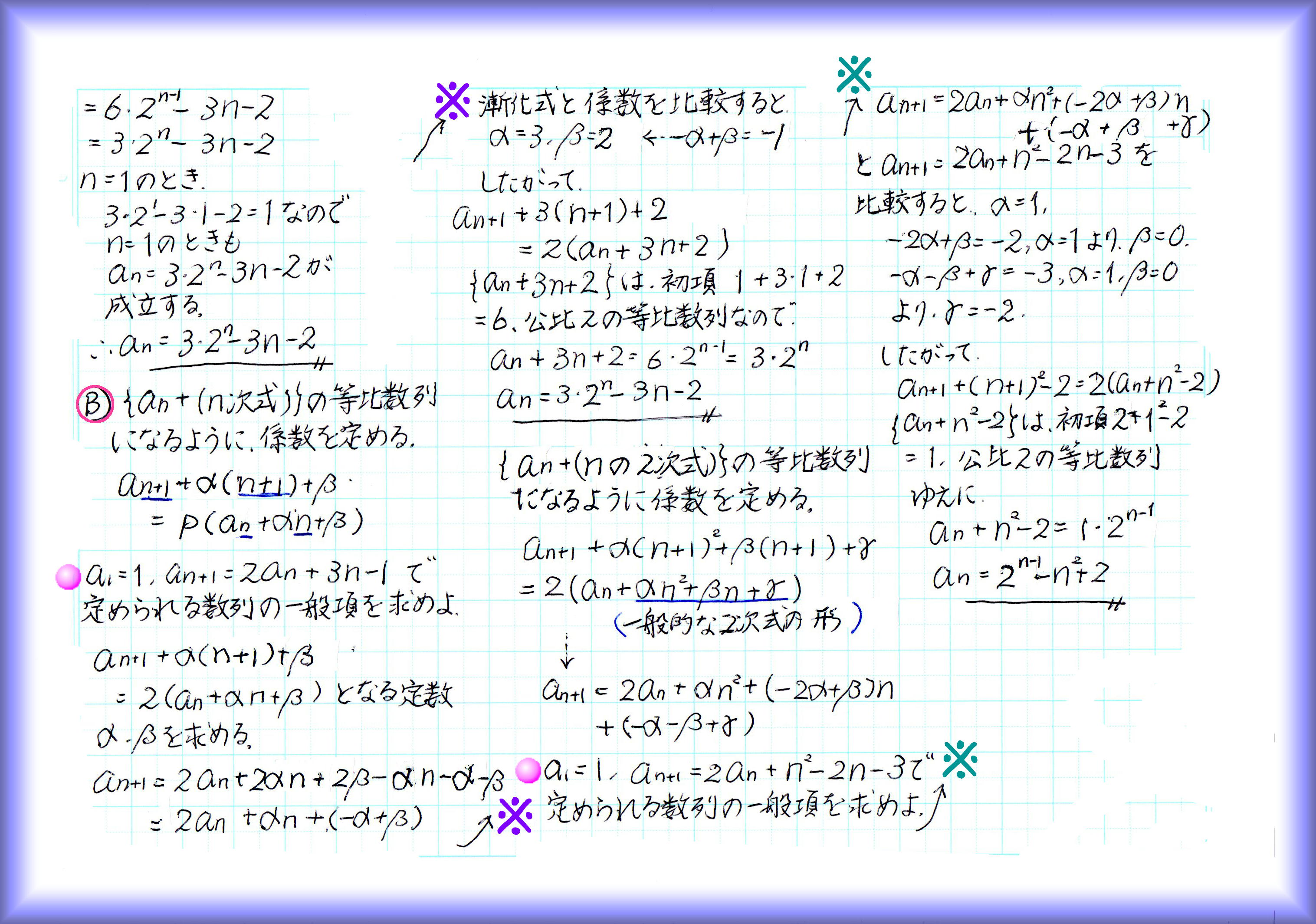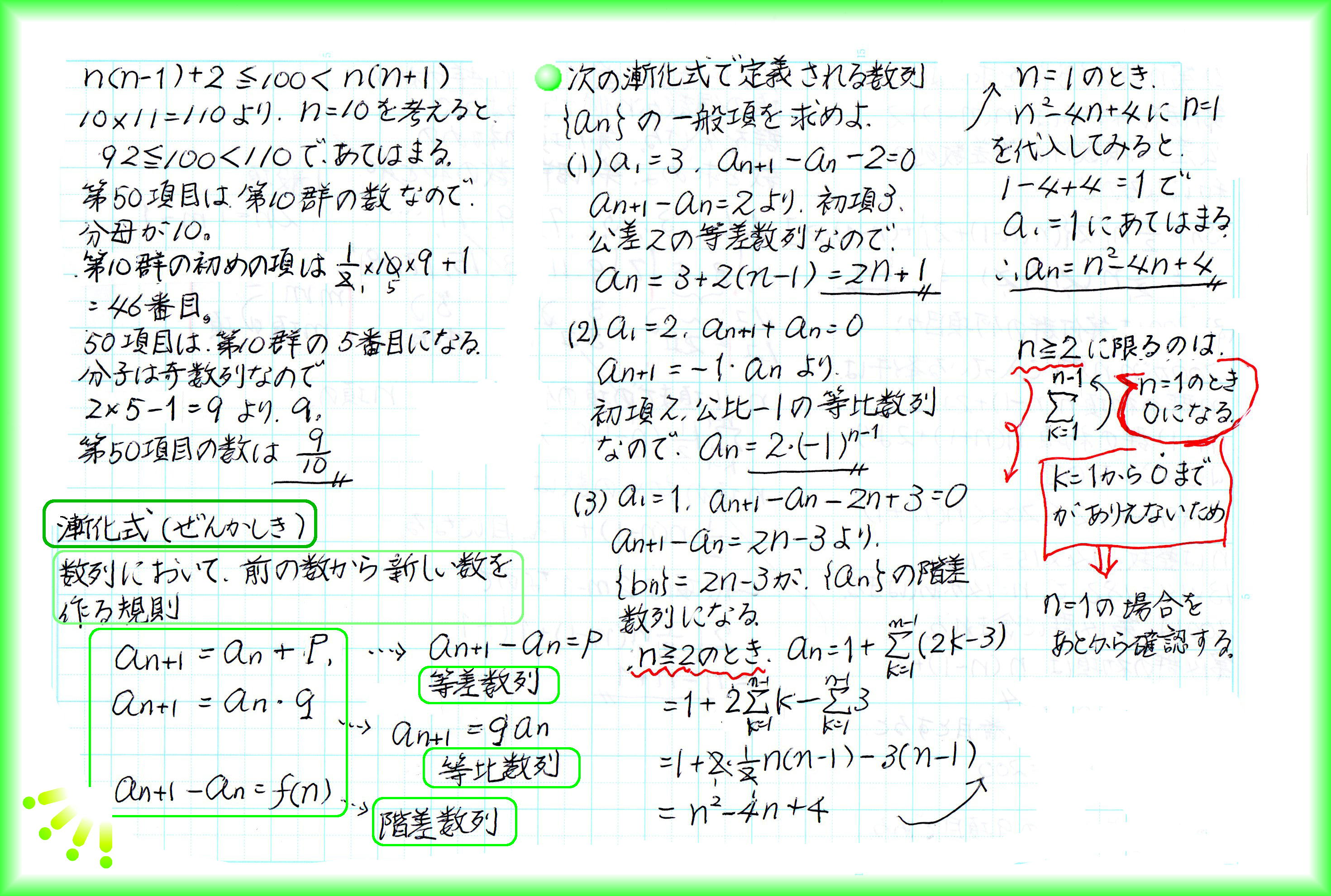 数列の、ある項と次の項の関係を表すのが漸化式です。等差数列では、次の項=前の項+d(dが公差)の形になります。等比数列では、次の項=前の項×r(rは公比) さらに、次の項が、その前の項にan+bを足していく形になっている漸化式は、階差数列型。B(n)=an+bが元の数列の階差数列になるので、元の数列に、n項までの階差数列を足すことで一般項が求められます。 漸化式から一般項を求めるのが漸化式を「解く」こと。等差型、等比型、階差型のほかにもいろいろな形の漸化式がありますが、なんとかこの3つの形に変形して解きます。 大学受験にはもっと高度な漸化式の解法が必要ですが、今更受験しないばば頭は、基礎的なレベルでとどめておきます。