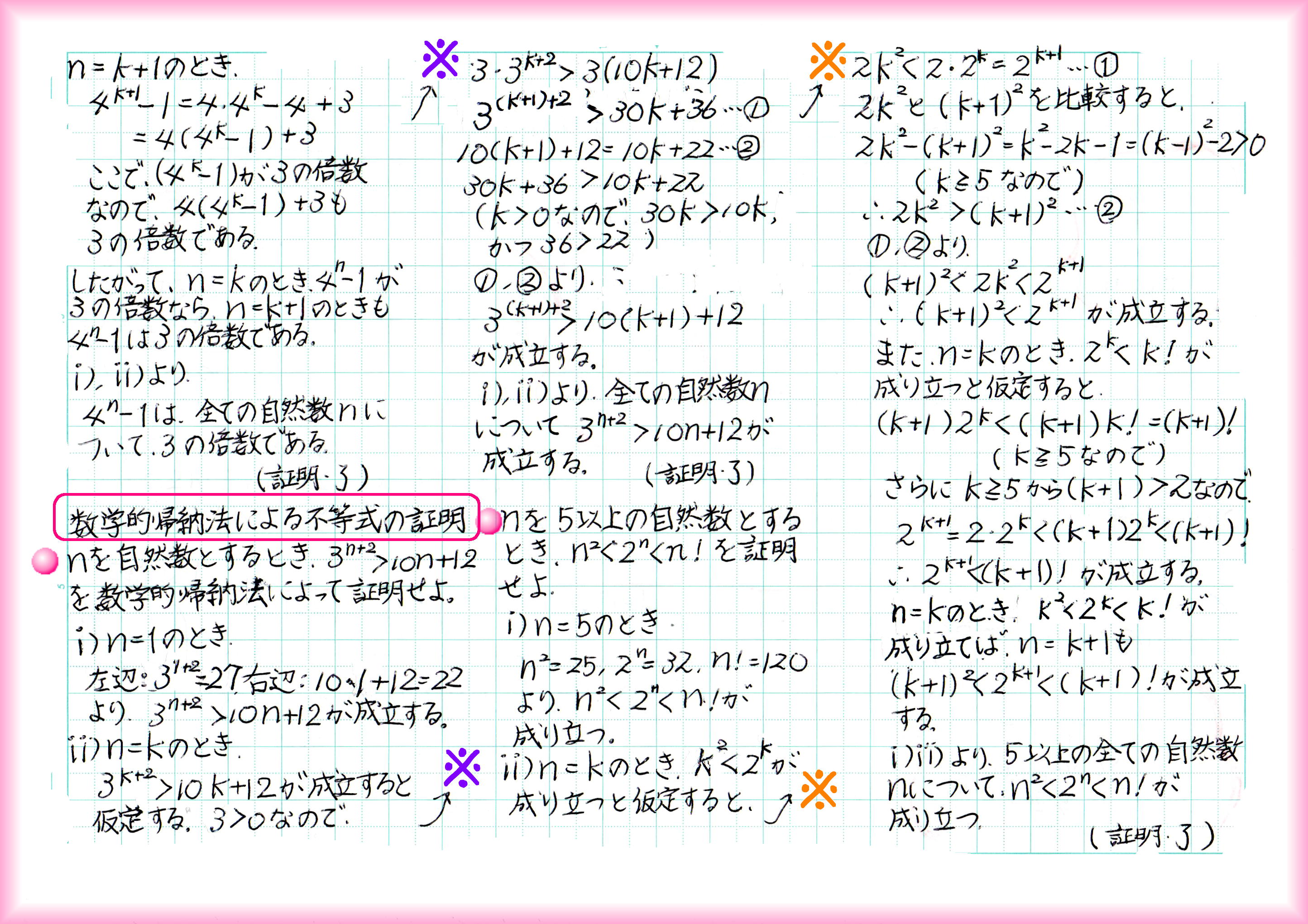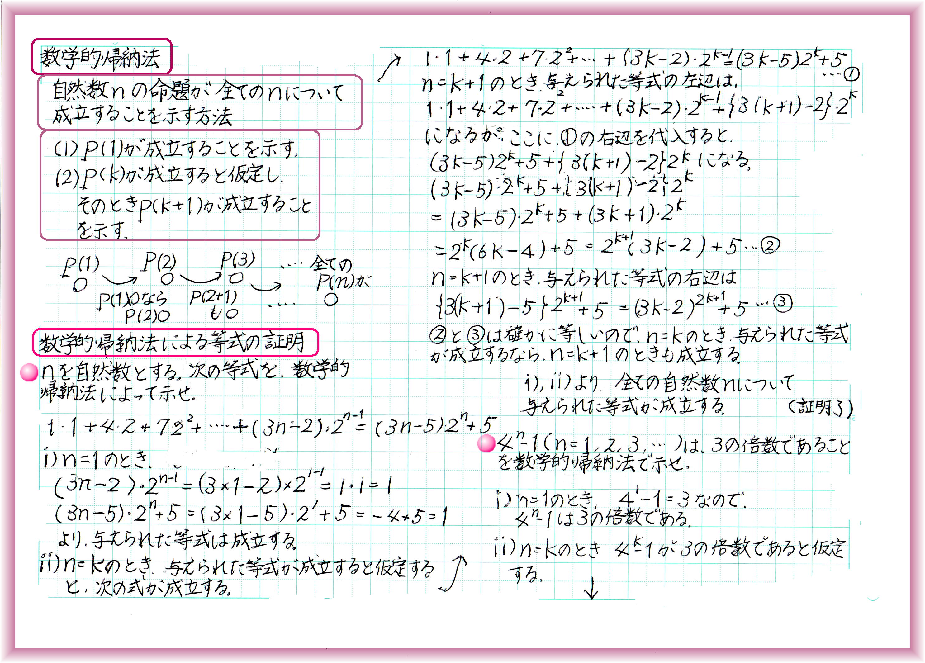数学の証明法の一つに「帰納法」というのがあります。自然数nについての命題を証明するとき、n=1で成立することと、n=kで成立すればn=k+1の時にも成立することの2つを証明できればOKです。 n=1のとき成り立てばn=1+1=2でも、その次のn=2+1=3でも…どんどん1ずつ数が大きくなってもずっと命題が成立することになるからです。(スタートが「5以上の自然数」などと指定される場合もあります。) 「ドミノ倒し」と解説されることが多いのですが、納得ですね。
