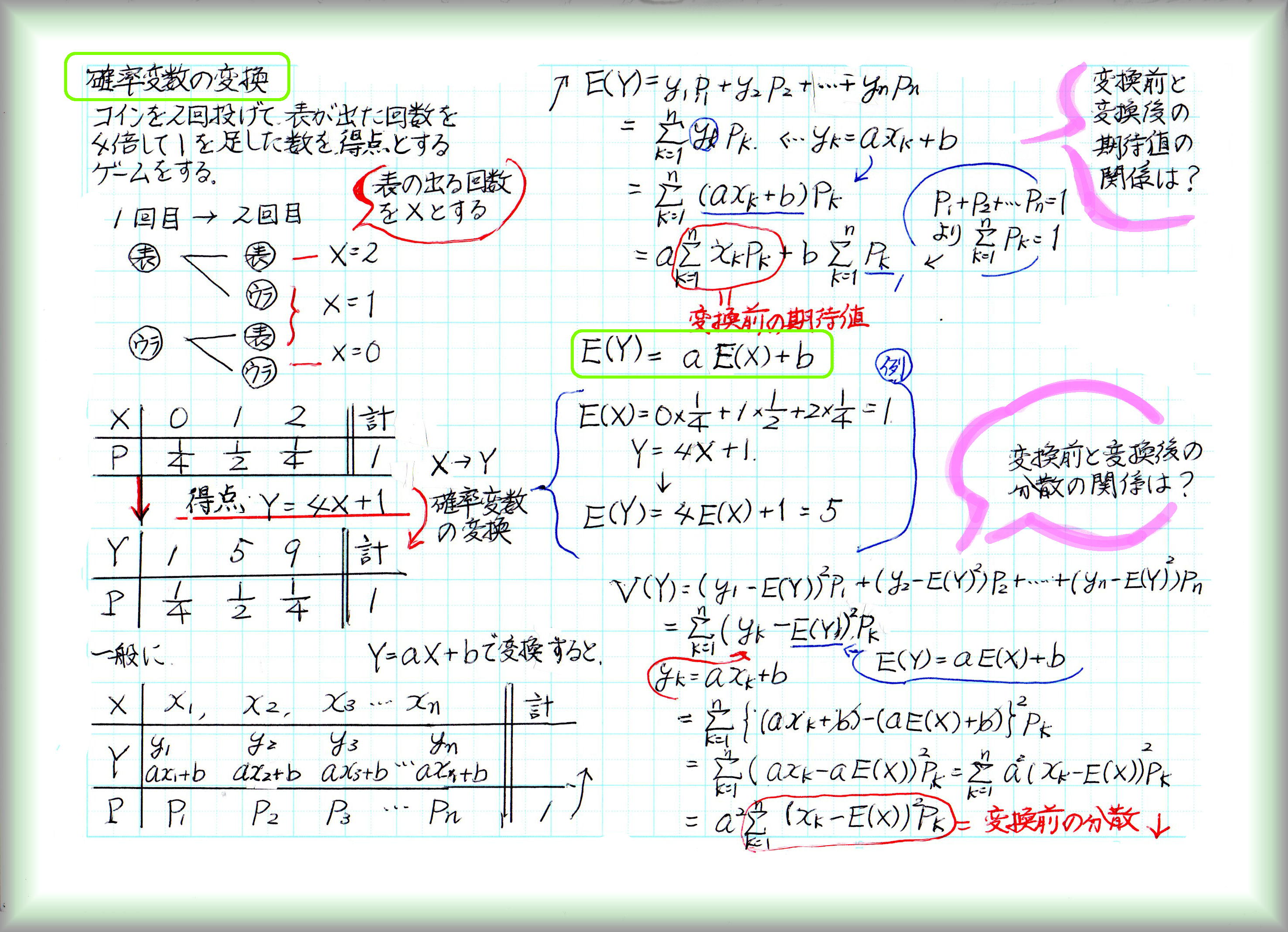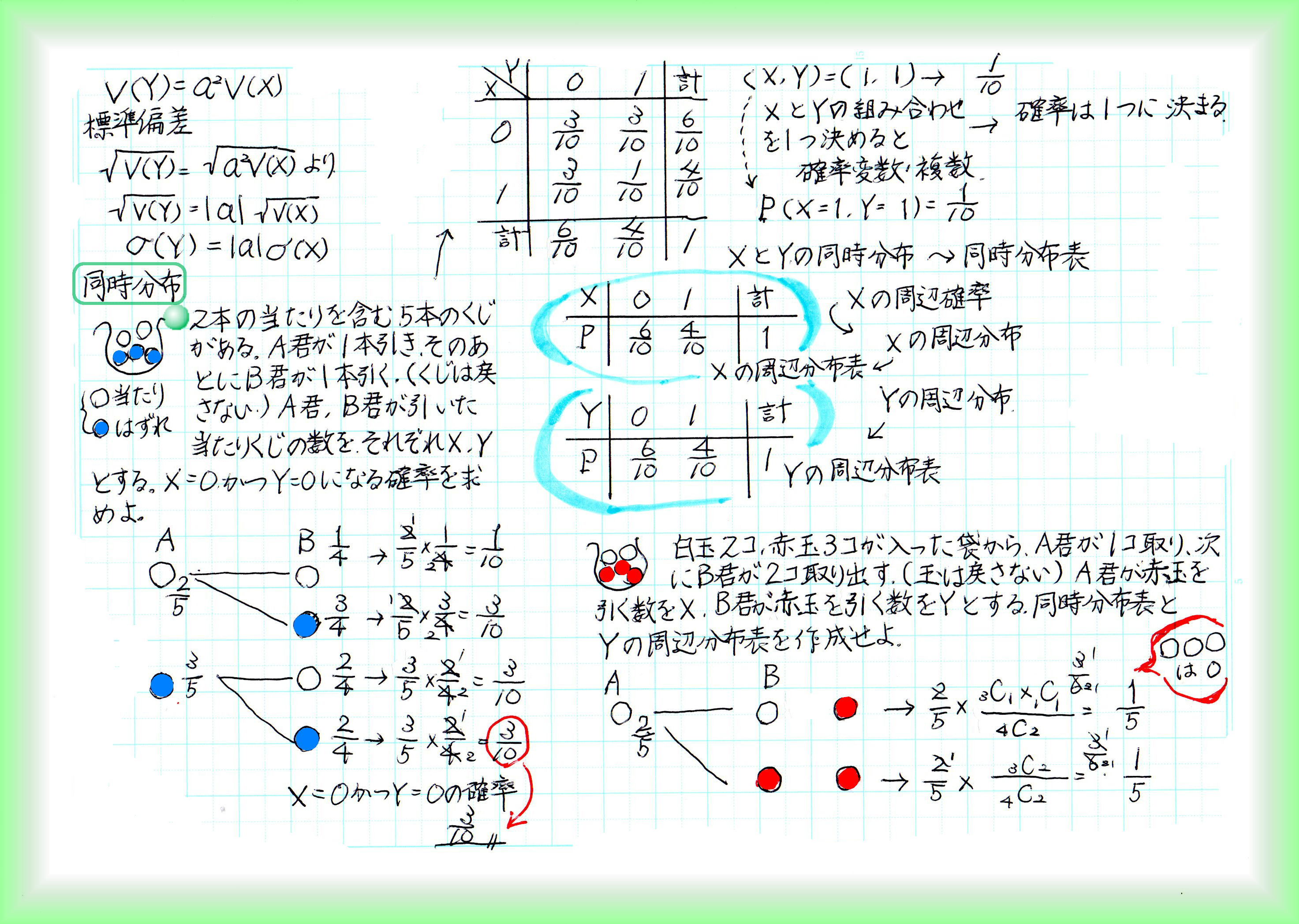 ![]() 再び、参加費を払ってゲームに参加すべきかどうかの問題です。ルールが複雑になります。「コインを2枚投げて表だった枚数×2+400円もらえるけれど参加費が500円かかる」場合の損得は? コインを2枚投げて表が出る枚数の期待値は簡単に出せます。1(枚)ですね。でも「コインを2枚投げて表だった枚数×2+400円」の期待値は計算が面倒です。 ここで、確率変数の変換です。コインが表になる枚数X、「コインを2枚投げて表だった枚数×2+400円」をYとすると、Y=2X+400で、E(Y)=2E(X)+400になります。 こんな場面で確率変数の変換が便利なんです。(もちろん、損得勘定だけではないのですが) ![]() ![]() 世の中って単純にはいきません。1つの確率変数で事足りず、2つ、またはそれ以上の変数が絡み合うことの方がずっと多いのです。2つの確率変数の分布を表にしたものが「同時分布表」です。そのうち一方■だけ取り出した表が、「■の周辺分布表」です。 お気に入りの記事を「いいね!」で応援しよう