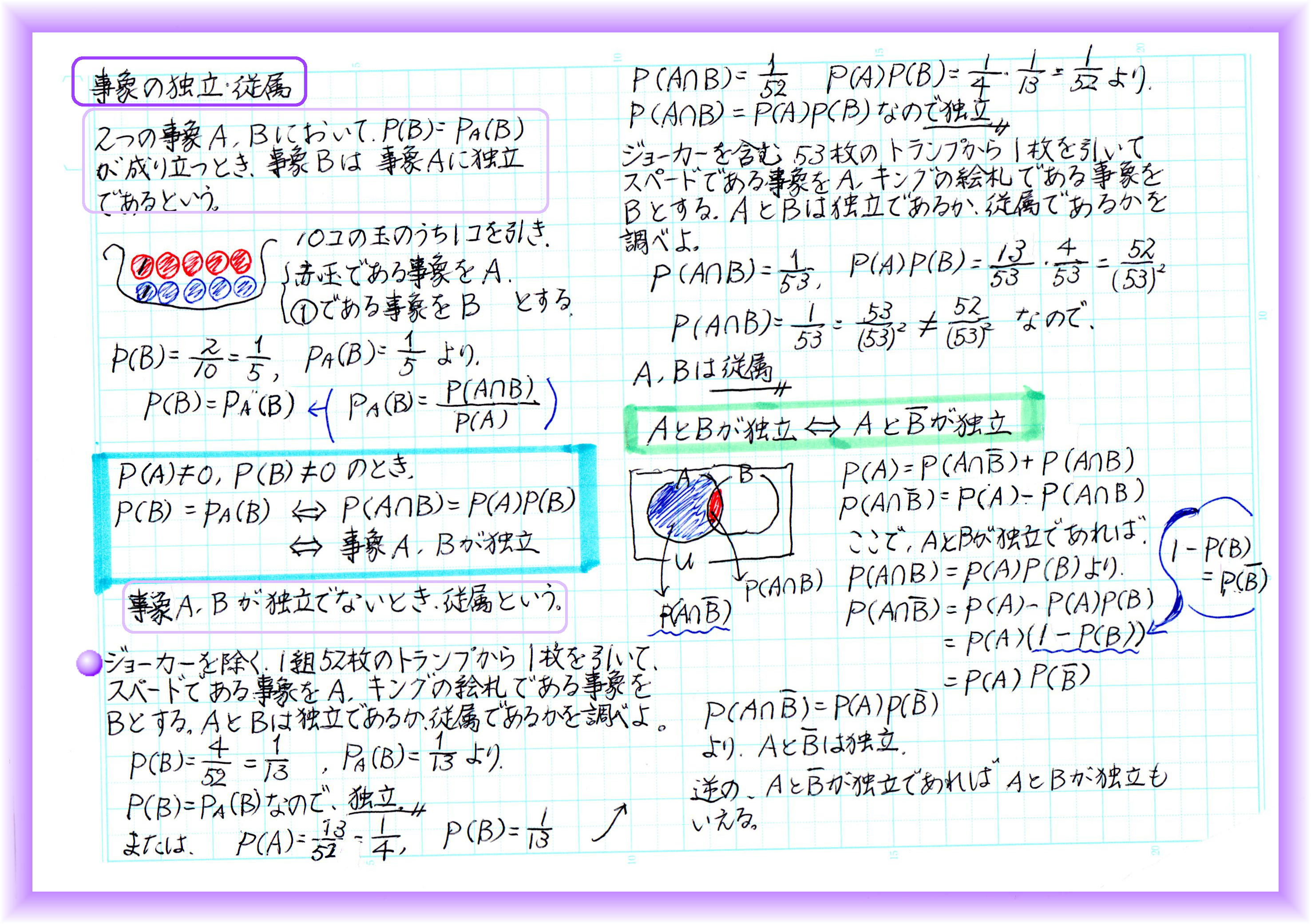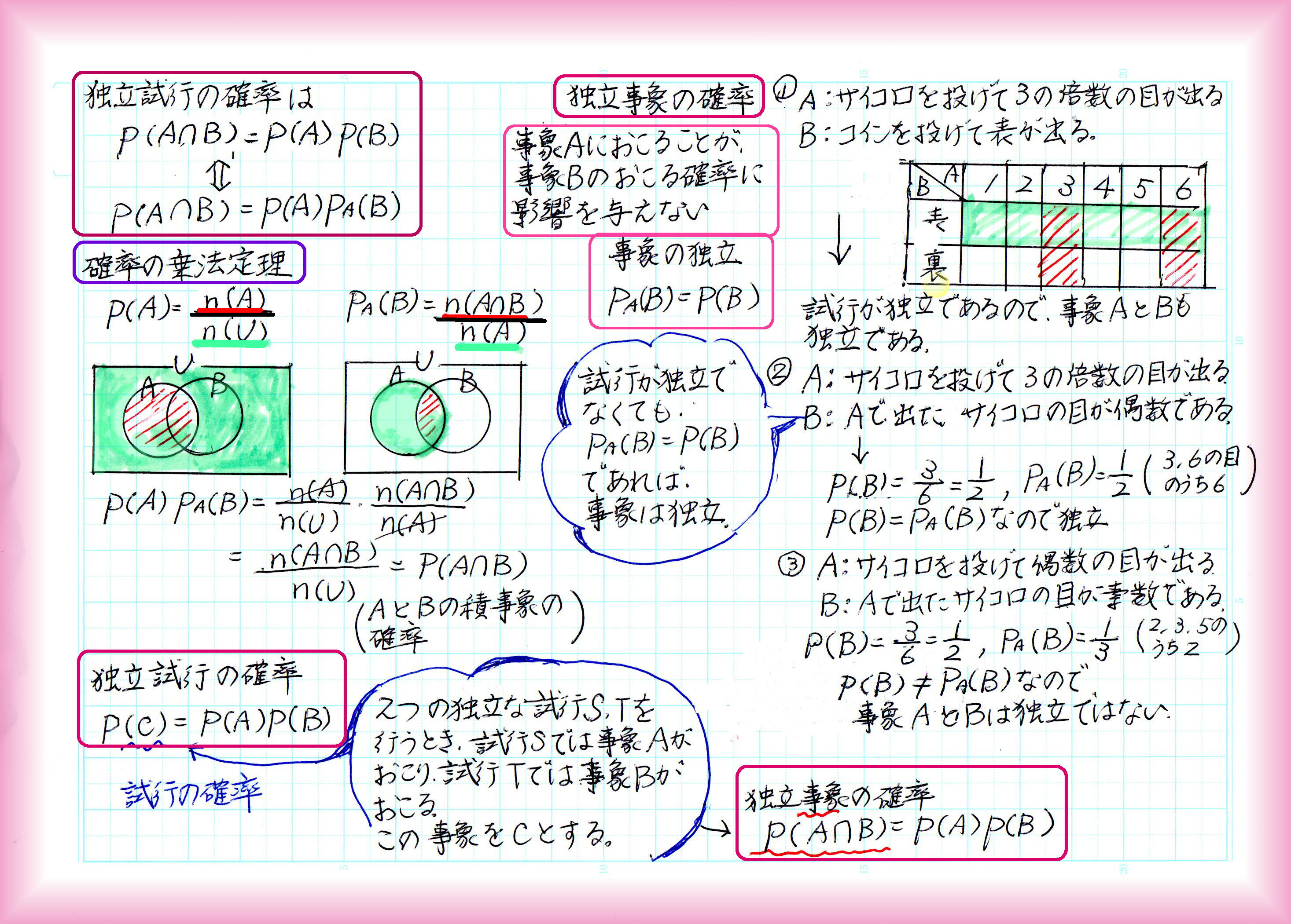 ![]() ![]() 「試行」は「サイコロを1個投げる」のような実験や観察の行為でした。 「サイコロを1個投げる」試行と「コインを1枚投げる」試行は同時に行っても、お互いにその結果は影響し合いません。「サイコロの目が3のときは、コインは表になりやすい」などということはありません。コインとサイコロが紐でつながっていれば別ですが。 このように互いに影響し合わない試行を「独立」といいます。 独立な試行であれば、その結果である「事象」も互いに影響ない「独立した事象」になります。「サイコロの3の目がでる」「コインの表が出る」事象は独立です。 独立した事象両方が起こる確率は、それぞれの確率の和になります。 ![]() 2本のくじのうち1本が当たりで、、Aくん、Bくんがこの順番で引き、くじを一回ごとにもどすとします。Aくんが引くときもBくんが引くときも、2本のくじから1本の当たりか1本の外れを引くので、状況は全く同じです。Aくんが当たりを引こうが外れを引こうが、Bくんの当たりを引く確率は変わりません。 Bくんが当たりくじを引く事象は独立事象です。 独立していない事象として、2本のくじのうち1本が当たりで、Aくん、Bくんがこの順番で引き、くじはもどさないという場合を考えます。 Aくんが当たりを引いてしまったら、Bくんは外れに決定です。Aくんが外れを引くとBくんが当たります。Aくんが当たりであっても外れであってもBくんの当たる確率が変わらないのが「事象の独立」なので、Aくんがどちらを引くかでBくんの運命が決まってしまう場合は独立ではありません。従属です。 全体として見ると、当たりを引く確率はAくんもBくんも1/2で変わりませんが、事象が独立か従属かという違いが出てきます。 お気に入りの記事を「いいね!」で応援しよう