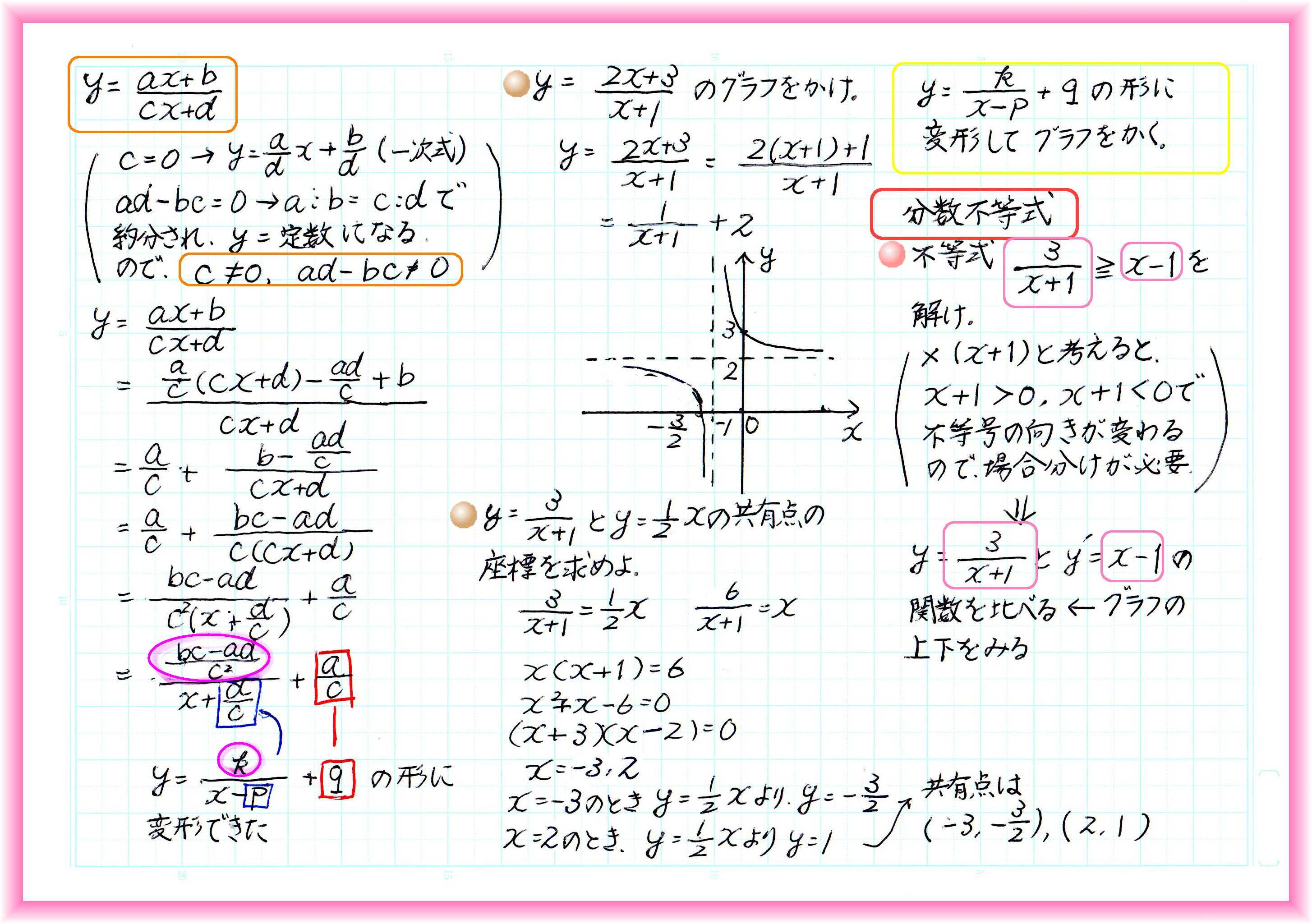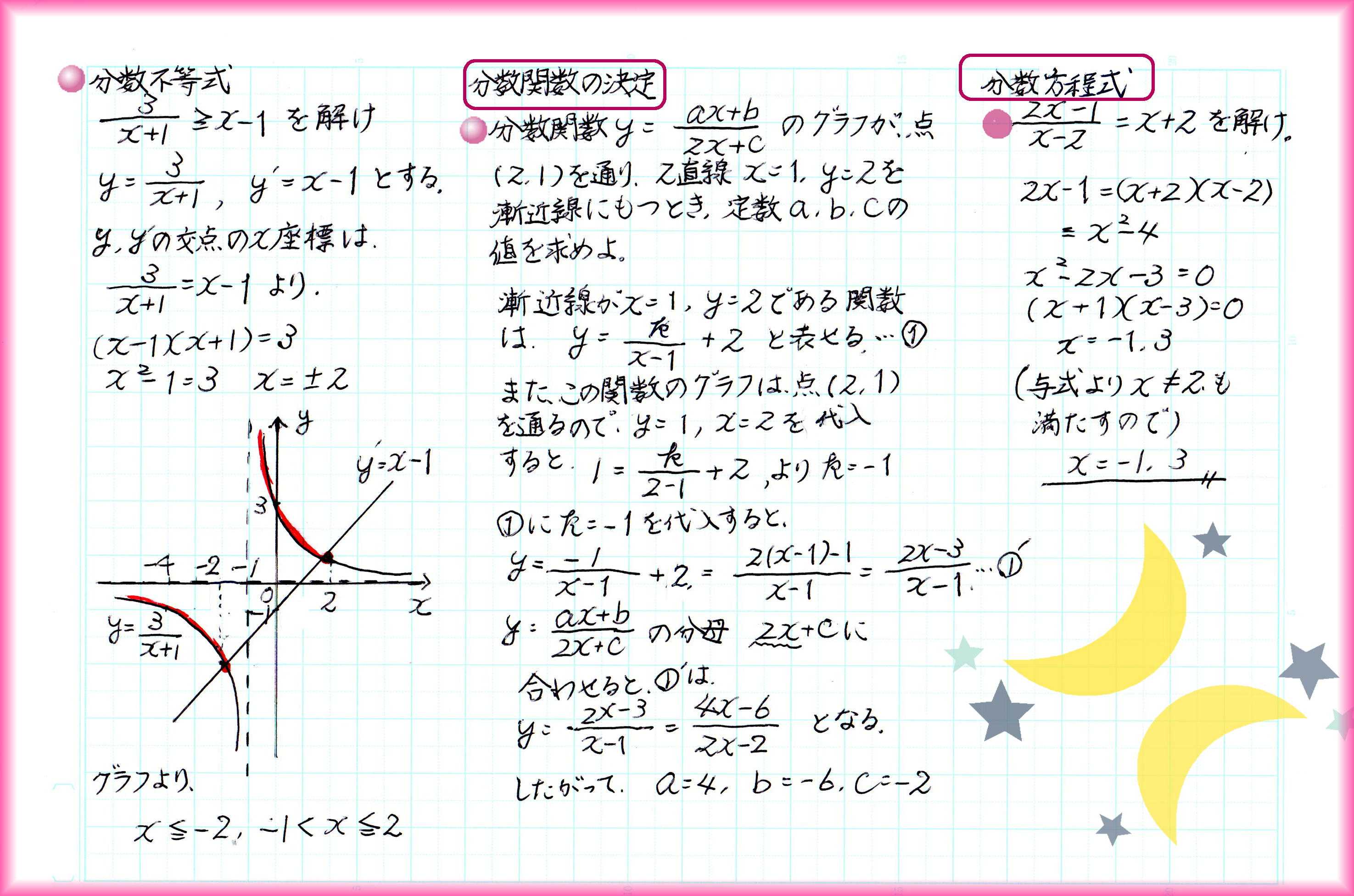 数学Ⅲでは、逆関数・合成関数・関数の極限を学習します。 いろいろな関数の1つ、分数関数の登場です。。 分母に変数が含まれる分数の形の関数が、分数関数です。約分すると分母からXが消えるような関数は分数関数に含みません。 ![]() 基本の形は小学校からおなじみの「反比例」です。分数案数のグラフは、反比例のグラフをX軸方向、Y軸方向に平行移動したグラフになります。 ![]() 分数方程式は、移行して2次式にして解きますが、元の式の分母が0になる数を除く条件に留意します。 分数不等式は、左辺と右辺をそれぞれ関数とみて、グラフの上下を調べることで解く解法もあります。もちろん、素直に移行して解くこともできますが、正負で不等号の向きが変わるため、場合分けが必要になります。 ![]() お気に入りの記事を「いいね!」で応援しよう