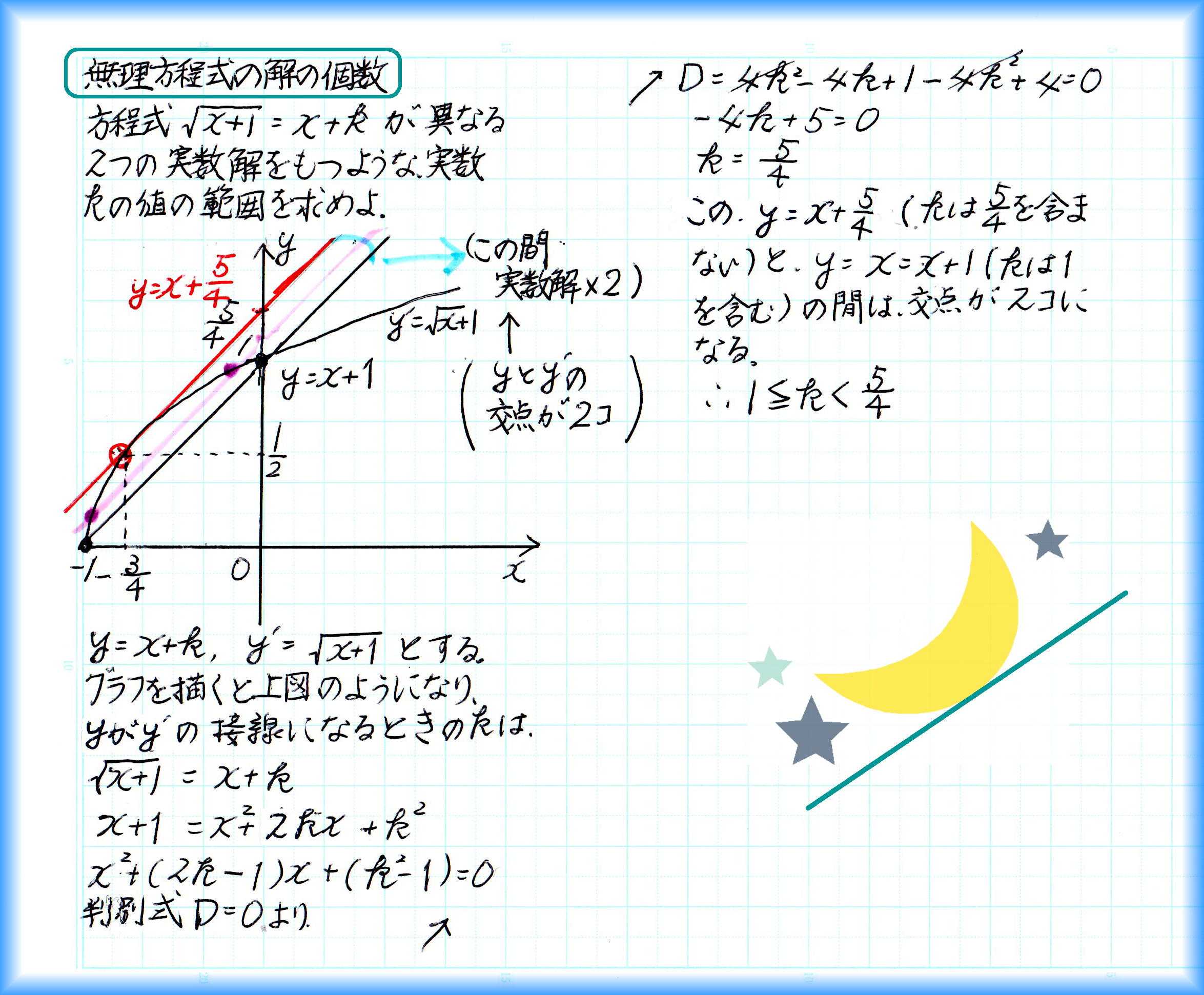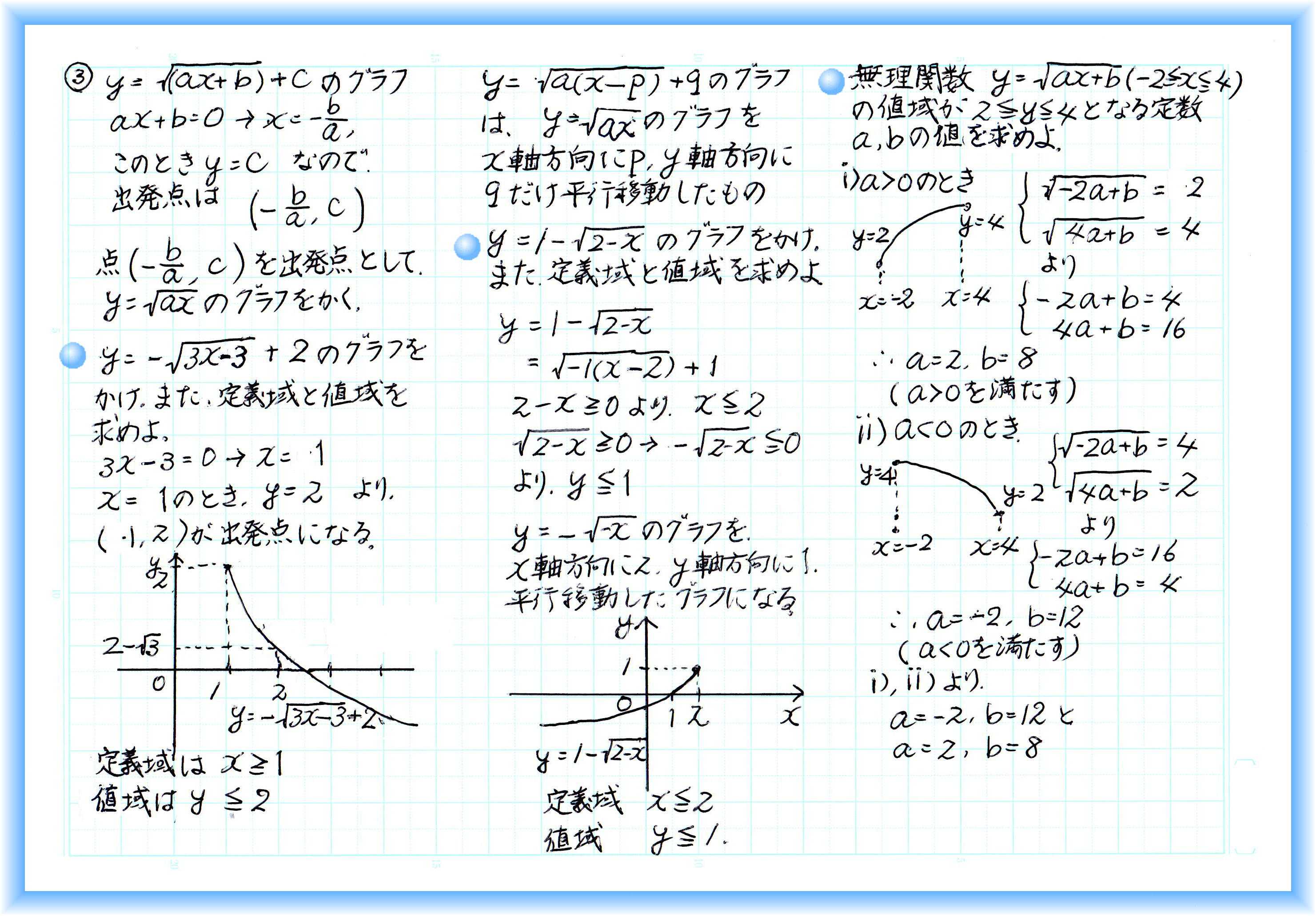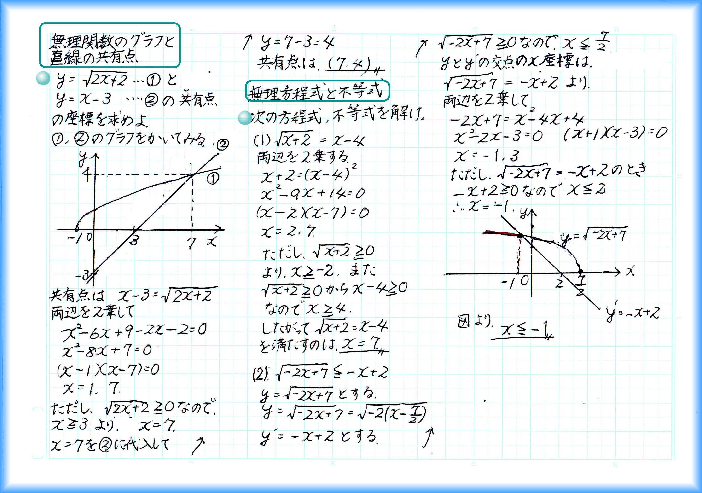 ![]() 無理関数は√(ルート)の中に変数を含む関数であり、√の中が定数だけである関数とは異なります。 無理関数のY=√Xのグラフは、Y=x²のグラフを直線Y=Xに関して対称に移動した形ですが、√の中は正数なので、定義域に注意が必要です。 ![]() 無理関数の方程式・不等式は両辺を2乗して√を外します。定義域の制約に留意します。 ![]()