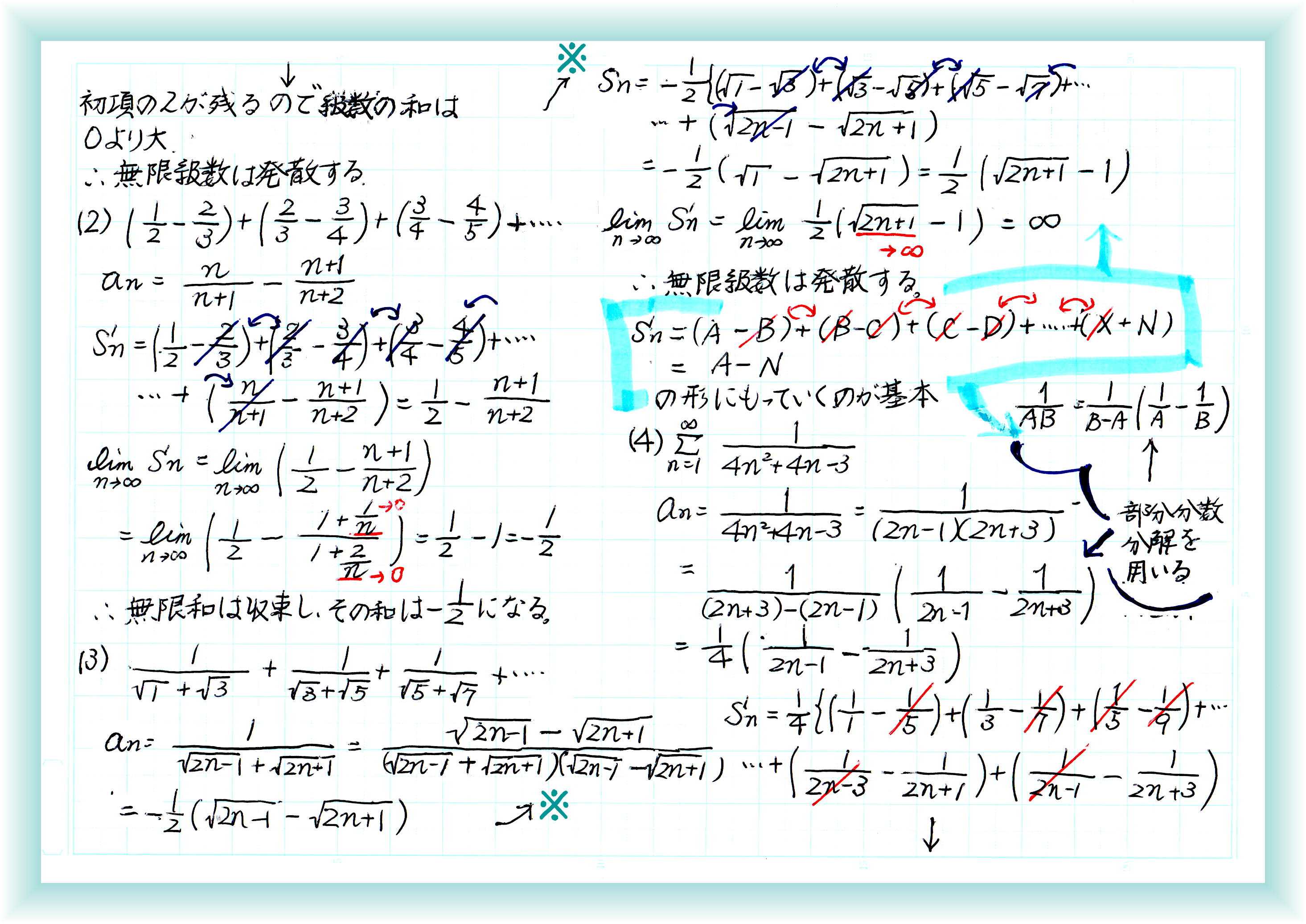 ここまでは、無限数列の項がどこを目指して変化していくのか、という話でしたが、ここからは「無限級数」つまり無限数列の和の話になります。 有限の数列でしたら、初項から末項までの値を足したものが「数列の和」です。無限級数の場合は、無限級数が収束するときのみ和が定義され、その和は級数の極限値になります。無限級数が発散する場合の和はありません。 ![]() ![]() ![]() 無限数列の和を求める基本は、部分和を求めてから、その終点を無限大方向に伸ばしていって1つの値に行きつくのか、発散してしまうのかを考えます。 また、数列が0に収束しなければ、無限級数も収束しません。単純に考えて、数列の項が正または負の無限大に発散すれば、和もまたどんどん大きくなるか、どんどん小さくなるかなので、発散します。 なので、数列が0に収束しないとき、級数の和を求めなくても、発散することが言えます。 お気に入りの記事を「いいね!」で応援しよう