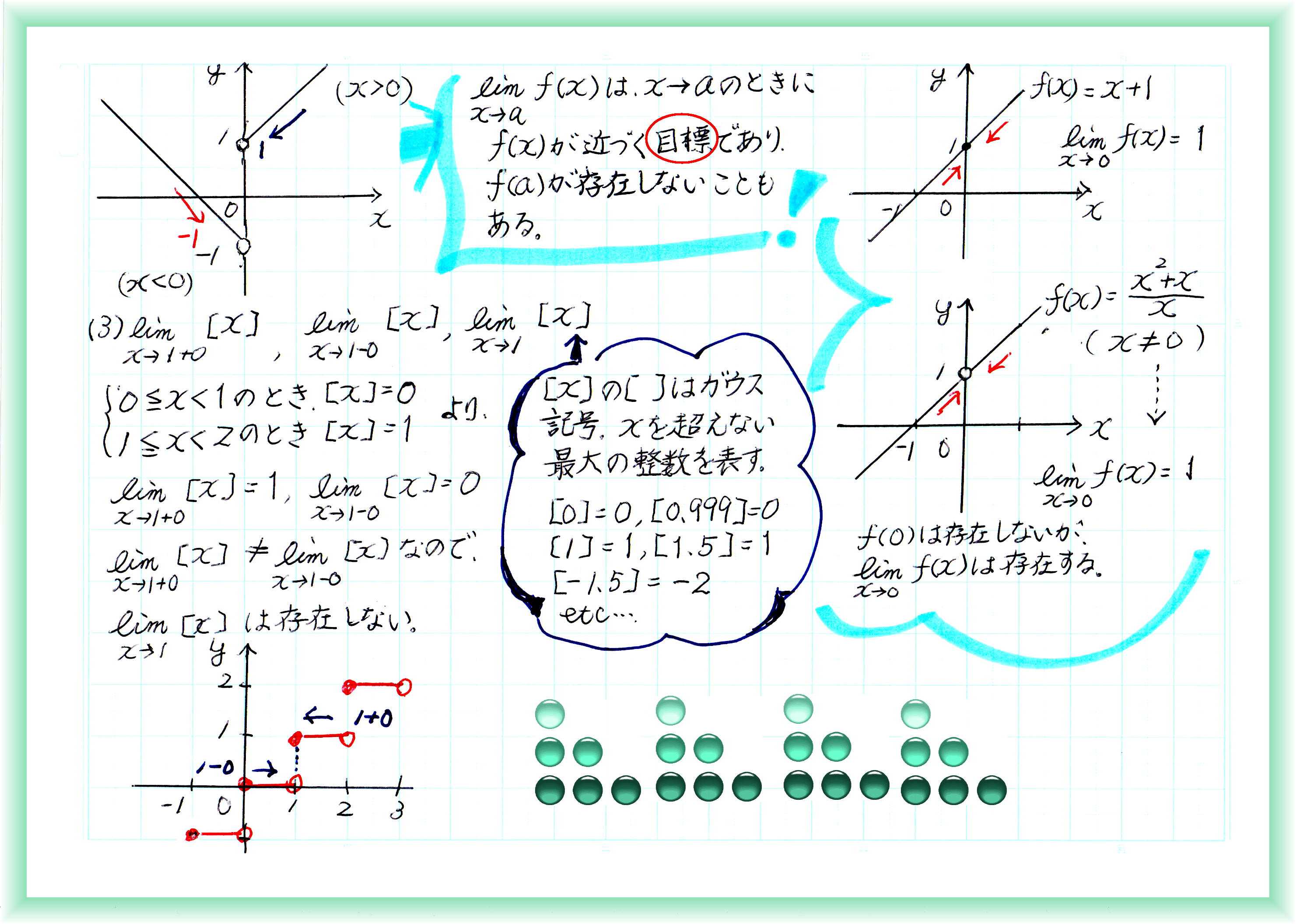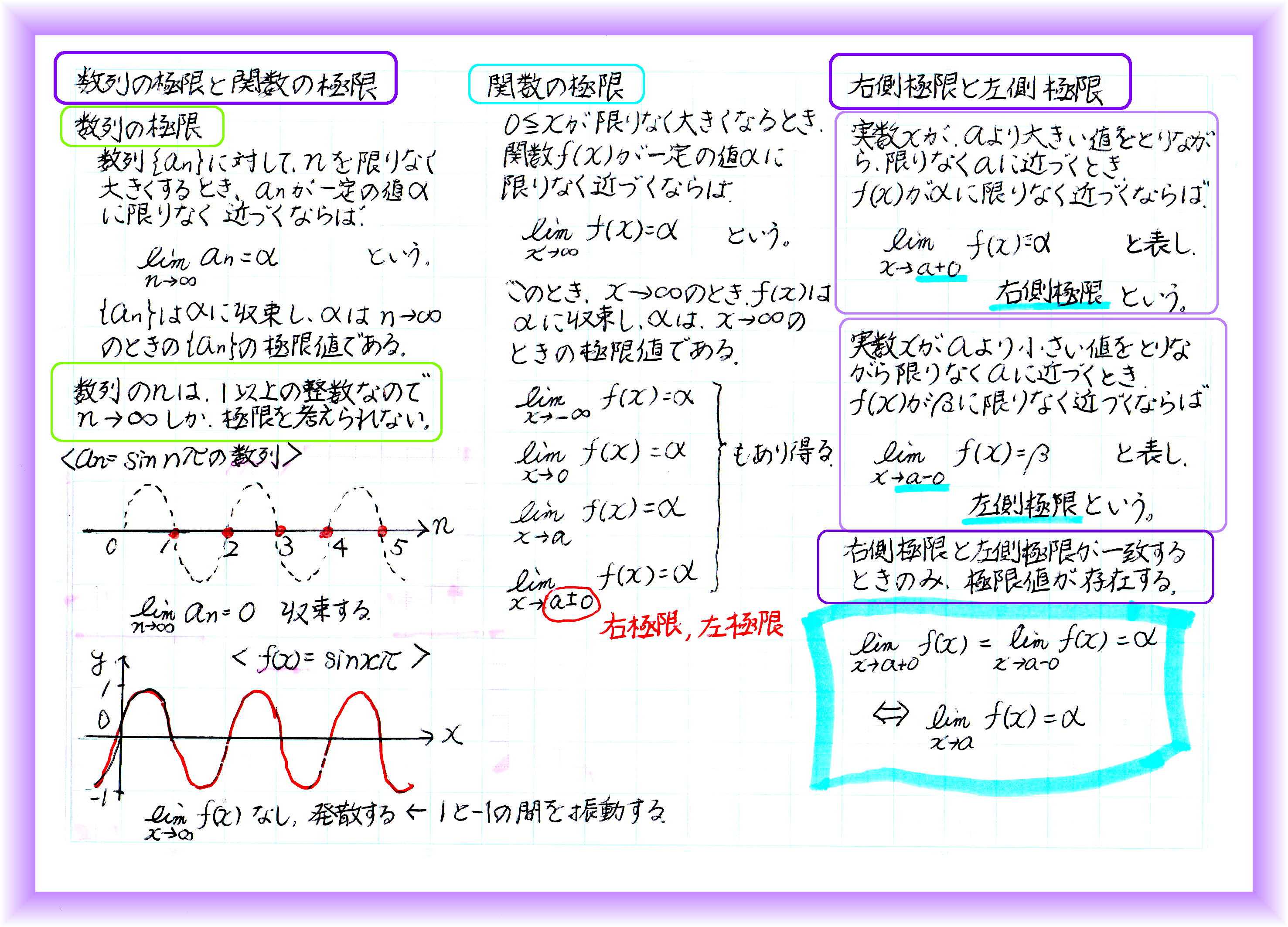 ![]() 数列の極限と関数の極限の違いをまとめておきました。 関数上のある点の極限を求めるとき、関数がその点で連続していれば、右左どちらから近づいても目標値は1つです。 でも、右から(大きい数から小さくなる方向へ)近づく場合と左から(小さい数から大きくなる方向へ)近づく場合で極限(目標値)が違ってしまうなら、双方の極限を調べる必要があります。 おなじみの反比例のグラフf(x)Y=1/xで、0に向かう極限を考えると、0でグラフが切れ、左右で全く違う値をとることがわかります。 このとき、0での極限値はありません。 ![]() ![]() 左右の極限が一致しないとき、その点での極限値は存在しません。 その1点が関数上にないときにも、左右の極限が一致すれば、一致した値が極限値になります。極限は、ジャストの値ではなく、あくまでも「限りなく近づく」「目指す」値だからです。 お気に入りの記事を「いいね!」で応援しよう