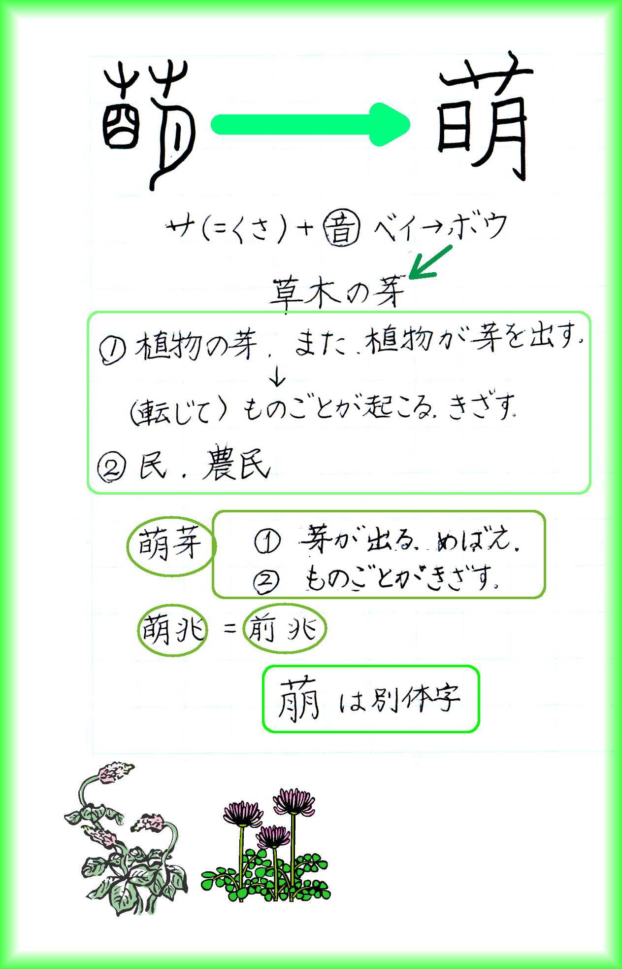 ☆萌…ホウ、ボウ、めば(え)、めぐ(む)、きざ(す)、も(える)、