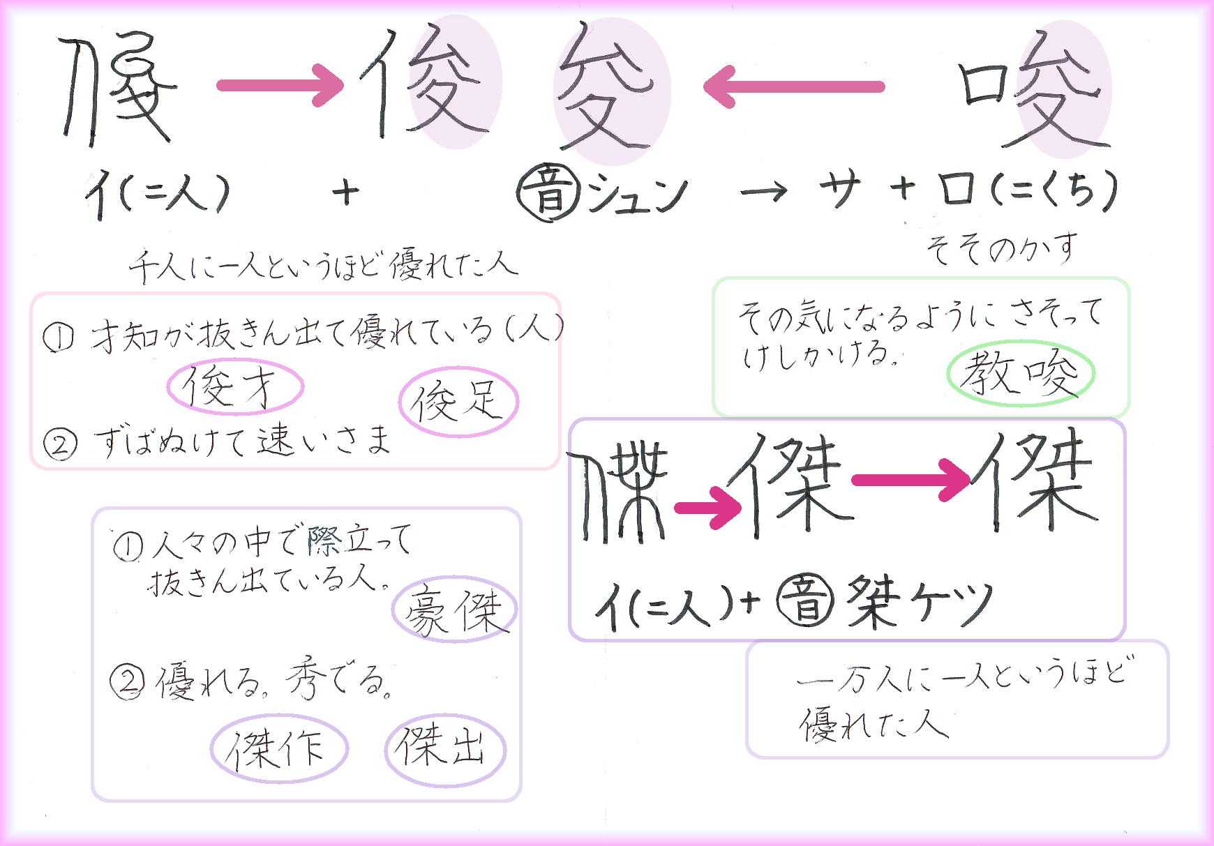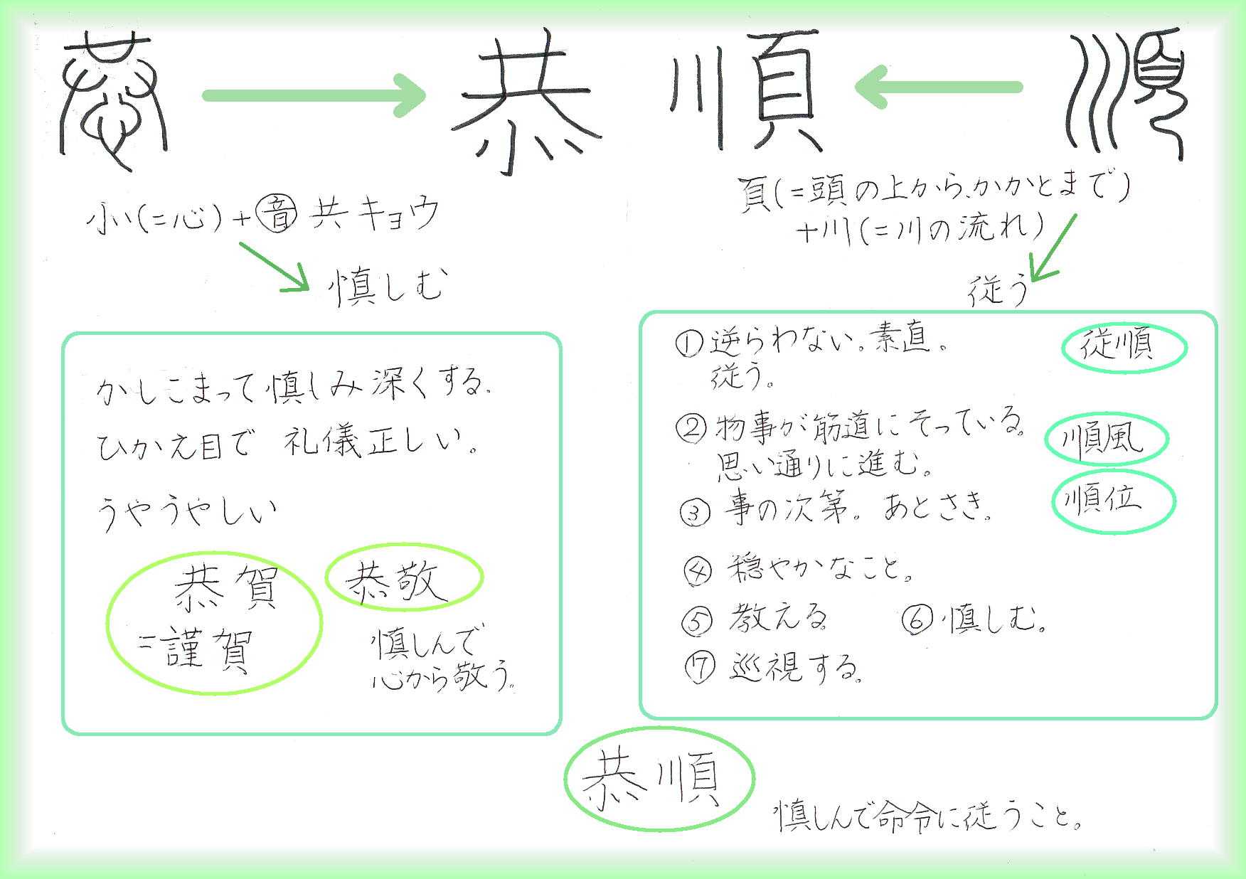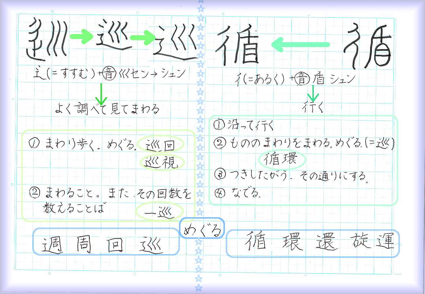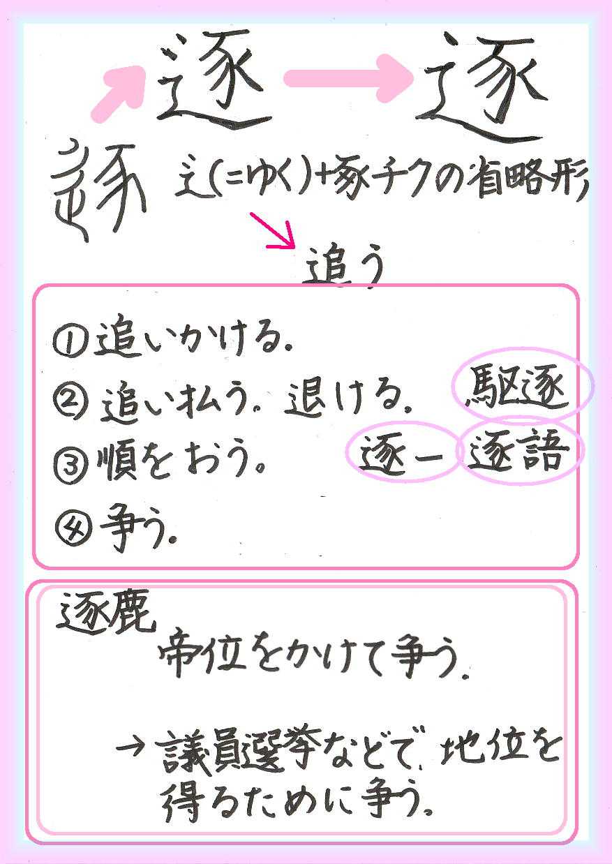 随…ズイ、したが(う)遵…ジュン 「随」は「随行」のように人に従う、お供するの意味、「遵」は「遵守」から見る通り、法やきまりに従う意味になります。 歴史で習う「遣隋使」の「隋」は、「隨」(「随」の旧字)とも書きました。「隋」は581~618年の中国の国名です。倭国から隋へ、技術を収得するため派遣されたのが「遣隋使」です。遣隋使、遣唐使は大阪、住吉大社で安全祈願をして出航になったそうです。 平安文学には「随身」(=貴族の外出に伴って警護に当たった近衛府の官人)がよく登場します。 枕草子に「雑色(諸家に召し使われる者)、随身は、すこしやせて細やかなる」(雑色や随身は、少しやせ気味のすらっとした人がふさわしい)「をのこはまた、随身こそあらめ」(男子の下仕えでは随身が一番似つかわしい)と言われています。 清少納言の私見ですが、公の場で貴族に付き従う派手やかな役割の職への思いが見られます。 「遵」は最近だと「コンプライアンスの遵守」という形でよく目にします。「コンプライアンス」は元々は法令遵守でしたが、より広く倫理、社会的なルールを守る意味になってきました。