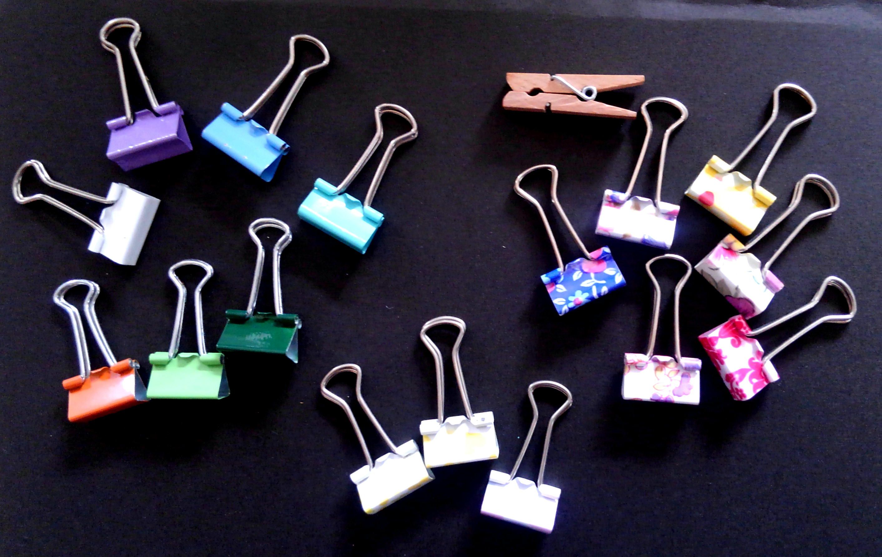 あれば便利な文房具 クリップ ほんの小さなものなのですが、あれば便利な文房具の一つ、クリップ。 100円ショップでも、黒色だけでなくハートや水玉柄が売っています。無地でもカラフル。絵の具箱のよう。洗濯ばさみ型で遊んでみました。お菓子やパンの袋の口を留めても、柄つきならおしゃれです。ビーズを通すときや三つ編みの仮押さえにも活躍してくれます。ゼムクリップも、形・色・大きさともいろいろ発売されています。 側にあると楽しくなるクリップたちです。 ただ、ポケットに入れたまま洗濯、乾燥機に入れないようにご用心。乾燥機が突然動かなくなったので、焦って修理相談窓口に電話したら、「クリップがドアの内側に付いていませんか?」と言われたことがありました。 おお、あった~。クリップと外したら動きましたよ。「よくあるんですよ」だそうです。
