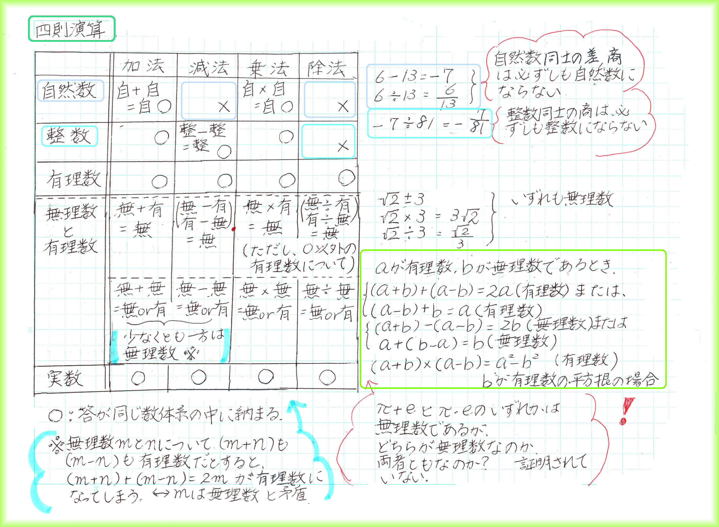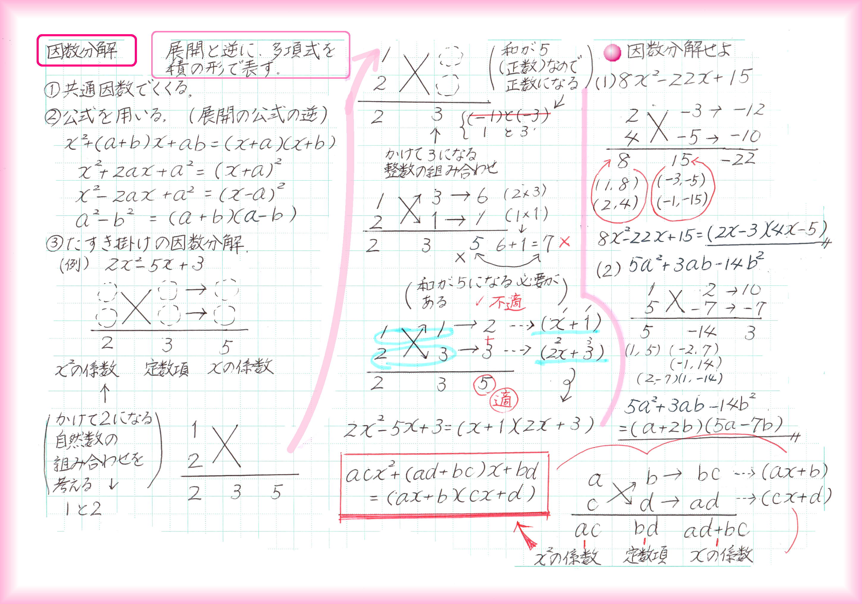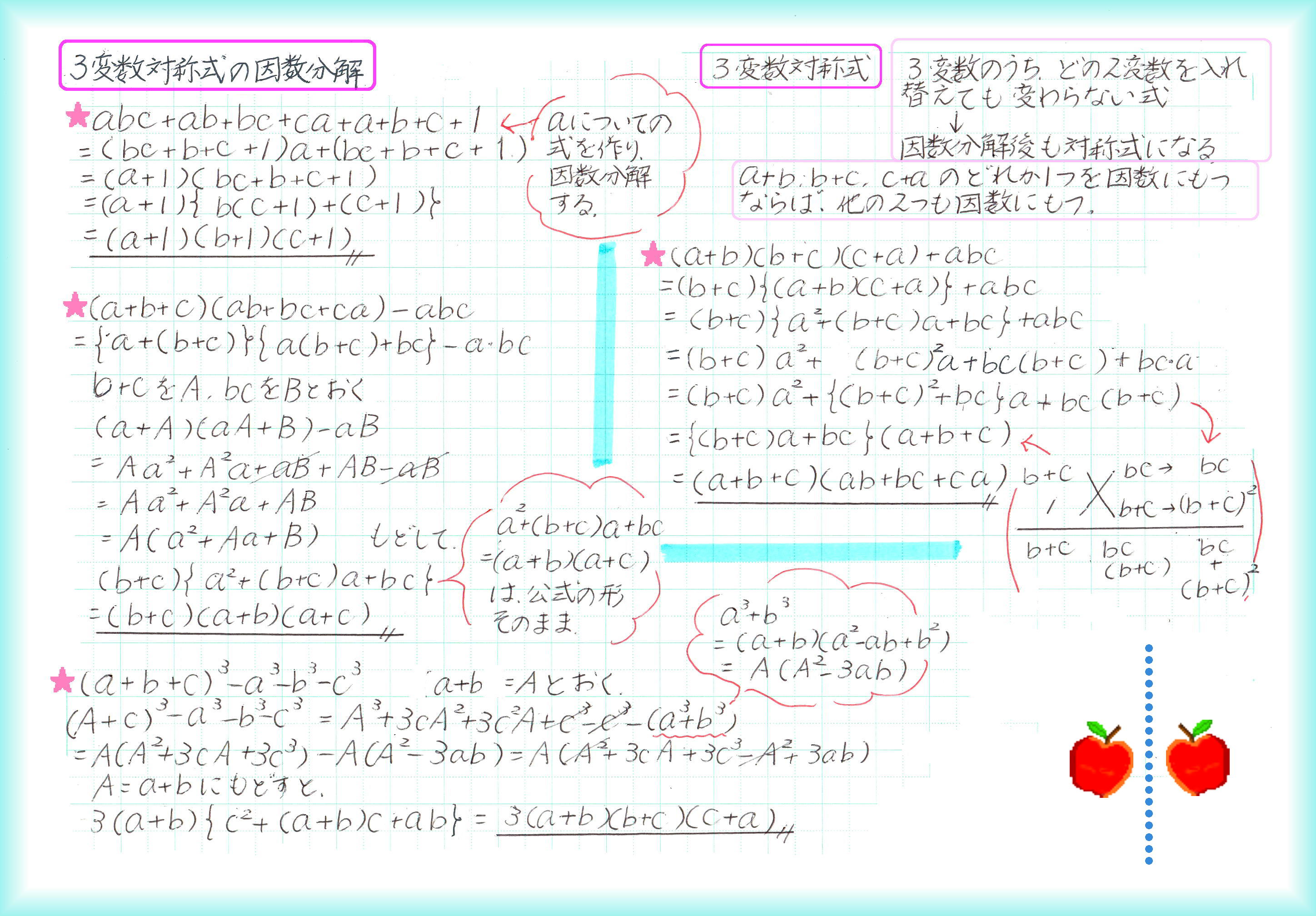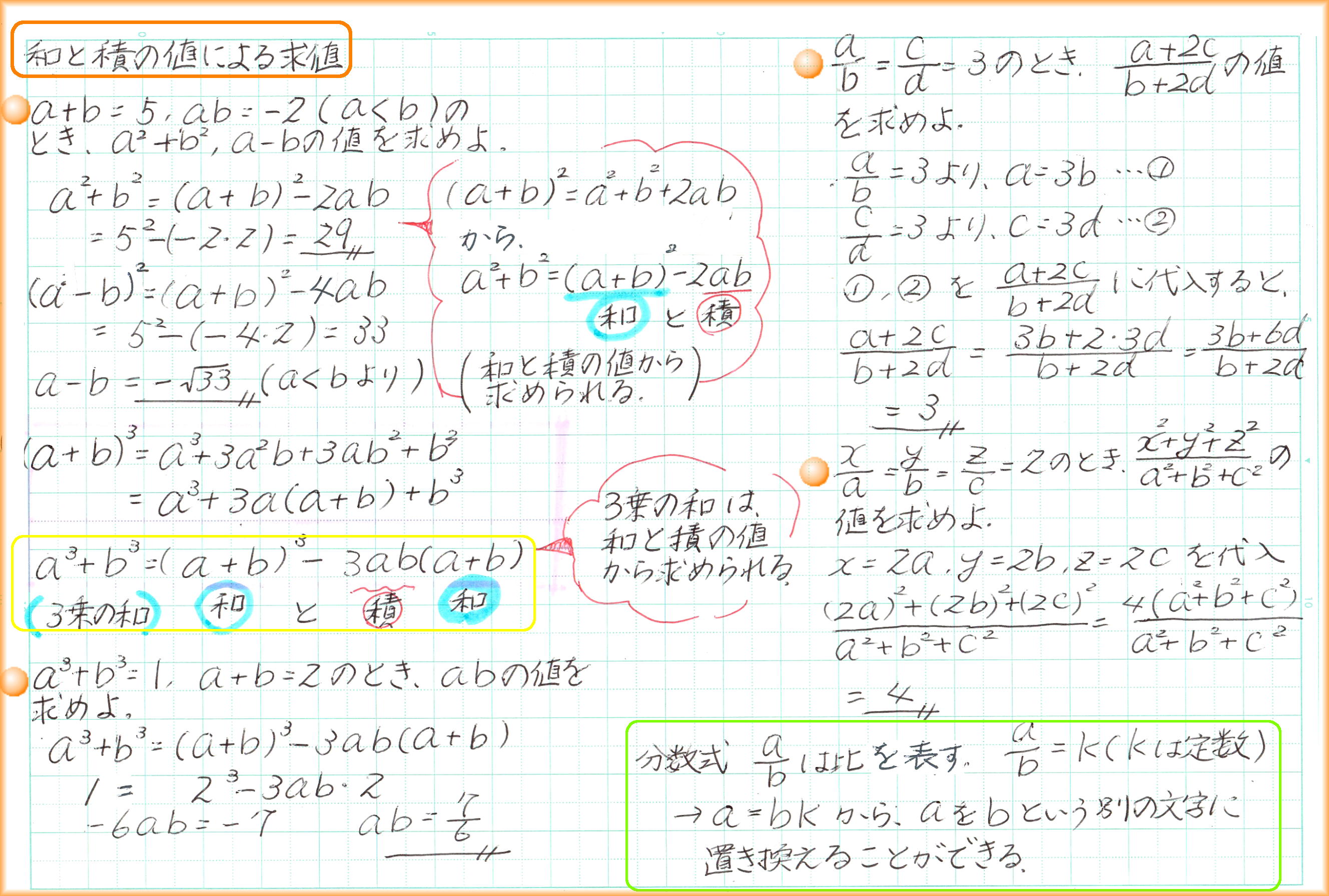 2数の実際の値がわからないときでも、和と積の値がわかっていれば、2乗の和、3乗の和の値が求められます。和と積の組合せに置き換えられる式なら計算できるわけです。 後から出てくる、二次方程式の解と係数の関係にも「和と積」が出てきます。実際の解が√がつく複雑な数であっても、方程式の係数が整数なら、「解と係数の関係」から、解の和と積は、必ず有理数です。 等式を証明するには、①1辺を変形して他方と同じであることを示す、②両辺を変形して同じになることを示す、③1辺から他方を引いて0であることを示す、の3つの方法があります。 臨機応変に一番楽に証明できる方法を選びます。この臨機応変が難しい!何事も実践あるのみです。