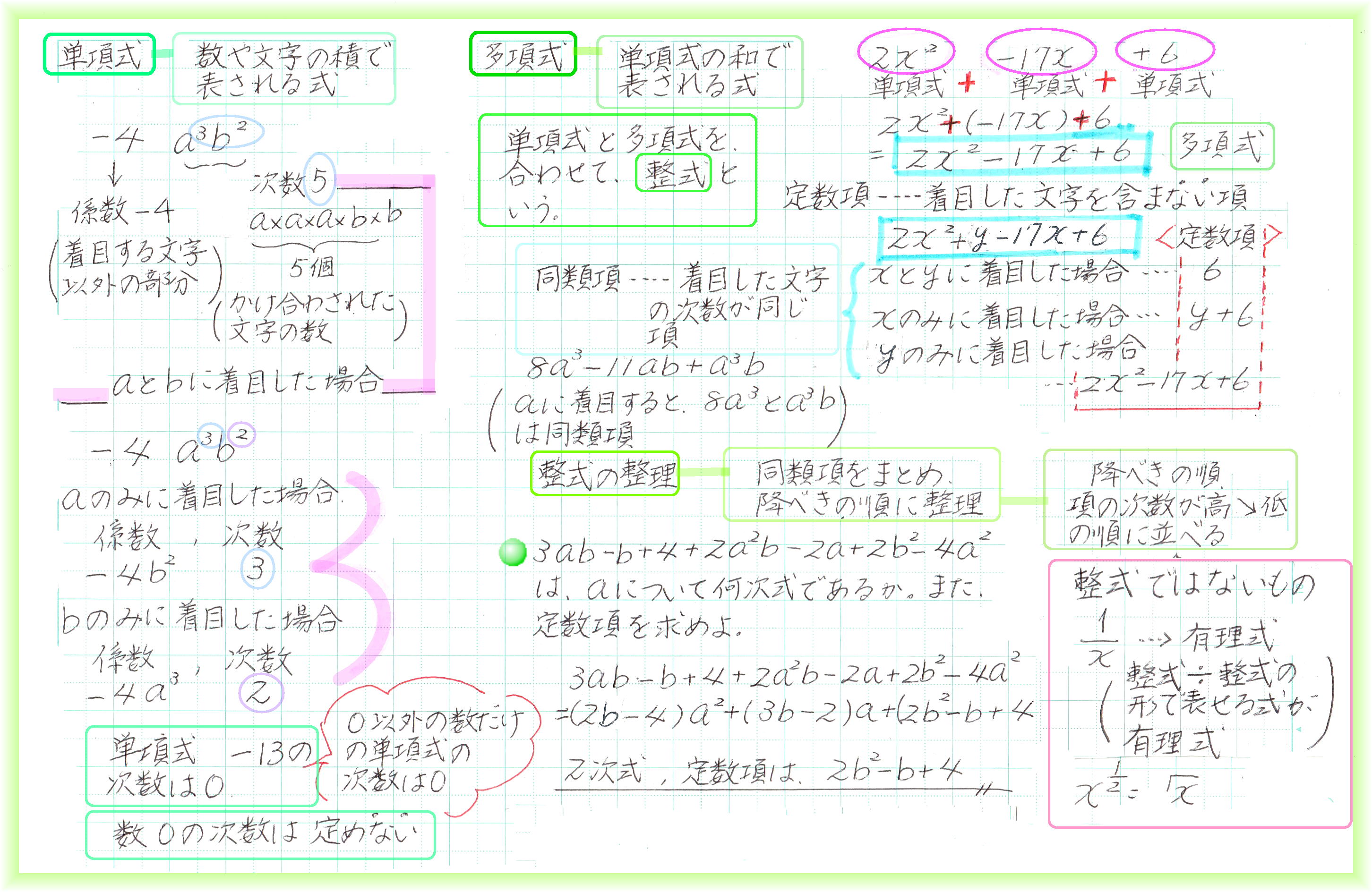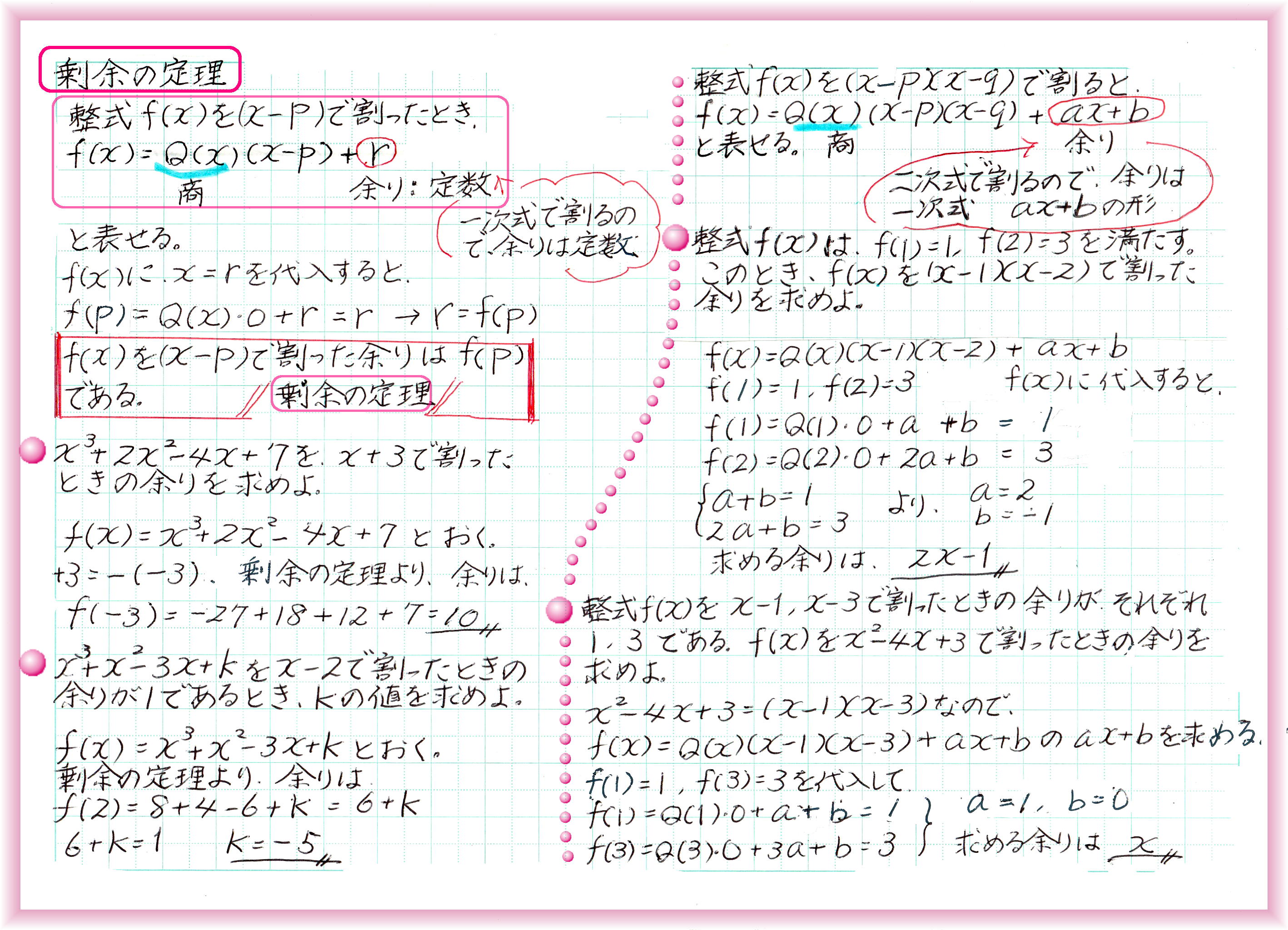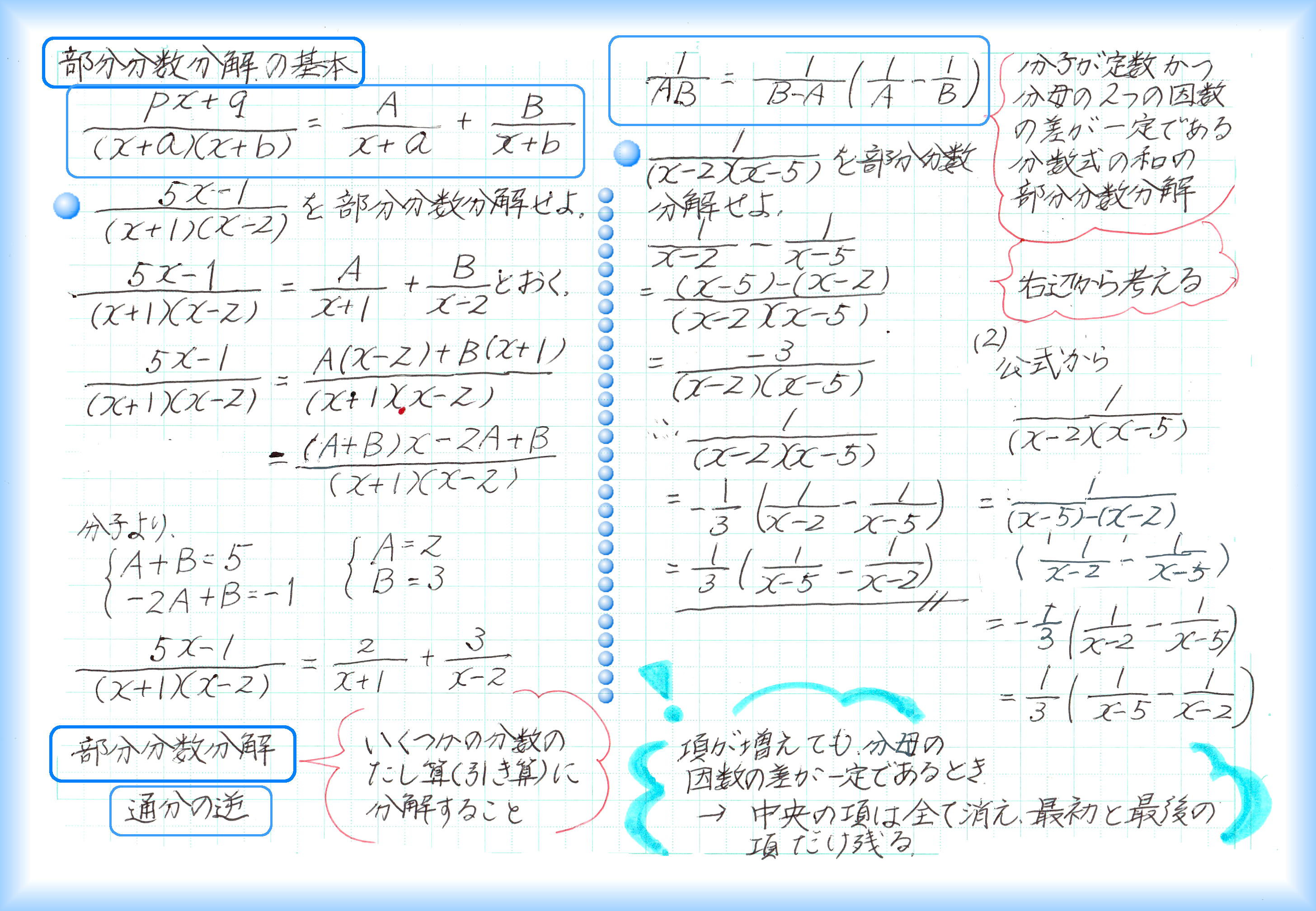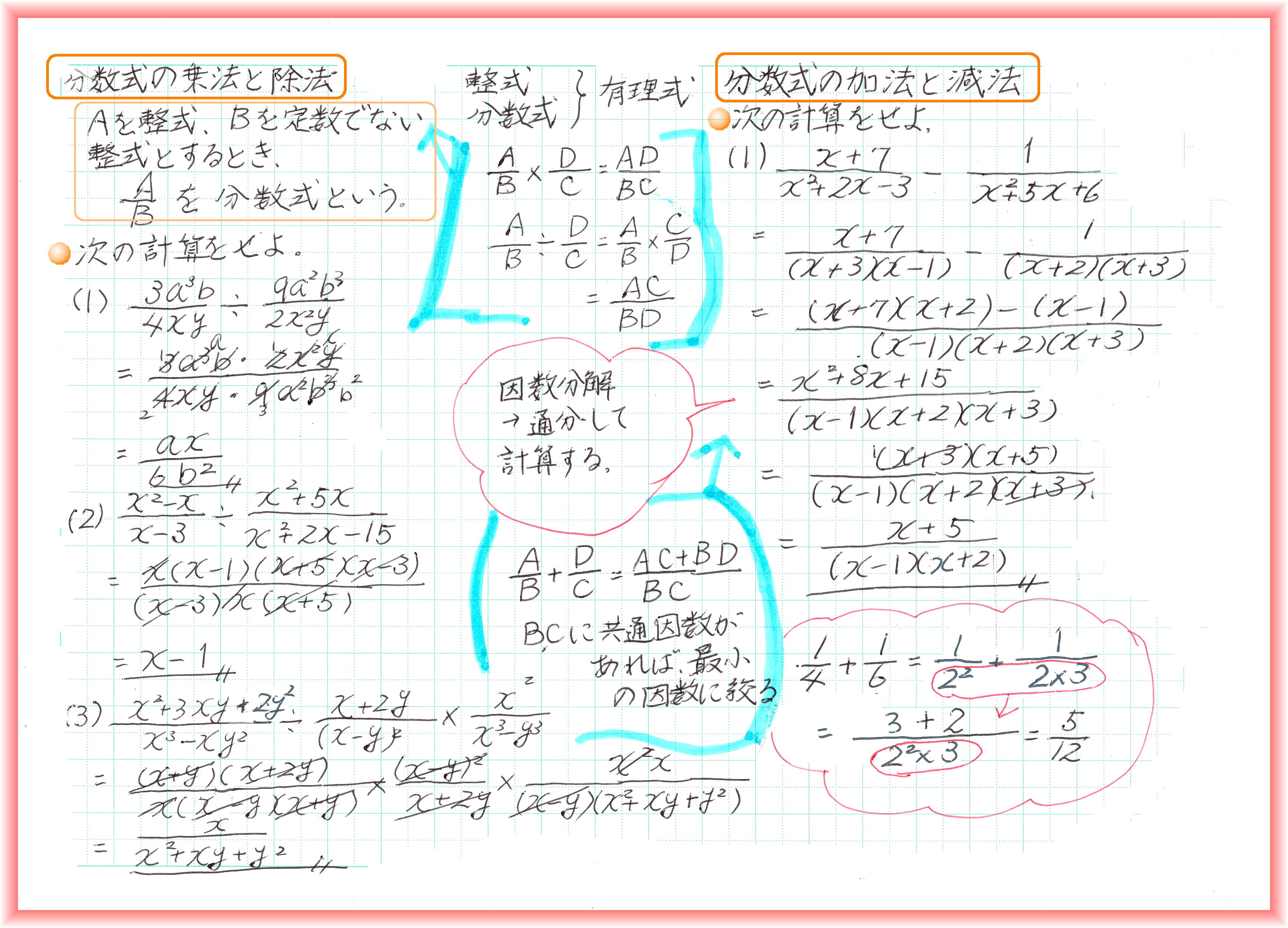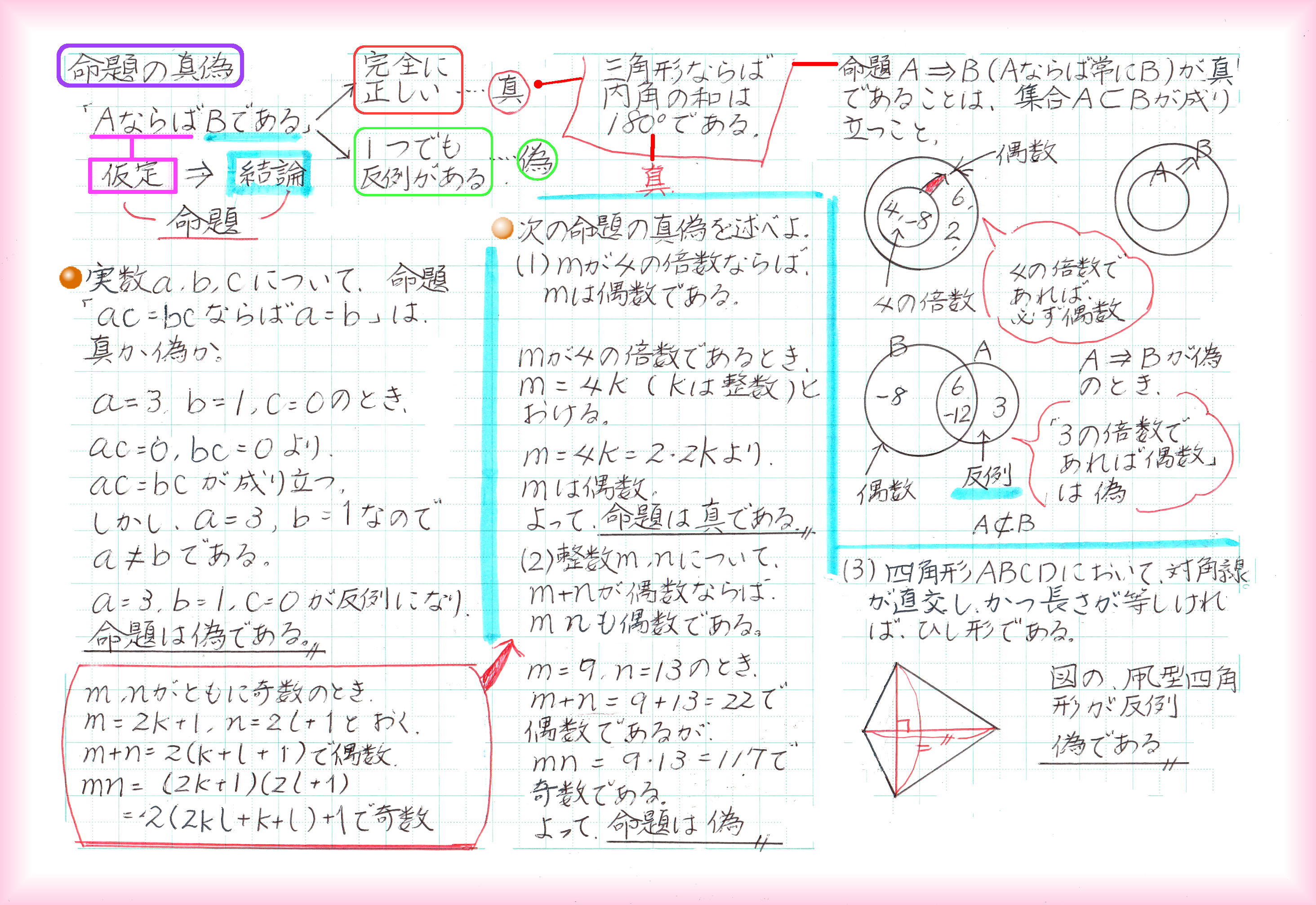 2数の実際の値がわからないときでも、和と積の値がわかっていれば、2乗の和、3乗の和の値が求められます。和と積の組合せに置き換えられる式なら計算できるわけです。 後から出てくる、二次方程式の解と係数の関係にも「和と積」が出てきます。実際の解が√がつく複雑な数であっても、方程式の係数が整数なら、「解と係数の関係」から、解の和と積は、必ず有理数です。 等式を証明するには、①1辺を変形して他方と同じであることを示す、②両辺を変形して同じになることを示す、③1辺から他方を引いて0であることを示す、の3つの方法があります。 臨機応変に一番楽に証明できる方法を選びます。この臨機応変が難しい!何事も実践あるのみです。