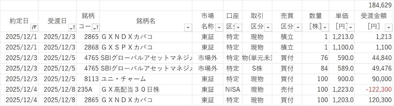 *履歴 ・ETF積立、税制大綱のおかげで、7148 FPGストップ安 内容が内容だけにあきらめて、年末大掃除 8897売却+ちょい足し ⇨ 9107川崎汽船、分割銘柄 9008京王、買付 7148 FPG PTSで狼狽売り ⇨ 3405クラレ、買付 3391ツルハ、ウェルシア優待無くなったので利確 ⇨ 株価同程度の 2897日清食品、買付 ストップ安明け、7148 FPG 寄り成、売却+ちょい足し ⇨ 5401日鉄、7272ヤマハ発動機 買付 8897 NISA分売却 ⇨ カバコ 買付、FPG 配当見込の穴埋め ついでに、5602栗本鉄工、単元化 ・福袋:4967小林製薬、優待取り、コスト約1,500円、優待5,000円相当 *決済 ・税制大綱がトリガーになって大掃除する羽目になったけど 損出し出来て、検討中6銘柄購入できたので良かったことにする 資金移動じゃなきゃ買わない株価だけど・・・ *ETF、カバコ1,000口目前に・・・ *インカム ・国内1、投信1 *損益推移 ・一千万の大台に、配当見込は銘柄入れ替えで微減 *リラ円 ・各口座10枚追加、またしばらく放置