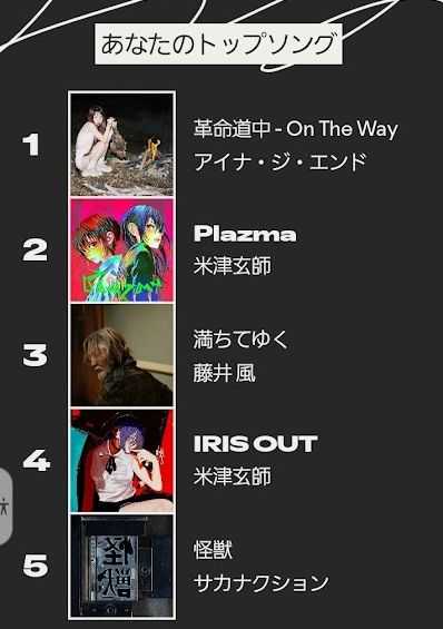 通勤中はSpotify (音楽のサブスク) を聴いていて 例年12月になると Spotifyが 「あなたの聴いた音楽まとめ」 みたいなのを作ってくれます。 ![]() 2025年 私がよく聴いたアーティストさんは こんな感じでした ![]() 1位は 米津玄師 ちょっと意外でしたが まあ、米津さん 今年もアニソン たくさん歌っておられます ガンダムジークアクスのPlazmaも よかったけど 劇場版チェンソーマンの挿入歌 JANE DOE 宇多田ヒカルとのコラボ曲 切なくてめっちゃ好き。 IRIS OUT / JANE DOE(通常盤)/米津玄師[CD]【返品種別A】 アニソンじゃないけど 新しくヘビロテに 加わったのは 「なとり」さんかな。 (おつまみではない) 絶対零度 (期間生産限定盤) [ なとり ] 2025年よく聞いた曲 ![]() 堂々一位は アイナ・ジ・エンド 革命道中 この曲めっちゃ好き。 アニメのOP動画も好き。 今年のアニメのなかで ダンダダンは 圧倒的に面白かった! 【オリコン加盟店】[MV盤]アイナ・ジ・エンド CD+Blu-ray【革命道中】25/9/3発売【楽ギフ_包装選択】 アイナ・ジ・エンドって 意識してなかったけど 水星の魔女のEDとか 薬屋のひとりごとのOPとか けっこうアニソン歌って いらっしゃるのね サカナクションの「怪獣」は アニメ「チ。」の主題歌でした。 壮大なテーマにぴったりの美しい曲 作品もすごかった チ。-地球の運動について- セット 1-8巻【3000円以上送料無料】 ちなみに合計再生時間は 27日相当だそうです ![]() Spotifyさんによると 私の「好きなジャンルは絞り込めない」 という回答でしたが リスニング年齢は 21歳だそうです。 ![]() あははは。 アニソンをメインで 聴くからですね。 ちなみによく聞くポッドキャストは もちろん! TBSラジオ 「安住紳一郎の日曜天国」です あなたが今年一番 たくさん聴いた曲はだれの、 どんな曲ですか?? ■本日もご訪問ありがとうございました■ お気に入りの記事を「いいね!」で応援しよう