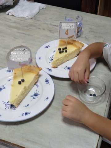 ![]() 4歳の孫次男ちゃん(息子の子)と、蚊対策をして庭に出る! 「紫色になってるのが甘くなっておいしいよ」 と、食べごろのブルーベリーを摘んでもらう ![]() コストコで買ったチーズケーキに 「いくつずつ飾れる?」 と、数を数えながらトッピング ![]() 自分のに6個、にぃにに5個になってしまった 食前準備の特権...つまみ食いを教えちゃおうか?と、頭をよぎったその時 「ばぁばにあげる!」 ですと ![]() 息子と娘を育てている時に意識してきた「多くの体験、なんでも体験」 孫で、また味わえるなんて、幸せ♪ しか~~し! 息子と娘が同時に帰省して来ていると、 「お風呂入れてやって~」 とかとかで 夕飯の支度に私の出番はない!=食育のチャンスが回ってこない! ![]() 子供たちは食べるのが好きで料理も大好き ![]() UPした写真の中で、私が作ったのなんて、 彼らが来る前に仕込んだきゅうりのQちゃんもどきのみ! ![]() 当初は寂しさも感じたけど、 あぁこれも我が子の食育に成功したってことね♪ と、ばぁば業を楽しんでいる