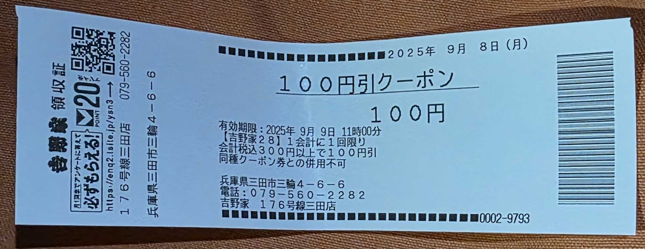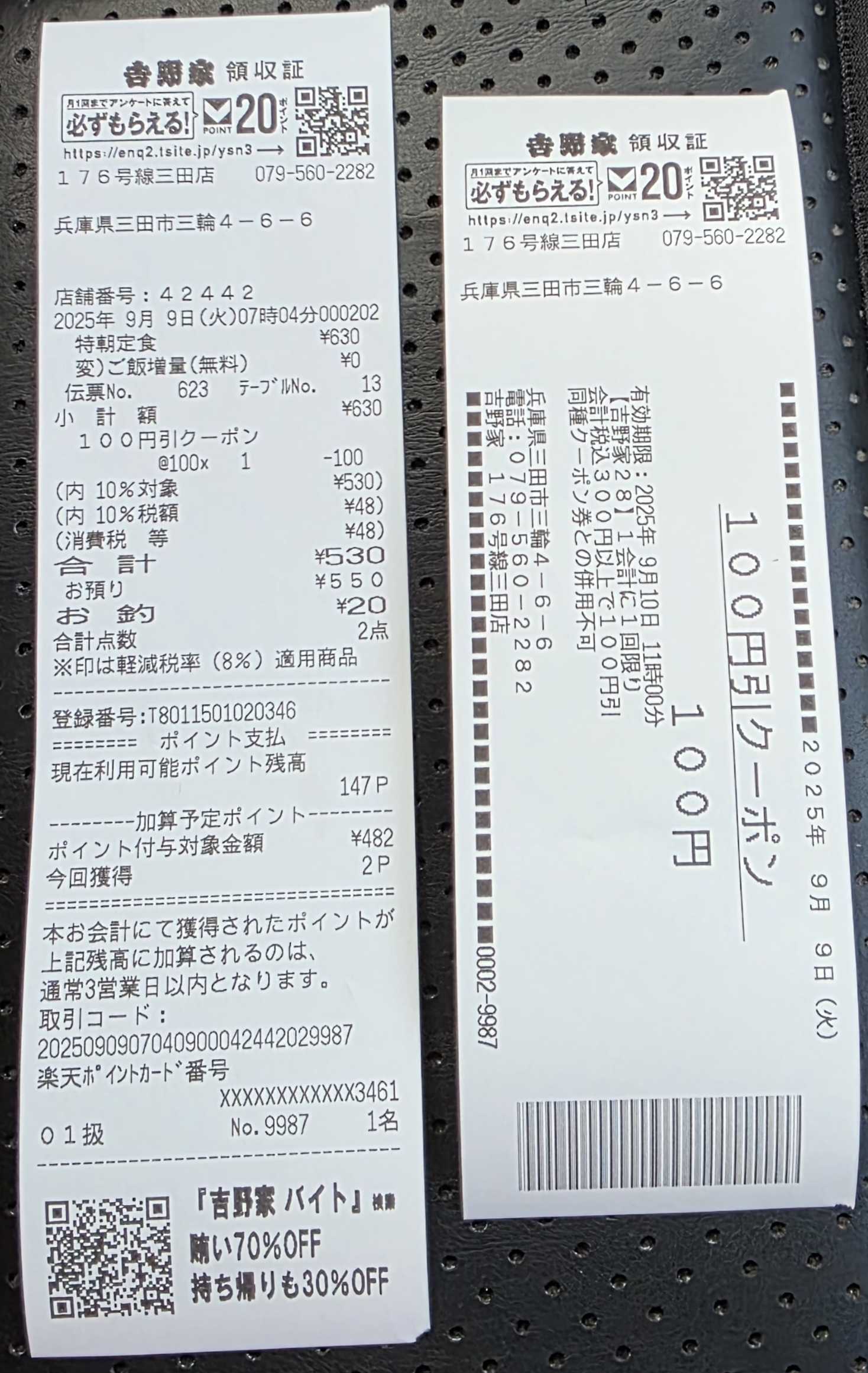 昨日から?始まってる? 吉野家さんのキャンペーン? 朝食べたら次の午前中まで使用出来る 割り引きクーポン 早速使わせて頂きました 本日から・・・ 基本 特朝定食がっほぼワンコイン ¥530円 にっ 吉野家さんの回し者じゃないですが~~ 私の人体実験に合わせた様に 有り難い話です レジ会計の時に 「・・・本日も出ます(笑)約1ヶ月位? チリも積もれば・・・って感じですかねぇ~」 っと言われ 「いえいえ~有り難い話ですぅ~ ごちそうさま~」 っと店を後にしました 毎日通うと~~¥3,000円のお得です