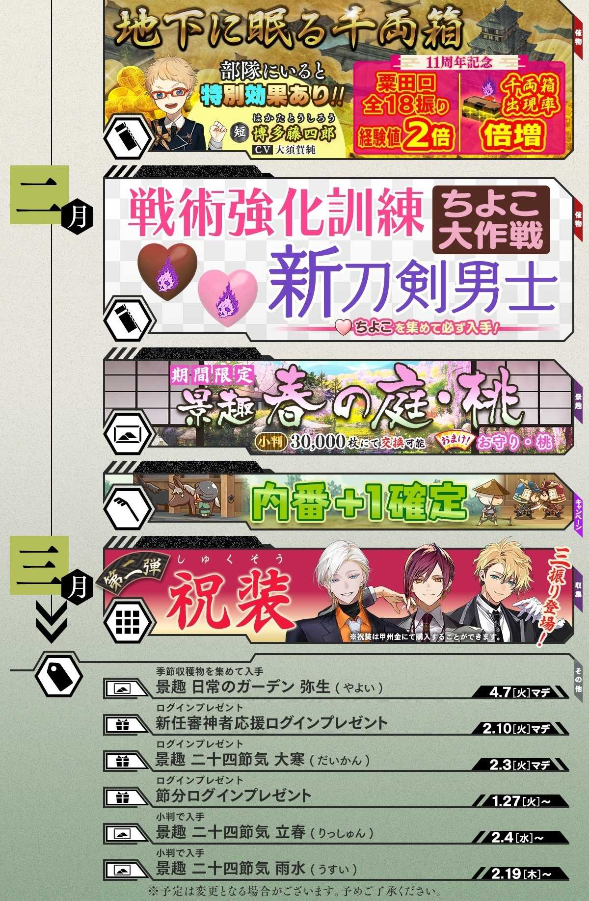 大阪城始まりましたね♪ とりあえずいつも通り博多含む極・鍛刀6振りで99階まで掘りました。その間白山吉光ゼロでした(´;ω;`) 今回でもう19回目!自分でも驚きです。 ![]() この後はちよこ大作戦かぁ。来月はバレンタインですね♡ ![]() 二筋樋貞宗の内番会話です。警察官のセリフですね。 横のドMさんのセリフw ![]() ![]() ![]() ![]() ![]() ![]() ![]() ![]() 今年は梅祭りに花丸イベントあるんですね↓ ![]() スタンプラリーにコラボカフェ、光忠駅長( ・∇・) 行こうかなぁと考え中ですが、何より燭台切光忠の刀身を見に行くのが最大の目的です(  ̄▽ ̄)♪ へし切長谷部は札幌遠征展示の時に見たし、次はみっちゃんですね。徳川ミュージアムで会えるのを楽しみにしています。 1月も今日で終わりですね。当本丸にも春が来たようです。 ではではまた(。・ω・)ノ゙♪