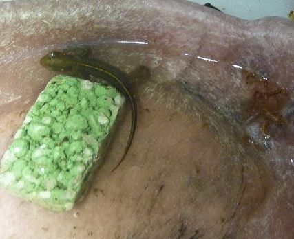 飼育ケース大掃除後、18年生まれ組には水場を復活。昨年も一度入れたのだが、そのまま汚れるだけだったので取り出していた。イモリたちを入れる時、意地悪をして、水場に入れていく。どれも慌てふためいて、水場から出て行く。しかし、一匹だけ残りました!しばらくして、ゆっくりと体が少し水につかるように入れていたブロックの上に乗っている。外には出なかった。そして、今日は完全に水の中に入っている。水中生活を始めるか?(他の4匹は近寄りもしない・・・)