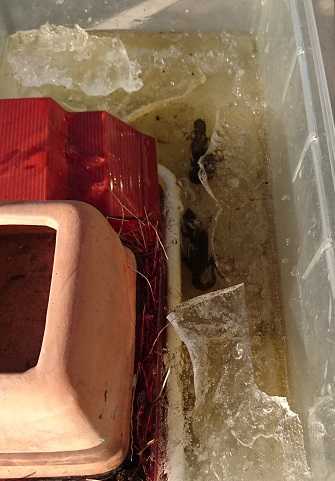 後ろの車が車間距離を詰めてくるので怖かった。 みんなゆっくり走っているのに・・・・。 夜中も寒い。 今朝イモリのケースを見ると、 ![]() 水の上部が凍っている!!! 外の倉庫みたいなところに置いている。 9年間置いていて凍ったのは初めて。 家の外のバケツの水は凍ったりするがこの場所では凍らなかった。 今朝の最低気温はー8℃とか-9℃とか。 とりあえず、氷を砕く。 動き出したので生きてはいた。 ![]() 上に上がってシェルターの中で冬眠してくれたら良いのに・・・・・。 お気に入りの記事を「いいね!」で応援しよう