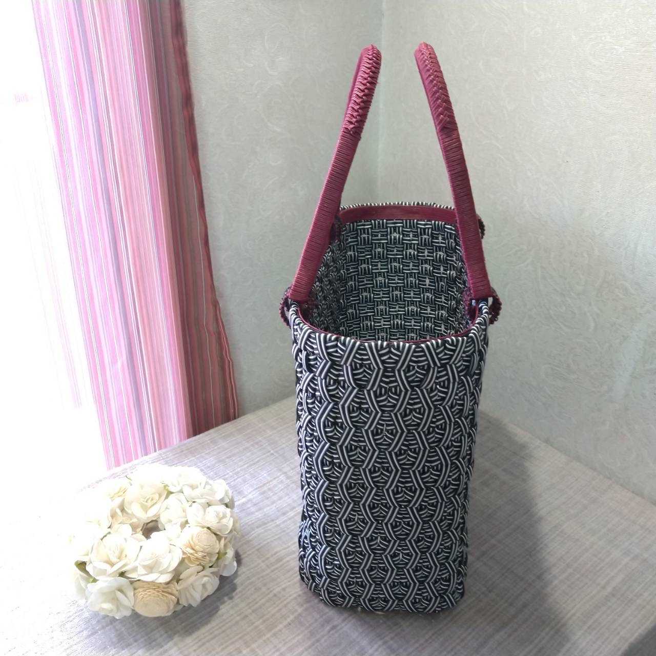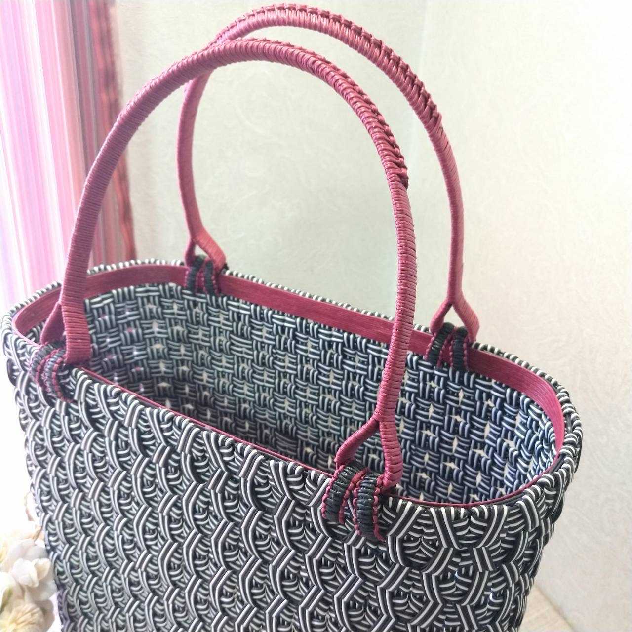 ブロック編みで裏模様を表に出す編み方は、初めてでしたが、思ったより編みやすかったです。 もちろん表目で編む方が編みやすいですが。 この穴のない石畳編み、ブロック編みとか、連続四つだたみ編みとか、色んな言い方がありますね。 今回のBAG、最後まで持ち手のカラーで悩まれてました。 黒にするか、赤にするか?! 私としては、黒白でまとめるのが良いかと思ってましたが、赤を選択されました。 赤にする限りは赤の印象を引き出さなくてはいけないので、持ち手のデザイン・付け方等に悩み、 いろんなパターンを試してみた結果、この様に完成させました。 内側の縁に赤のラインを入れることで、赤の印象が増し、よりよい感じに纏めることが出来たと思います。 ![]() 今回のオリジナルの新しい試みは、結び編みで終る(縁を別で付けない)タイプのBAGなので、 縁の補強の仕方と、持ち手を付けてるリングの巻き方の部分でした BAG口が潰れると、BAGの形状がどうしても扇形になってしまいます。 それは好みではないという事でしたので、 使ってる間にバッグ口が潰れてこない様、しっかりと補強を施しました。 更に赤い紐を内側に貼ったのも、補強を兼ねています。 ![]() そして、持ち手を付けているリングの巻き方ですが、 縁が赤で、中に黒のラインが出るように紐を結びました。 2色の紐で平結びをする事で、こういうデザインになる事に気が付いたので、今回試してみました。 このリングの色合いが、BAG本体と赤い持ち手の繋ぎ部分として、とても良い仕事をしていると思っています。少し黒を入れることで、締まるし、赤の色も引き立ちます。 今回一番気に入った部分です。 ![]() ![]() ![]() あとはニスを塗って終了です。 お渡しするのが楽しみです。