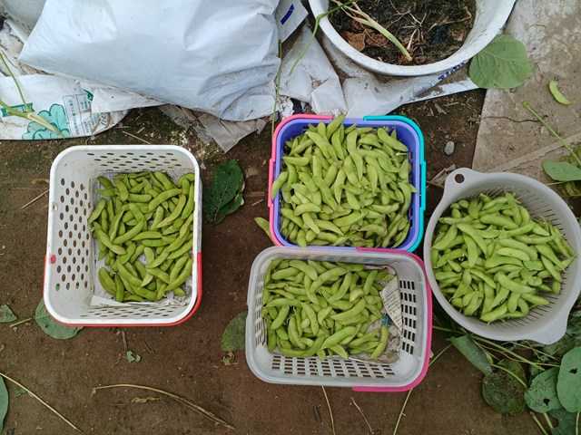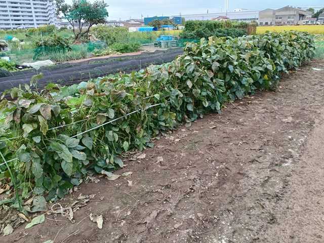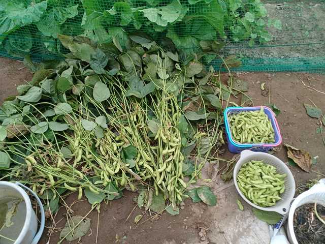 同じように播いてもいつも肴豆の方が早く実が大きくなります。 丹波の黒豆は莢や豆が大きいので、実が充実するまで時間がかかるのかなと思っています。 肴豆も実の色が少し黄色っぽくなるものが多くなってきました。 そろそろエダマメとしての収穫は終わりです。 ![]() 木を切って莢を外しました。 ![]() 黄色いものと緑のものを大まかに分けて、黄色いものは干して大豆にします。 丹波の黒豆も莢の太ったものから収穫を開始しました。 右奥の大きな木が丹波の黒豆です。 ![]() 左の1かごが丹波の黒豆、右3かごが肴豆です。 ![]() 肴豆は1株は木である程度熟させて来年の種を採る予定です。 ![]() ランキングに参加しています。 クリックよろしくお願いします。 にほんブログ村