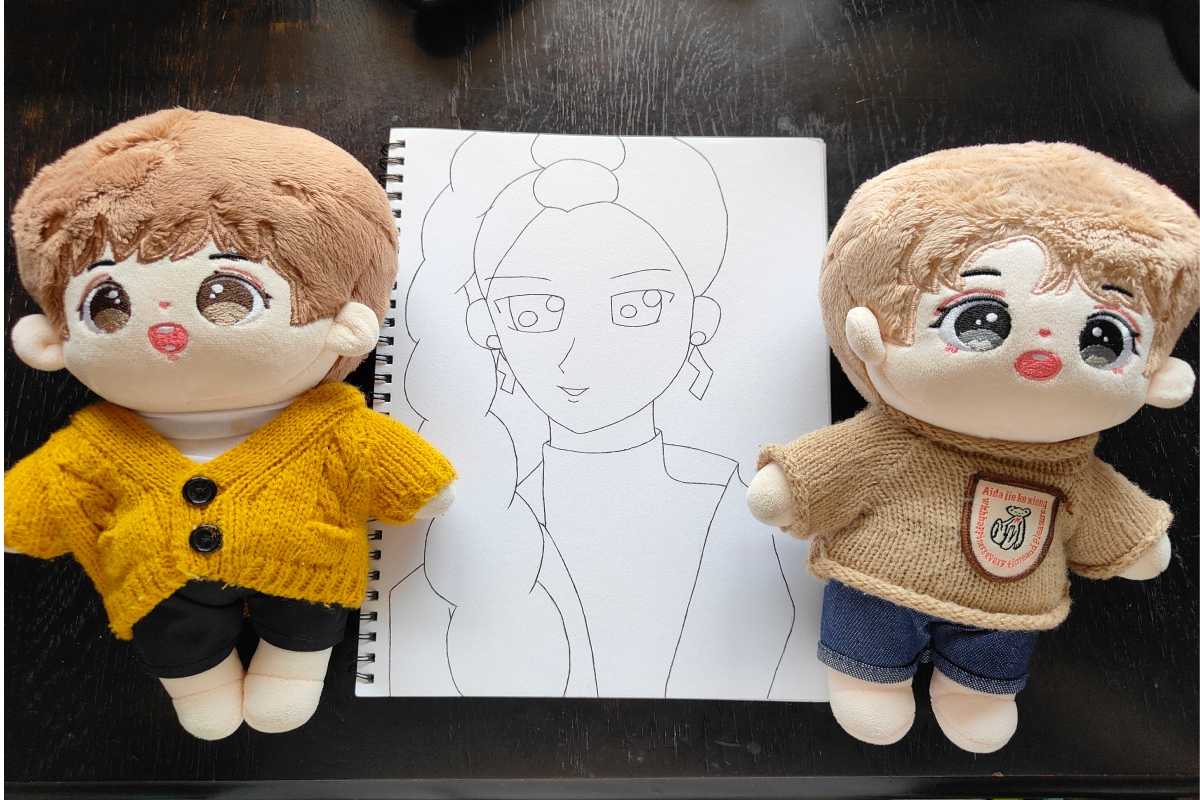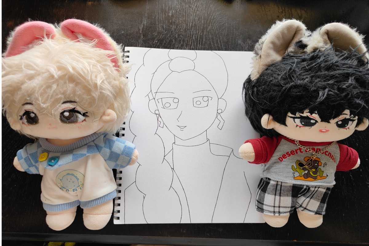 今日1日ボールペンで仕上げて、その後スマホでスキャンし、その後はぬいちゃんたちとぬい撮りしました。 デジタルで描いた完成品のHunt/rxのRumi💜 記念にぬい撮りしました📸🧸