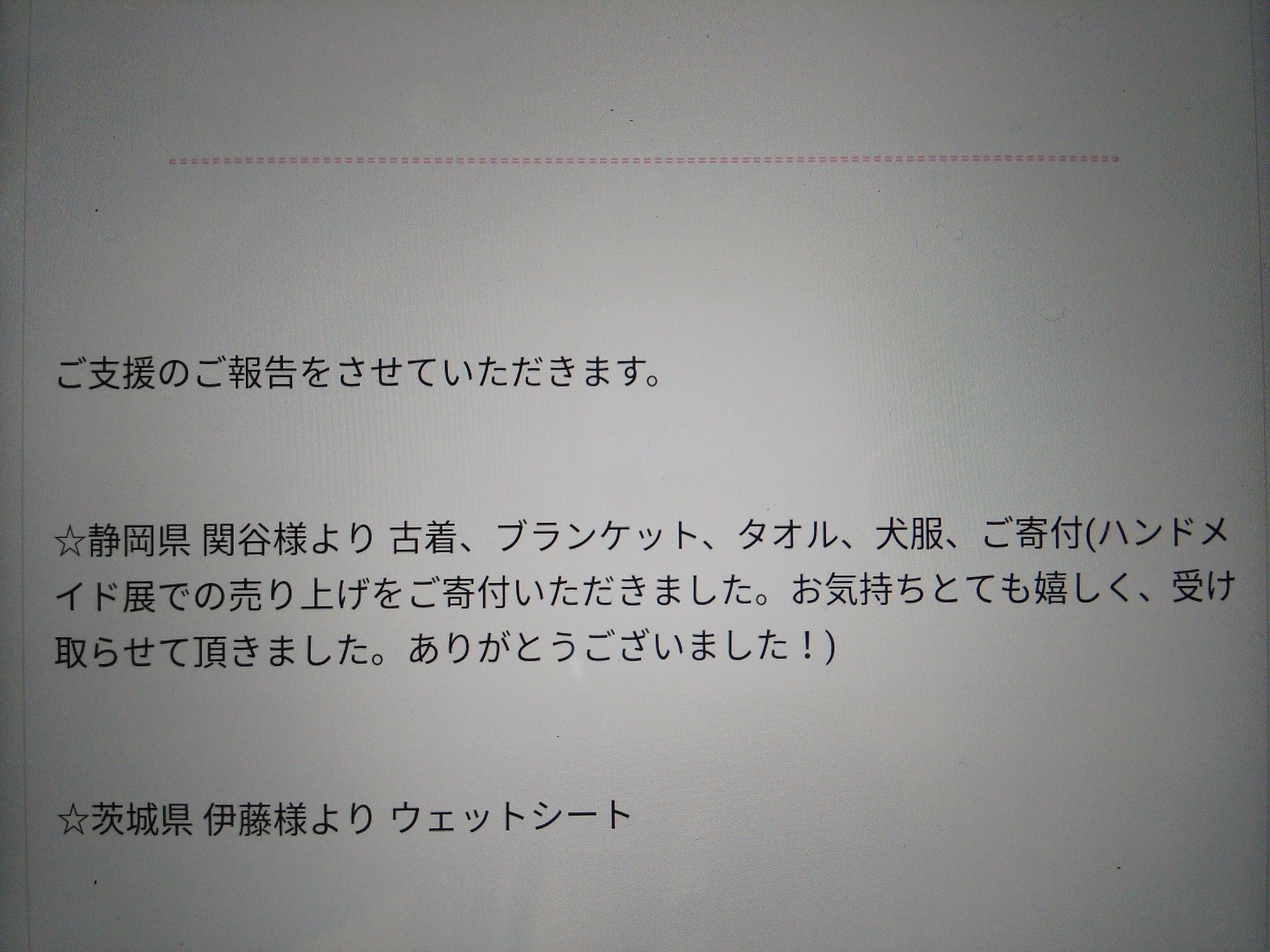 先日第5弾で「フェアリーハウス様」にタオル類とハンドメイド展での編み猫の売上2,000円を寄付したことはお知らせ済みですが、フェアリーハウス様ではこれらの支援を頂くとブログ上でお礼を掲載しています。