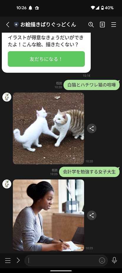 ![]() 現在アニメーターのしごとを脅かすと噂のAI作画 LINEであったので試してみました 友達登録するだけです あとは文字を送ると絵が生成されてすぐに返ってきます とにかくスピードが早いです ただ精度が微妙・・・ ![]() どのように指示すれば思い通りのもので返ってくるのかまだ色々試す必要ありそうです とりあえずは自分にはあまり必要無さそう 著作権とかどうなるんでしょうねー とりあえずは身近にAIを感じるいい機会でした お気に入りの記事を「いいね!」で応援しよう