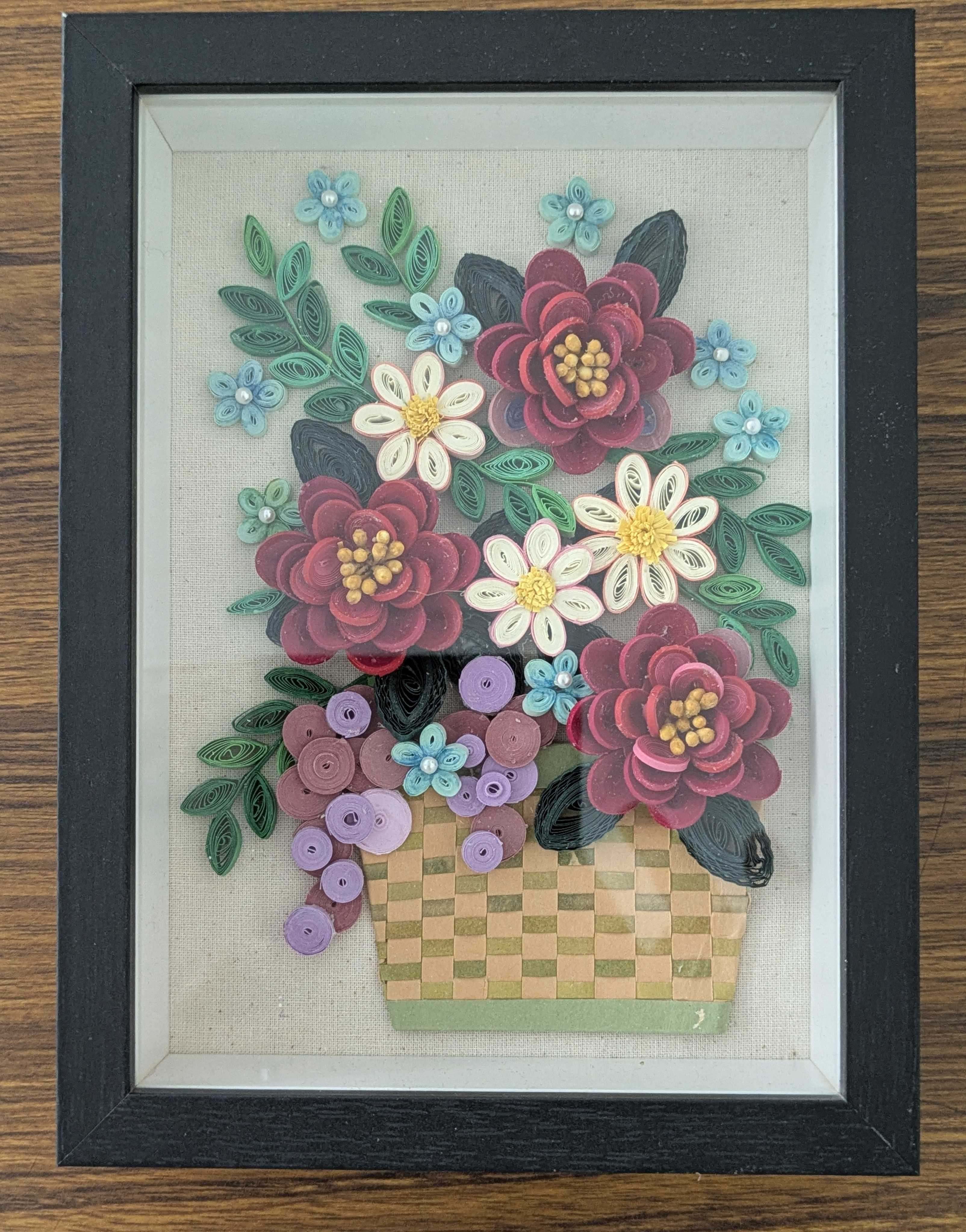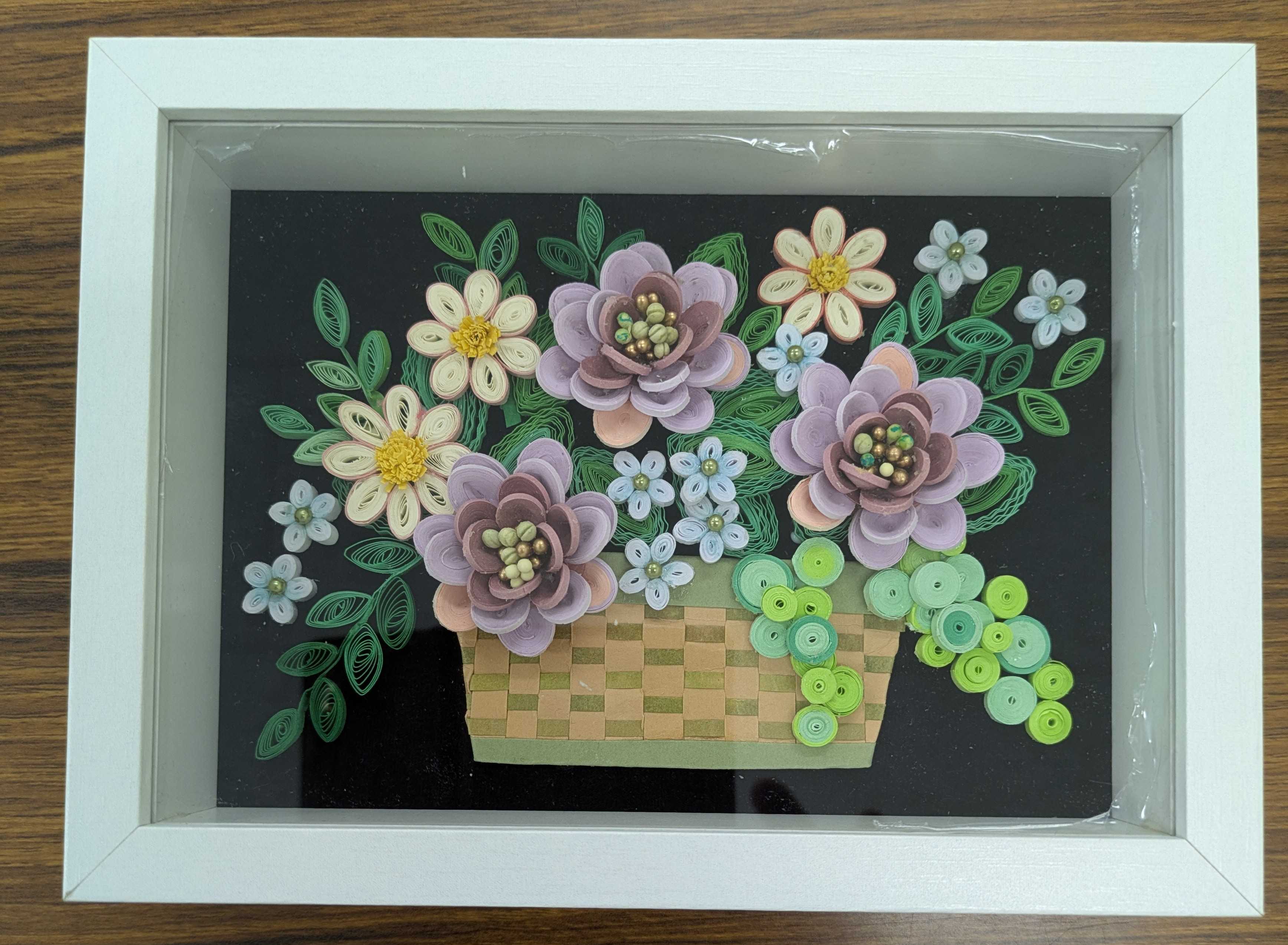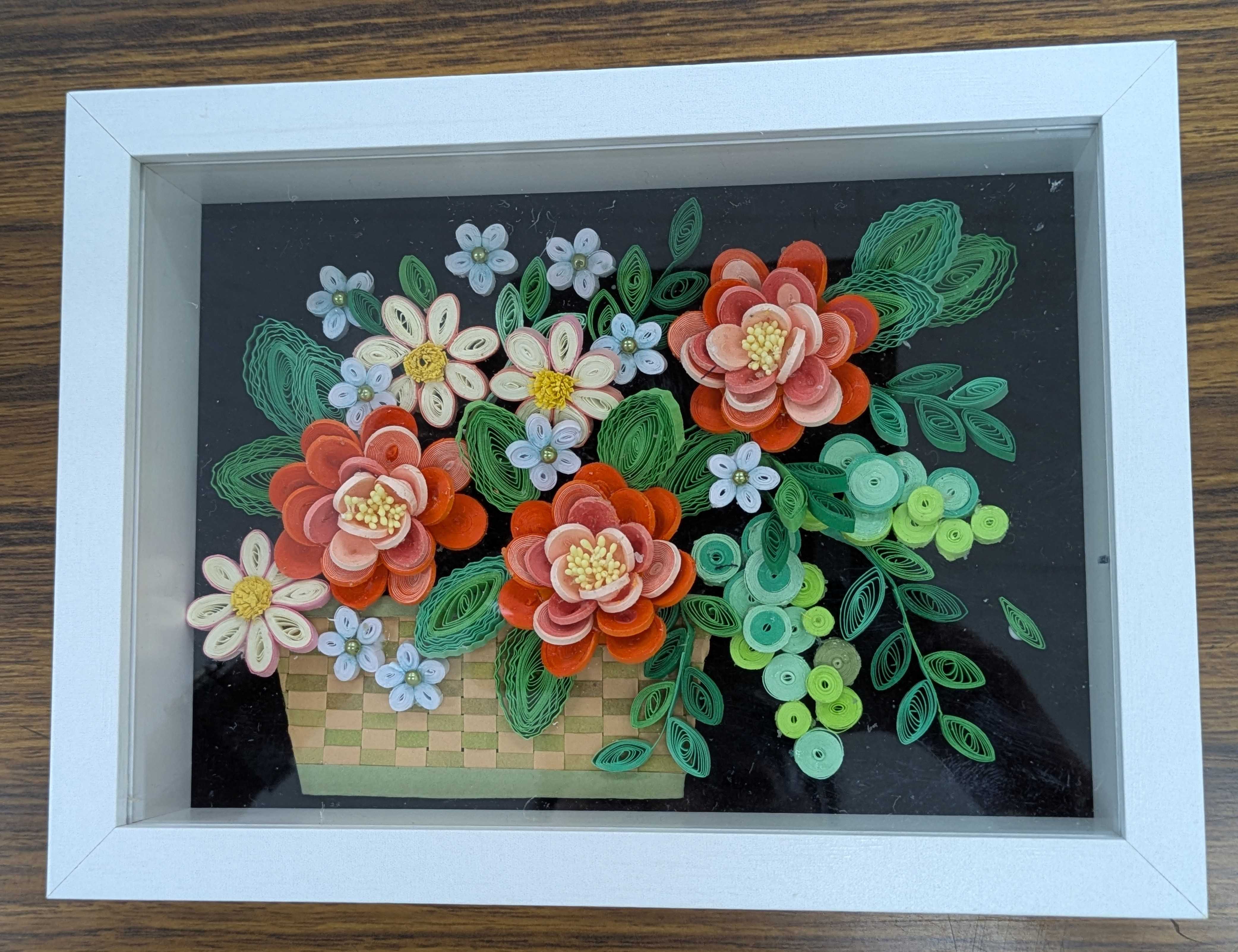 残暑見舞い申し上げます まだまだ熱い🔥位の暑さですネ。皆さん無理しないでクーラーを付けて、水分はちゃんと取って下さい。 今月のフラワーレッスンは額縁に入れたクイリングのアレンジを作りました。 可愛いカゴもクイリングペーパーで作りましたよ。 皆さん花の色がいろいろで、それに合わせて額やバックの色も変えています。 それぞれの作品が出来きました🤗