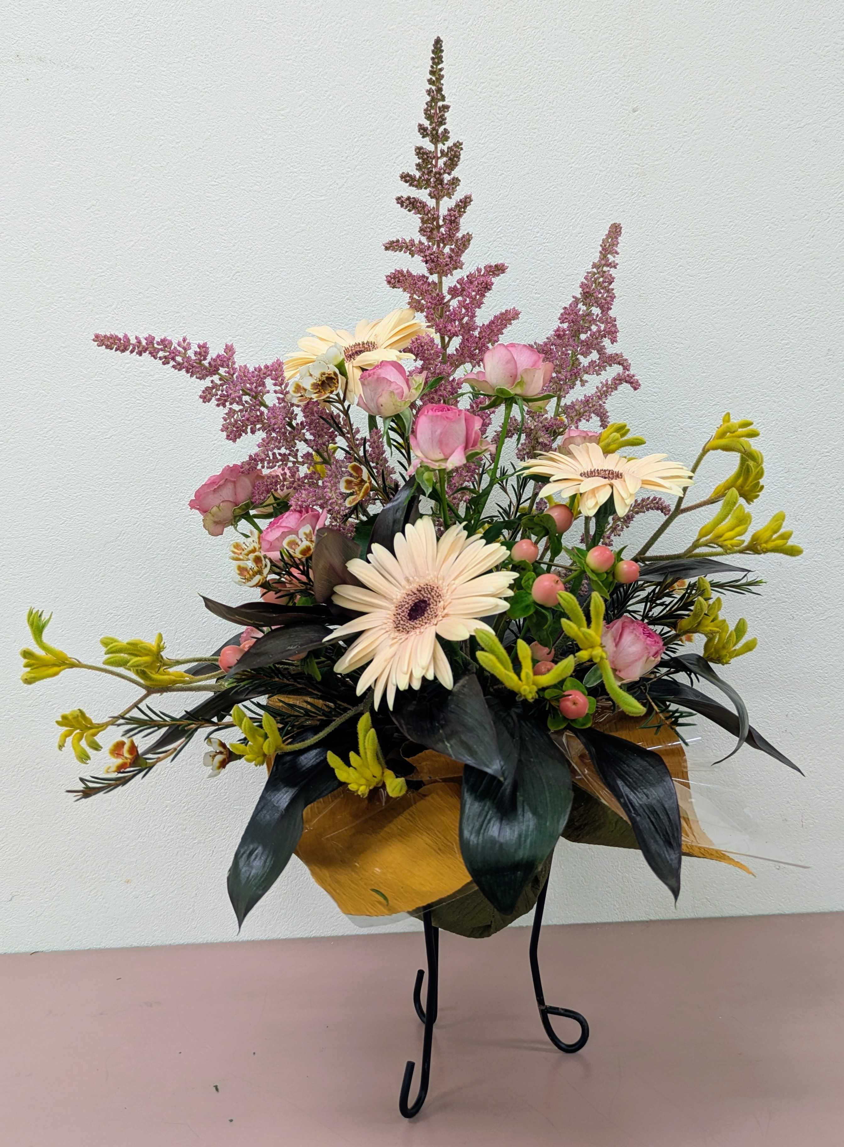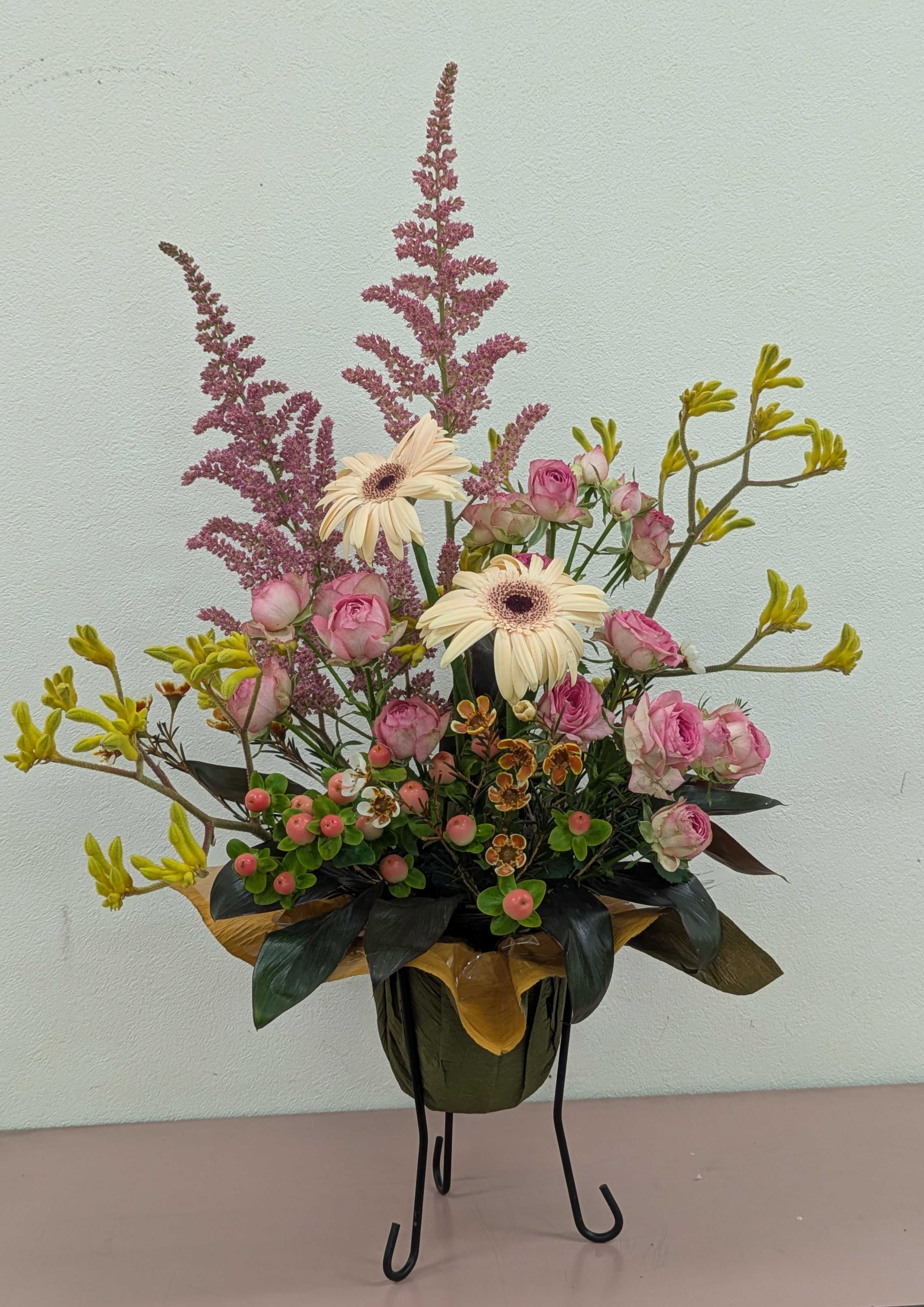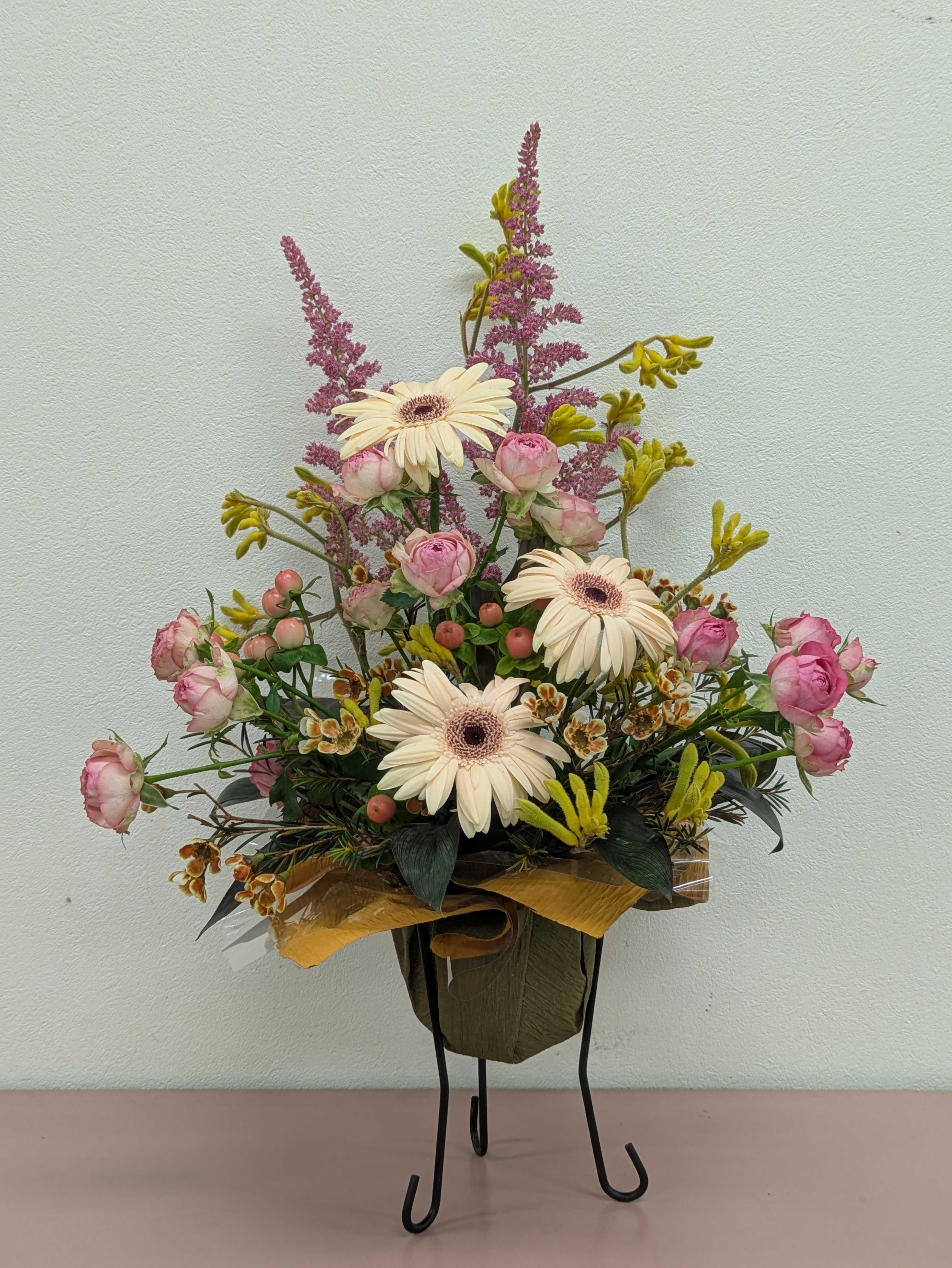 黄色系。カンガルーポー、薄い色のガーベラ、茶色のワックスフラワー。渋い色もありますよ、ピンクのアスチルペ、。でもちょと可愛いのも少し、可愛いビンクのスプレーバラ。それに実物はビンクのピペリカムも入れています。
