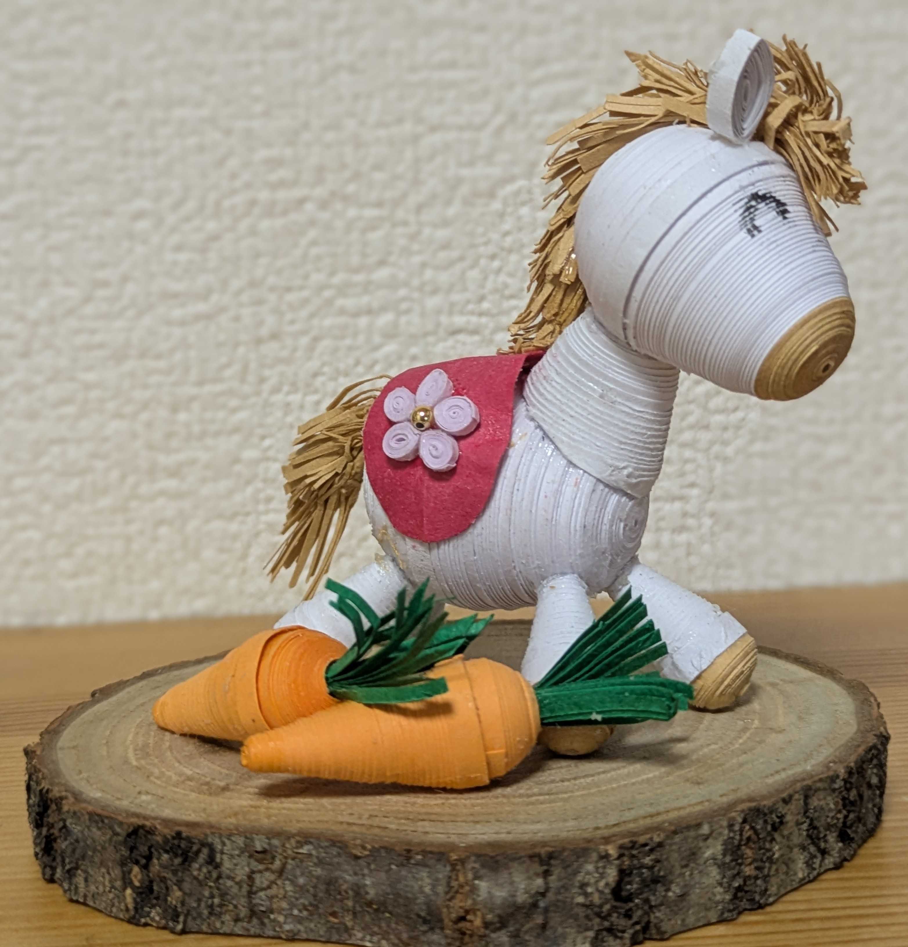 ちょっとしたお土産を持って行きますよね。お菓子ばかりではつまんないし、何かないかな? と言うことで、考えました、。そうだ☺️今年の干支は馬だから、クイリングで馬さんを作くろう。 あげる方は、ちょうど今年の干支だからぴったり💞 可愛い馬さんと大好きな人参🥕を作りました。