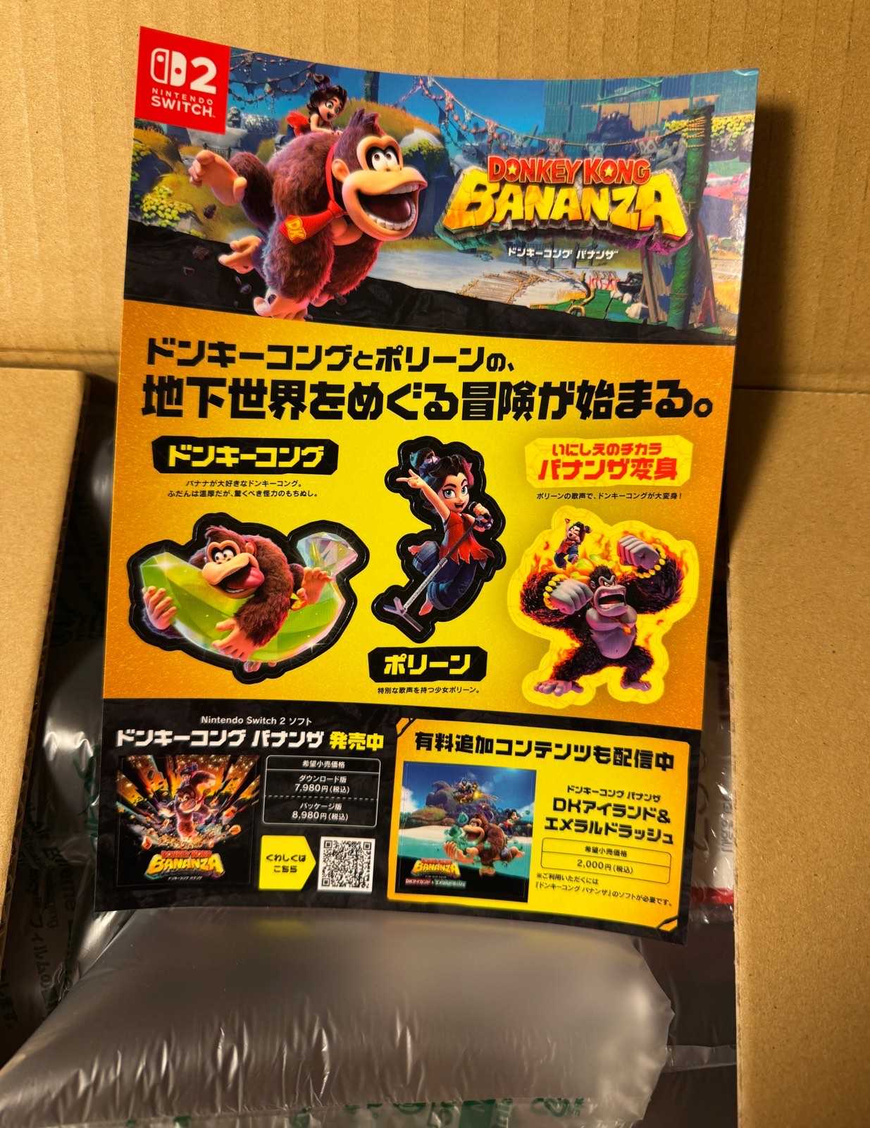 まいどどーも。 12月14日。 日曜日を迎えた ばんぶー です。 セルフ5連休継続中! 嬉しいですよね。 でも休みは明日までなんです。 そこから地獄の繁忙期体制。 年末休みまで一気に駆け抜けますよ。 さて、本日のネタはSwitch2。 過去のブログで激しい争奪戦の模様をお伝えしましたよね。 第一ラウンド 第五ラウンド 最終章 最終的には招待販売ってことで、希望者全員に行き渡ったようです。 ばんぶーさんは最後のチャンスで招待された、と。 12月20日までに発送されますよ、と。 正直、招待されてからの数ヶ月間ですっかり熱は冷めてます。 初代Switchで十分じゃん!? Switch2専用ソフトだって封印戦記しか買ってないし。←しっかり買ってるし 元々ブログのネタ用に外れ続けてくれてた方が美味しかっただけですって。 そして。 12月9日。 その時は突然やってきました。 ![]() 到☆着! さあここで宣伝だ。 何? Switch2を持っていないって?? ↑から注文すると良いんだぜ! 時々ゲリラ販売してるからな。 ばんぶーさんも時々チェックしていたんだぜ。 正直買えるタイミングもあったけど、招待されてるからやらなかったんだぞ。 欲しい人はマメに見るといいんだぜ! 続き。 帰宅後届いていた荷物。 ![]() 依頼主は任天堂。 怪しがる嫁氏。 「また変なもの買ったんでしょ!?」 という無言の圧力。 そこに ばんぶーさん の華麗な返し。 「株主優待じゃないかなぁ?」 速攻バレるウソ。 置き配厳禁の精密機器が優待の会社って何なん?? さすが世界の任天堂ってならなかったですね。 ![]() ごめんなさい。 Switch2買っちゃいました。 思い切り値段も書いてあります。 もう言い逃れはできません。 開き直って中身を確認しましょう。 ![]() バナンザのシール。 ばんぶーさん、ゴリラに興味はありません。 でもこ〜ゆ〜シール類って捨てられないんですよねぇ。 ![]() キャリングケース。 招待販売者限定みたい。 画面保護シートがついてるんでお得ですね。 ![]() SDカード。 microSD Expressって言う特殊な規格みたいです。 SAMSUNGよりSanDiskのが良かったんですが。 注文時に売り切れでした。 ![]() そして本体。 初代Switchの箱より小さいんですね。 画面は大きいのに不思議ですね。 そんなこんなで届いたSwitch2。 ここで ばんぶーさん の悪い癖が発動。 12月14日現在、めんどくさくてセットアップしていません。 何だったら箱から出してもいません。 このまま年末休みに突入してしまうんでしょうか? 乞うご期待。 セットアップ編に続く? ![]() さて、貴重な連休を満喫中です。 浮かれずテキトーに頑張りますか。 ほなほなノシ お気に入りの記事を「いいね!」で応援しよう