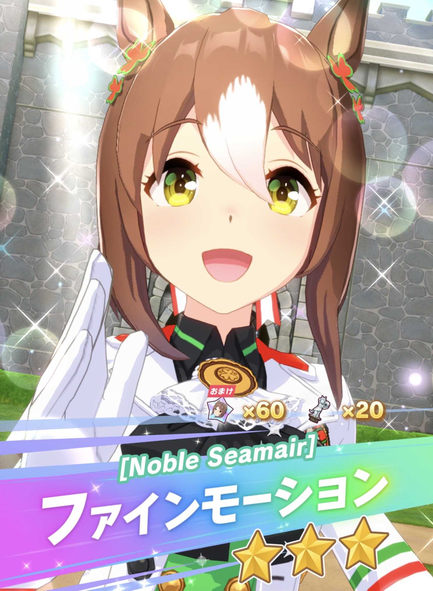 まいどどーも。 2月18日。 水曜日を迎えた ばんぶー です。 今日は定時ですよ! 嬉しいですよね。 このままずっと定時がいいですよね。 しかも明日は定休日ってオマケ付。 嬉しさ倍プッシュ! さて、本日のネタはウマ娘日記です。 毎月恒例のこれ、やっちゃいました。 ![]() ウインバリアシオン ごめんなさい、知りません。 特にこれと言って思い入れもない娘さんです。 ってか知ってる年代の馬って相当古いんだよなぁ。 ![]() たづなさん、相変わらずお美しい。 今月も★3メイクデビューガチャ第5Rのチケットが交換できました。 トレーナーメダルは1月中には貯まっていたんですよ。 相変わらず毎日コツコツ育成しています。←オートで ![]() チケットGETだぜ! ところで。 メイクデビューガチャシリーズって何気に人気コーナーなんですよ? ばんぶーさんのブログでよく読まれている記事なんです。 読んでくださってありがとうございます。 嬉しい限りです。 それじゃあたづなさん、今回もよろしくお願いします。 ナイスなSiriを拝ませてください! ![]() ナイスSiri! さあここで宣伝だ。 楽しい旅行はここから予約するんだぜ! ウマ娘もいいけど本物の馬を観に行くツアーなんてどーだい? どーせなら北海道の牧場に行きたいよな。 でも北海道って思っている以上に大きいんだぞ!? 一泊じゃ無理なんだぜ。 数泊分の宿の予約を↑から取ってくれると、ばんぶー感激なんだぞ。 続き。 相変わらずナイスなSiriでしたねぇ。 そして黒タイツがいい味出してますよね。 やっぱこれがないと始まりません。 ![]() さて、どんな娘さんをお迎えできるんでしょうか? 被ってもいいけど、新しい娘さん希望です。 ![]() クローバー!? これはあの娘さんしかいませんね。 ![]() 生足! 生足は生足でいいもんだよな。 若さの象徴みたいな感じでさ。 そしてお迎えできたのは・・・ ![]() ファインモーション 生誕 1999年1月27日 性別 牝 父 Danehill 母 Cocotte 主な勝ち鞍 2002秋華賞・エリ女など アイルランド生まれ。 主戦ジョッキーはレジェンド武豊。 これだけで活躍するの確定じゃないですか。 ちょうどこの年代からの馬って競馬から離れていた頃なんですよね。 だから思い入れ等はありません。 ![]() 被りだけどありがてぇ〜。 ってことで、★3メイクデビューガチャ第5R 2月編でした。 ここから3月に向けてトレーナーメダルを集めなおさねば。 温泉シナリオがよく分からんのでオート育成でメダルを集めます。 それでは来月またお会いしましょう。 さて、定時で嬉しい水曜日。 浮かれずテキトーに頑張りますか。 ほなほなノシ お気に入りの記事を「いいね!」で応援しよう