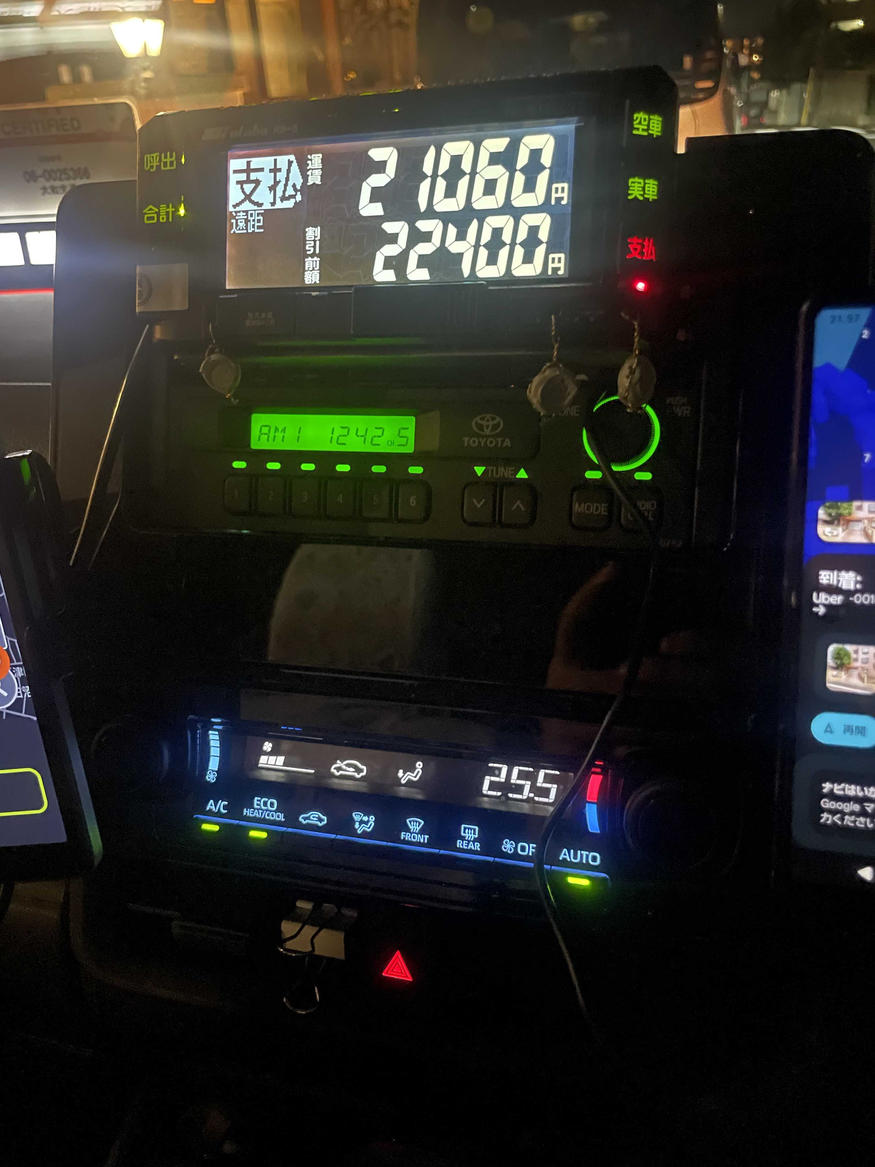 点呼20:20:40 2025年12月29月曜日1.20:35子ども医療センター北ー京急弘明寺駅 1400 DiDi2.20:45中島町ー蒔田公園 1400 GO3.21:15〜45横浜東口ーコットンハーバー 1000 16台4.21:45常盤町ー本宿町 5700 関内桜通5.22:25保土ヶ谷西口ーヒルサイドガーデン 1500 入れ食い6.22:55東戸塚すけまるー平戸町 2300 Uber予約7.23:30下倉田町ー戸塚東口 2400 Uber予約8.23:35旭町通りーレオパレス深谷町 2400 DiDi9.23:55サンデーいずみ野店ー上飯田町 1900 Uber10.0:10かもめパークファミマー大和市上和田 2000 GO11.0:30スナックマナーいずみ野団地ー阿久和団地 2500 GO12.1:05戸塚区役所前ー県・ドリームハイツ 3400 Uber13.3:00湘南台パーキングセンターー県ドリームハイツ 3000 Uber予約14.3:25鶴屋町ー城郷小ー白楽駅 5400 交差点15.4:05新横浜一丁目まいばすー佐江戸町 3500 GO16.4:50犬蔵2ーたまプラーザ南口 1200 Uber予約時間超過キャンセル16.5:10下市ヶ尾ー市ヶ尾東口 1200 DiDi17.5:25青葉台駅北口ー松風台 1200 GO18.5:45青葉区桜台ー青葉台駅 1700 Uber予約19.5:50青葉台駅ー桂台 900 入れ食い20.6:20鷺沼南パークホームズ参番館ーたまプラーザ南口 2300 Uber予約21.6:25たまプラーザ南口ー美しが丘4 800 1組22.6:55ファインレジデンス溝口ー二子玉川楽天クリムゾンハウス 2000 Uber予約23.7:30上小田中ククルマウンテンー武蔵小杉横須賀線口 2900 Uber予約24.7:45元住吉駅北口ー上小田中 2000 GO全241km 乗82km 24回 迎車18回 営収¥51090 Uber予約7件2025年12月タクシー売上,円11/21金曜日,4645022土曜日,4009023日曜日勤労感謝の日,5789024月曜日振替休日,4733026水曜日,3009027木曜日,2545028金曜日,4018029土曜日,5527030日曜日,3364012/1月曜日,445303水曜日,560705金曜日,427906土曜日,596208月曜日,4600010水曜日,4065011木曜日,4036012金曜日,7074013土曜日,6136014日曜日,4118015月曜日,5100017水曜日,4939018木曜日,5551019金曜日,6742020土曜日,71280合計,1174290