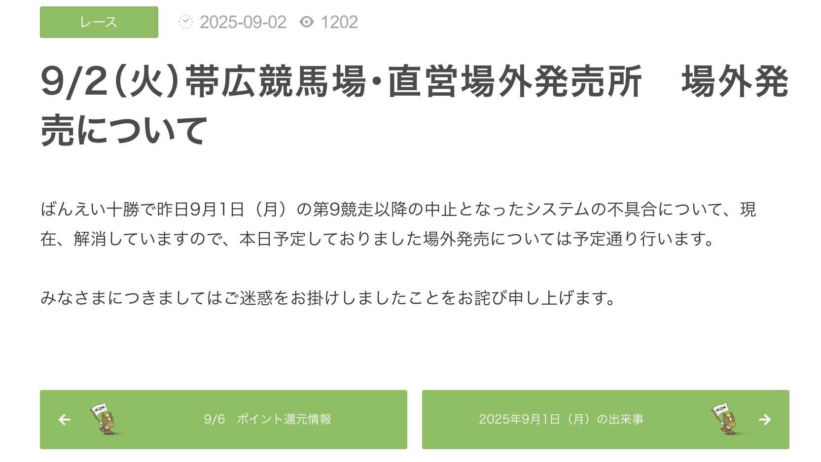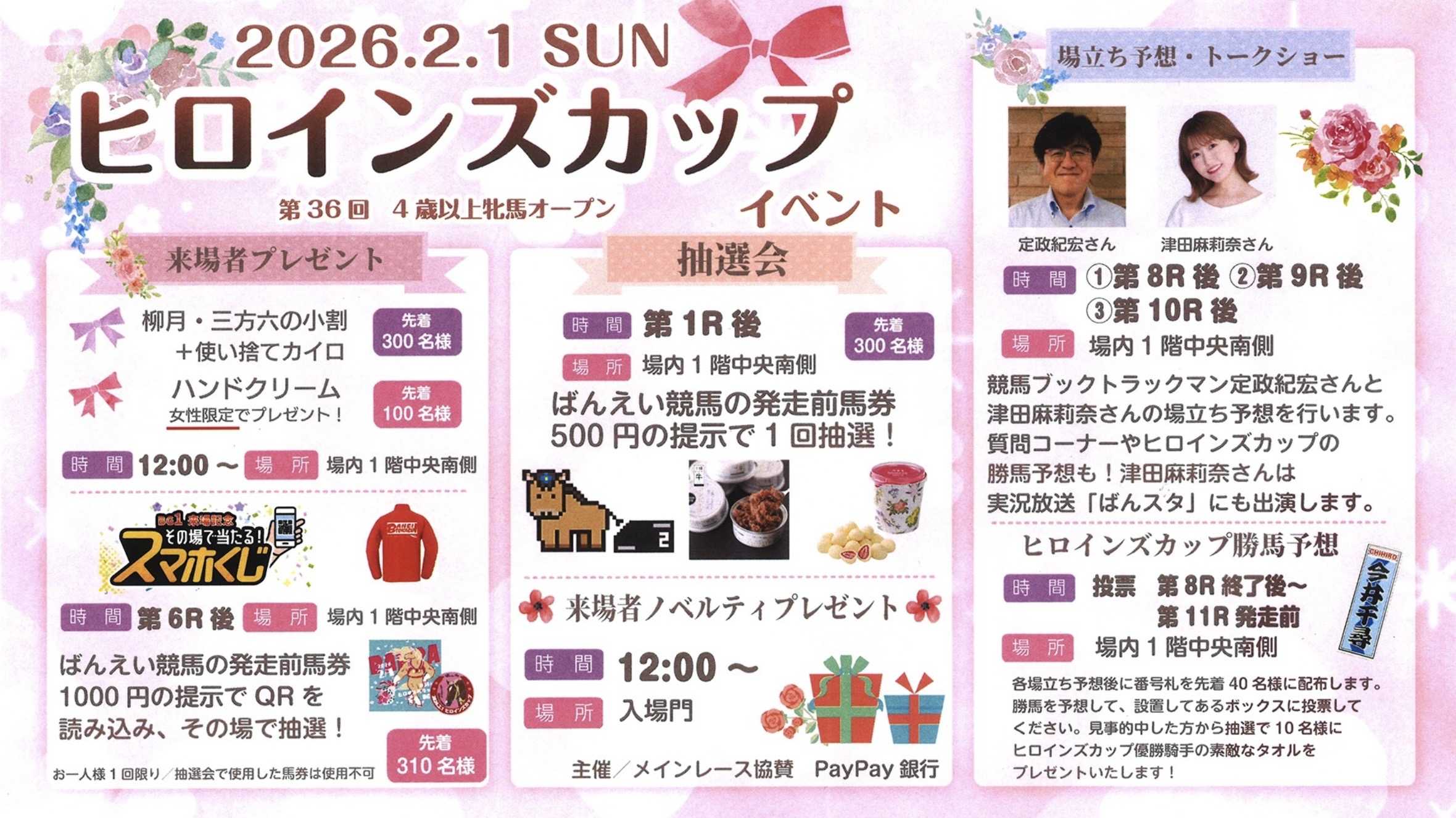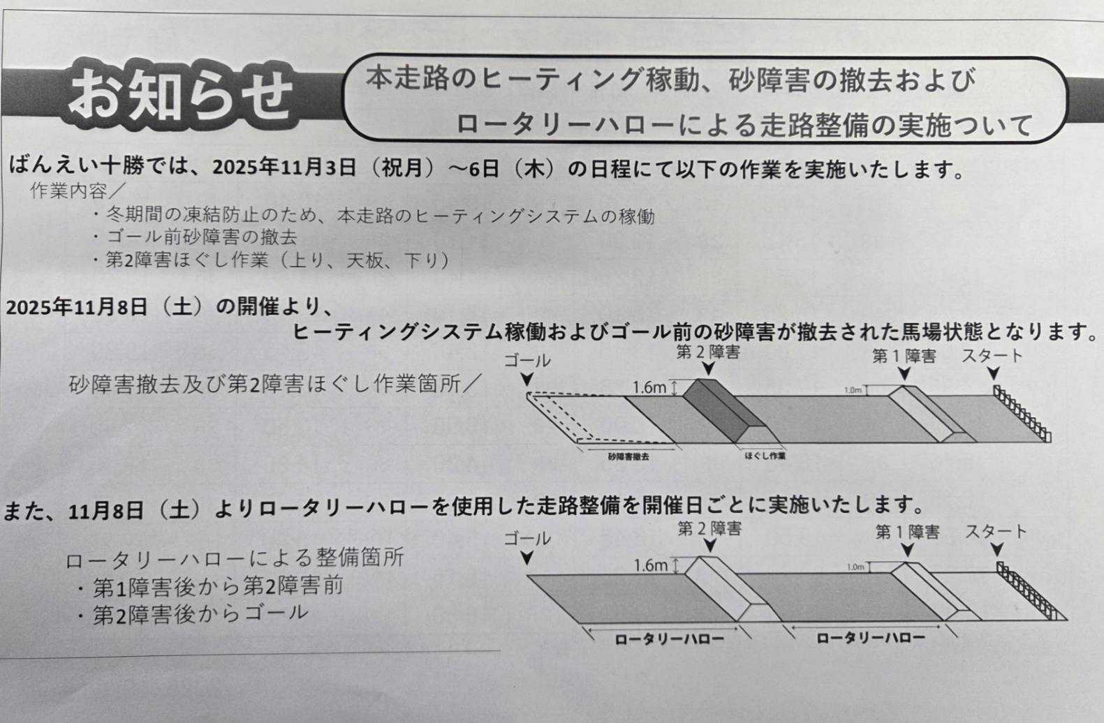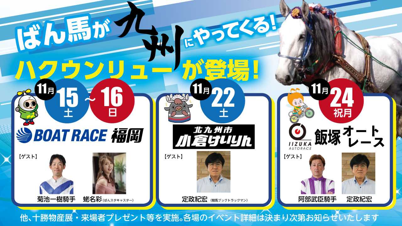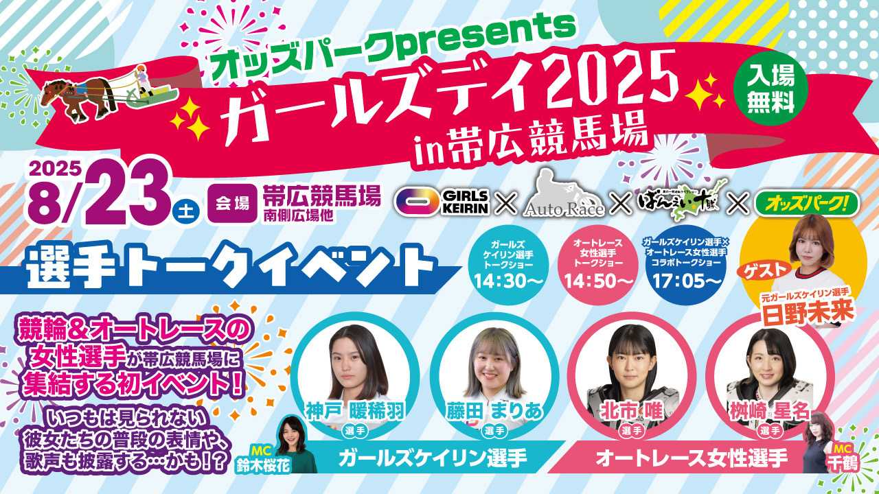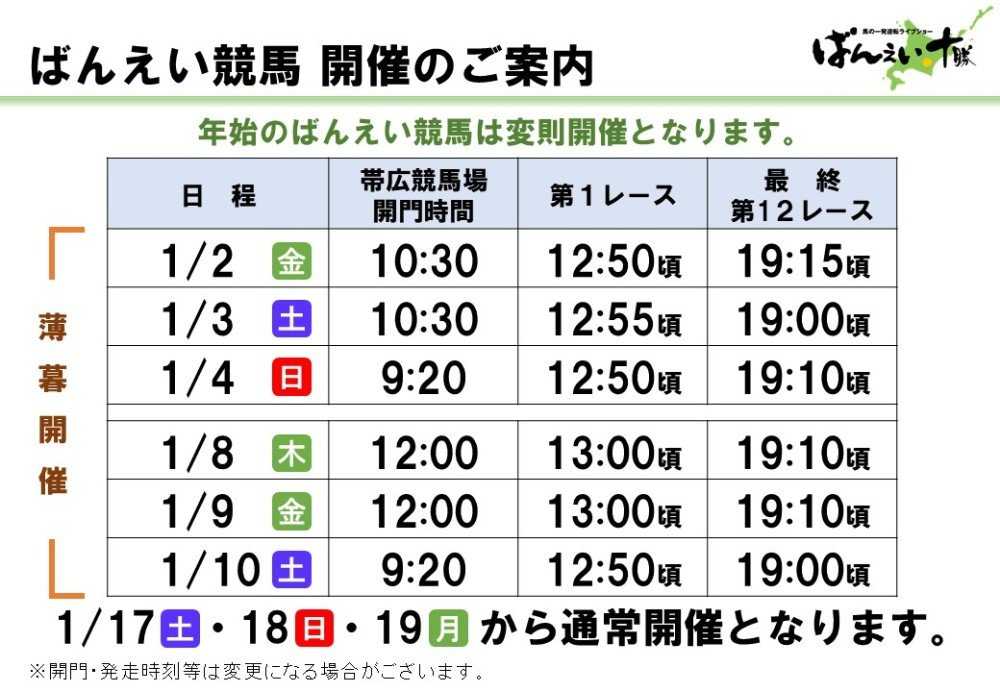 帯広記念の興奮が冷めやらぬまま1月3日の開催。メインレースには『第19回天馬賞』(BG1)が行われました。各馬がスタートするとフレイムファーストが少し抜け先行。しかし、ほぼ一団で先頭が頻繁に入れ替わりながら各馬が歩を進めてホクセイハリアーが抜け第2障害手前に来ます。後続も集まり息を入れますが、カフカは障害下で息を入れることなく登坂を開始します。その後、息を入れたホクセイハリアーが続きます。この両馬が2障害を苦戦する中、ライジンサンとリュウセイウンカイが2障害を降ります。この2頭の競り合いは終始ライジンサンが僅かに先頭で行きますがゴール前で脚色が鈍り、リュウセイウンカイが差してのゴール。重賞初制覇を3冠戦の最後、定量戦の天馬賞で成し遂げました。(主催者提供)(主催者提供)(主催者提供)リュウセイウンカイを管理する松井浩文(まつい・ひろふみ)調教師はメジロゴーリキで制した2019年以来2度目の「天馬賞」制覇。騎乗した西将太(にし・しょうた)騎手は初制覇となりました。お二人のインタビューはこちらからどうぞ。↓ ↓ ↓ ↓第19回天馬賞BG1リュウセイウンカイこれだけの上がり馬は中々お目にかかれないでしょう。今後は本格的に古馬との戦いで厳しい場面も増えるでしょうが、引き続きレースぶりに注目です。関係者の皆様、おめでとうございます。2着はゴール前で立て直してライジンサン。3着にはウルトラコタロウが入りました。さて、1月4日のメインレースには太平洋興発賞『ニューイヤーカップ』A1の一戦が行われました。勝ったのは断然人気のトワイチロでした。約2か月ぶりの出走。2障害で少しもたれましたが、一越で先頭で下りると後続を寄せ付けず圧勝でした。(主催者提供)これで11連勝としオープン入り。オープン馬を相手に今後はどんな戦いを見せてくれるのか楽しみです。2日~4日のお正月開催「ばんスタ」には多くのゲストの方にご出演を頂きました。ご紹介します。2日の第3レースには帯広駅前冬限定リンクのPRで「TOKACHI ICE PARK PLUS」から実行委員長の大野福公さんにお越しいただきました。街の中にスケートリンクがあり、スケートやカーリングで遊べるTOKACHI ICE PARK PLUS。手ぶらで行っても道具など貸してくれるそうです。スケートは大人はレンタル料1回1,000円が必要ですが、高校生以下は無料!!夜は光のライトアップもされているようで、子どもから大人まで楽しめそうです。ぜひ皆さんで駅前で冬遊びを楽しみましょう!!↓ ↓ ↓ ↓TOKACHI ICE PARK PLUS帯広記念でメムロボブサップが古馬重賞完全制覇を決めた後、元競輪選手で3度の飯よりばんえい大好き!日野未来さんが登場!!後半10レース、11レース、12レースの3レース予想してくださいました。翌日は場内で場立ちイベントに参加。今年も引き続き、ばんえいの盛り上げお願いします。盛り上げて頂いていると言えば、スキンヘッドカメラの岡本さんシモさんも。ばんスタには3日の日にご出演を頂きました。今年もばんえい競馬のPRを宜しくお願いします。