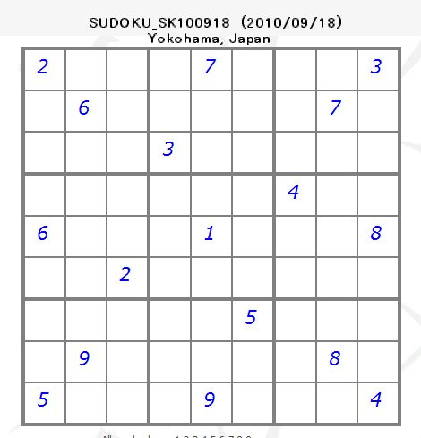 数独は微妙で奥深い。自作の数独問題には無数(数万?数十万?)の正解が存在するようです。フィンランドの科学者Arto Inkala博士が考案した数独プログラム「9 by 9 Sudoku Solver」を利用して、「解」を求めてみる(Solve)と正解が1個表示されます。果たして正解が何個あるのかチェック(Check Unique Solution)してみると、余りにも多すぎて制限時間(30秒)内に割り出しきれません。そこで、少し変化させた次の数独問題は、正解が何と5,870個も存在すると判定されました。 更に少し変化させた次の数独問題は、正解が70個存在すると判定されました。もう少し変化させた次の数独問題は、正解が4個存在すると判定されました。そして、更に少し変化させた次の数独問題は、正解が1個だけ存在すると判定されました。問題の難易度は、上記のいずれもが難題(Hard)と判定されました。