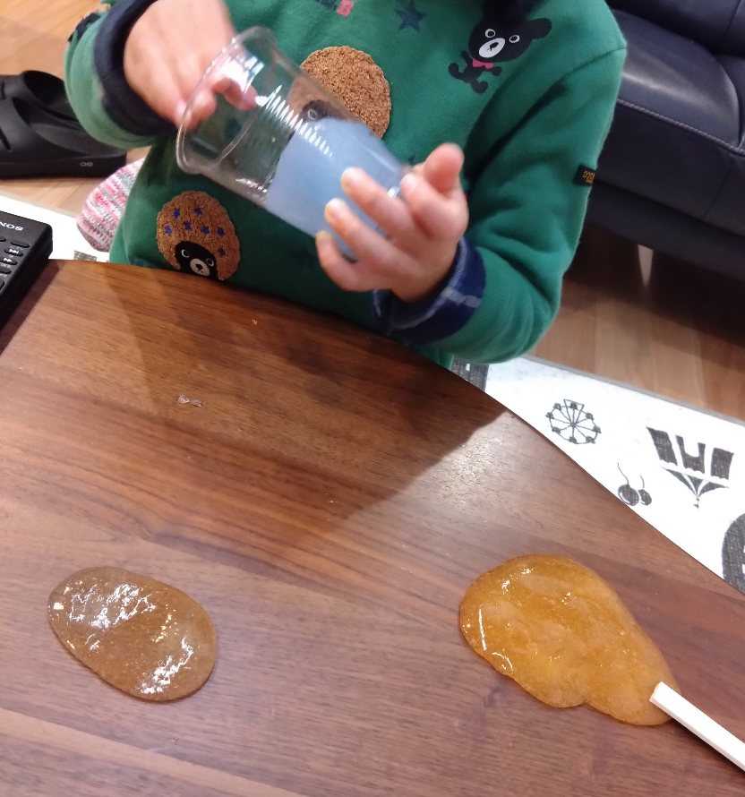 ホウ砂水溶液を入れすぎると固まりすぎてねばーっとならないので、ちょっと入れてはかき混ぜて、を繰り返しながら好みの粘り具合にします。