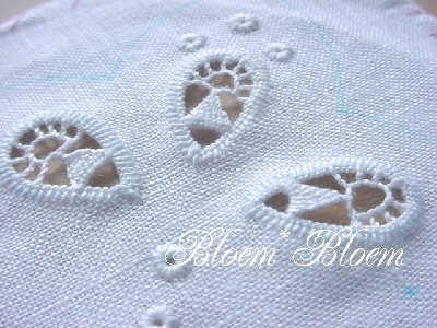ずっとしてみたかったヒーダボー刺しゅう♪とりあえず完成しました^^しずく形の中のかがりが揃わなかったり今後の課題は色々あるけれど・・・楽しくステッチできました♪ホワイトワーク☆やっぱ大好きです♪参考にしたのはこちら↓