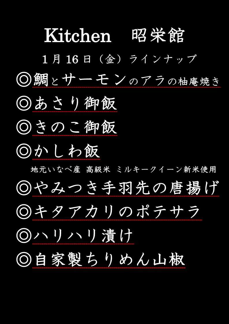 皆様 おはようございます! 本日は、2026年 1月16日 金曜日。 Kitchen昭…
