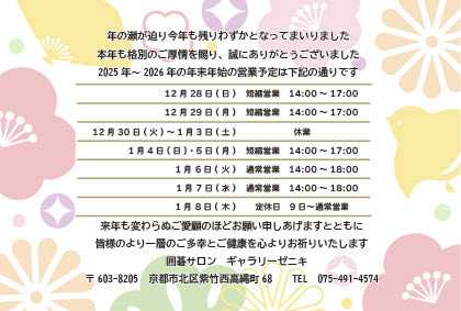 久しぶりの投稿でございます。年末年始の営業は次の通りです。今年は仕事納めが早いよう…