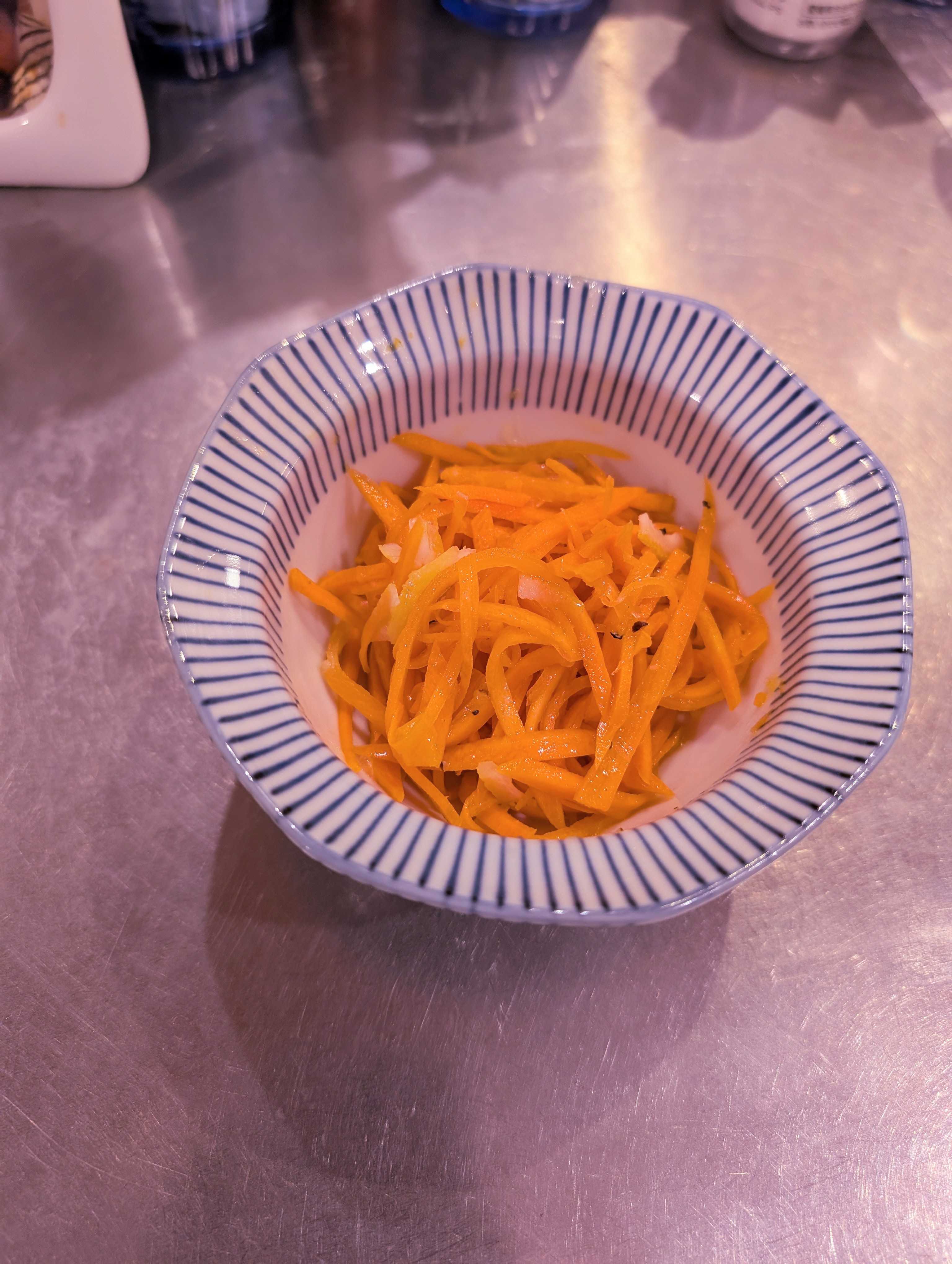 ![]() ![]() 人参のレモンマリネ 用意するもの ・冷凍したレモン 流水に30秒ほどあてて少し溶かす ・大きい人参3本 ・美味しいオリーブオイル 大さじ5杯 ・ハチミツ大さじ5杯 きび砂糖なら4杯上白糖は2杯 ・自然塩小さじ1杯 ・ニンニク一欠片 すり下ろし ・ブラックペッパー適宜 多めが美味しい 調味類をボールに入れて 冷凍レモンを串切りにし、フォークで種を出し スプーンで果肉をそぎ取り出してボールへ 皮は、袋をスプーンでこそぎ落として 皮だけ細かくきざんでボールへ 全体を混ぜて好みの塩加減、甘さにする 人参を千切りにして、ボールに加え数分ごとに混ぜ 15分程すると、出来上がり 冷蔵庫で5日くらい大丈夫で〜す スペイン料理の人参マリネの応用編ってとこです。 お気に入りの記事を「いいね!」で応援しよう